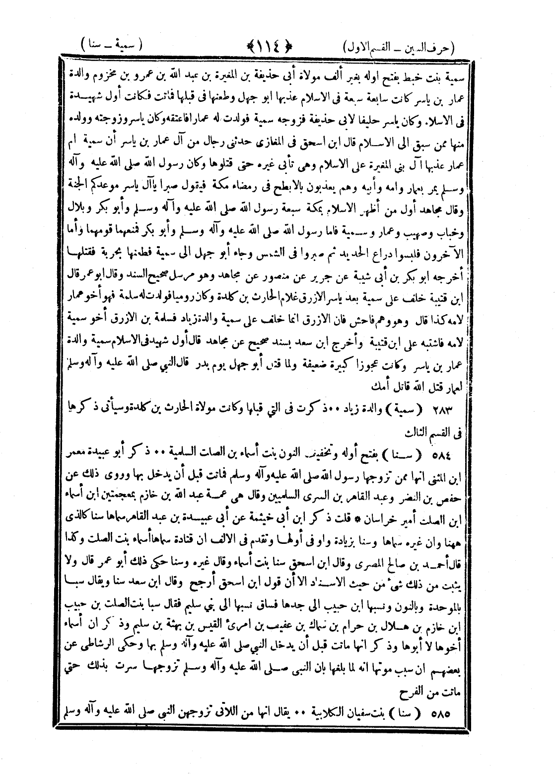 <114> سمية بنت خبط بفتح أوله بغير ألف مولاة أبي حذيفة بن المغيرة بن عبد الله بن عمرو بن مخزوم والدة عمار بن ياسر كانت سابعة سبعة في الإسلام عذبها أبو جهل وطعنها في قبلها فماتت فكانت أول شهيدة في الإسلام وكان ياسر حليفا لأبي حذيفة فزوجه سمية فولدت عمارا فأعتقه وكان ياسر وزوجته وولده منها ممن سبق إلى الإسلام قال بن إسحاق في المغازي حدثني رجال من آل عمار بن ياسر أن سمية أم عمار عذبها آل بني المغيرة على الإسلام وهي تأبى غيره حتى قتلوها وكان رسول الله صلى الله عليه وسلم يمر بعمار وأمه وأبيه وهم يعذبون بالأبطح في رمضاء مكة فيقول صبرا يا آل ياسر موعدكم الجنة وقال مجاهد أول من أظهر الإسلام بمكة سبعة رسول الله صلى الله عليه وسلم وأبو بكر وبلال وخباب وصهيب وعمار وسمية فأما رسول الله صلى الله عليه وسلم وأبو بكر فمنعهما قومهما وأما الآخرون فألبسوا أدراع الحديد ثم صهروا في الشمس وجاء أبو جهل الى سمية فطعنها بحربة فقتلها أخرجه أبو بكر بن أبي شيبة عن جرير عن منصور عن مجاهد وهو مرسل صحيح السند وقال أبو عمر قال بن قتيبة خلف على سمية بعد ياسر الأزرق غلام الحارث بن كلدة وكان روميا فولدت له سلمة فهو أخو عمار لأمه كذا قال وهو وهم فاحش فإن الأزرق إنما خلف على سمية والدة زياد فسلمة بن الأزرق أخو سمية لأمه فاشتبه على بن قتيبة وأخرج بن سعد بسند صحيح عن مجاهد قال أول شهيد في الإسلام سمية والدة عمار بن ياسر وكانت عجوزا كبيرة ضعيفة ولما قتل أبو جهل يوم بدر قال النبي صلى الله عليه وسلم لعمار قتل الله قاتل أمك سمية والدة زياد ذكرت في التي قبلها وكانت مولاة الحارث بن كلدة وسيأتي ذكرها في القسم الثالث سنا بفتح أوله وتخفيف النون بنت أسماء بن الصلت السلمية ذكر أبو عبيدة معمر بن المثنى أنها ممن تزوجها رسول الله صلى الله عليه وسلم فماتت قبل أن يدخل بها وروى ذلك عن حفص بن النضر وعبد القاهر بن السري السلميين وقال هي عمة عبد الله بن خازم بمعجمتين بن أسماء بن الصلت أمير خراسان قلت ذكر بن أبي خيثمة عن أبي عبيدة بن عبد القاهر سماها سنا كالذي ههنا وأن غيره سماها وسنا بزيادة واو في أولها وتقدم في الألف أن قتادة سماها أسماء بنت الصلت وكذا قال أحمد بن صالح المصري وقال بن إسحاق سنا بنت أسماء وقال غيره وسنا حكى ذلك أبو عمر قال ولا يثبت من ذلك شيء من حيث الإسناد إلا أن قول بن إسحاق أرجح وقال بن سعد سنا ويقال سبا بالموحدة وبالنون ونسبها بن حبيب الى جدها فساق نسبها الى بني سليم فقال سنا بنت الصلت بن حبيب بن حازم بن هلال بن حرام بن سماك بن عفيف بن امرئ القيس بن بهثة بن سليم وذكر أن أسماء أخوها لا أبوها وذكر أنها ماتت قبل أن يدخل النبي صلى الله عليه وسلم بها وحكى الرشاطي عن بعضهم أن سبب موتها أنه لما بلغها بأن النبي صلى الله عليه وسلم تزوجها سرت بذلك حتى ماتت من الفرح سنا بنت سفيان الكلابية يقال إنها من اللاتي تزوجهن النبي صلى الله عليه وسلم §