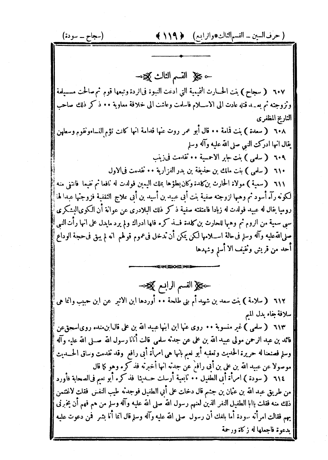 <119> القسم الثالث سجاح بنت الحارث التميمية التي ادعت النبوة في الردة وتبعها قوم ثم صالحت مسيلمة وتزوجته ثم بعد قتله عادت الى الإسلام فأسلمت وعاشت الى خلافة معاوية ذكر ذلك صاحب التاريخ المظفري سعدة بنت قمامة قال أبو عمر روت عنها قدامة أنها كانت تؤم النساء وتقوم وسطهن يقال إنها أدركت النبي صلى الله عليه وسلم سلمى بنت جابر الأحمسية تقدمت في زينب سلمى بنت مالك بن حذيفة بن بدر الفزارية تقدمت في الأول سمية مولاة الحارث بن كلدة وكان يطؤها بملك اليمين فولدت له نافعا ثم نفيعا فانتفى منه لكونه رآه أسود ثم وهبها لزوجته صفية بنت أبي عبيد بن أسيد بن أبي علاج الثقفية فزوجتها عبدا لها روميا يقال له عبيد فولدت له زيادا فأعتقته صفية ذكر ذلك البلاذري عن عوانة ان الكواء اليشكري سبى سمية من الروم ثم وهبها للحارث بن كلدة فذكره فلها إدراك ولم يرد ما يدل على أنها رأت النبي صلى الله عليه وسلم في حالة إسلامها لكن يمكن أن تدخل في عموم قولهم إنه لم يبق في حجة الوداع أحد من قريش وثقيف إلا أسلم وشهدها القسم الرابع سلامة بنت سعد بن شهيد أم بني طلحة أوردها بن الأثير عن بن حبيب وإنما هي سلافة بفاء بدل الميم سلمى غير منسوبة روى عنها بن ابنها عبيد الله بن علي قال بن منده روى إسحاق عن فائد بن عبد الرحمن مولى عبيد الله بن علي مولاه عن جدته سلمى قالت أتانا رسول الله صلى الله عليه وسلم فصنعنا له حريرة الحديث وتعقبه أبو نعيم بأنها هي امرأة أبي رافع وقد تقدمت وساق الحديث موصولا عن عبيد الله بن علي بن أبي رافع عن جدته أنها أخبرته فذكره وهو كما قال سودة امرأة أبي الطفيل تابعية أرسلت حديثا فذكره أبو نعيم في الصحابة فأورد من طريق عبد الله بن عثمان بن خثيم قال دخلت على أبي الطفيل فوجدته طيب النفس فقلت لأغتنمن ذلك منه فقلت يا أبا الطفيل النفر الذين لعنهم رسول الله صلى الله عليه وسلم من هم فهم أن يخبرني بهم فقالت امرأته سودة أما بلغك أن رسول الله صلى الله عليه وسلم قال إنما أنا بشر فمن دعوت عليه بدعوة فاجعلها له زكاة ورحمة §