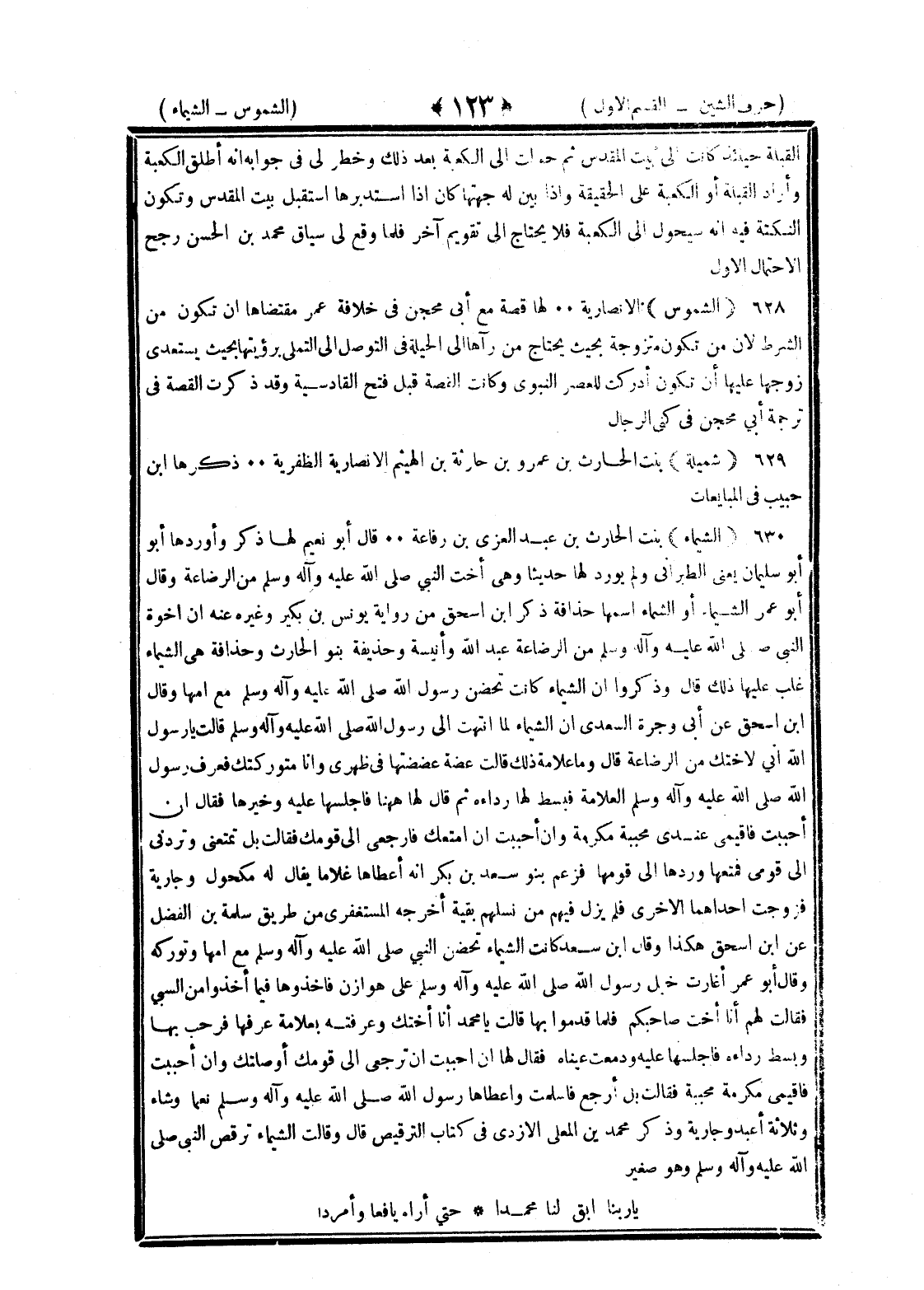<123> القبلة حينئذ كانت إلى بيت المقدس ثم حولت إلى الكعبة بعد ذلك وخطر لي في جوابه أنه أطلق الكعبة وأراد القبلة أو الكعبة على الحقيقة وإذا بين له جهتها كان إذا استدبرها استقبل بيت المقدس وتكون النكتة فيه أنه سيحول إلى الكعبة فلا يحتاج تقويم آخر فلما وقع لي سياق محمد بن الحسن رجح الاحتمال الأول الشموس الأنصارية لها قصة مع أبي محجن في خلافة عمر مقتضاها أن تكون من الشرط لان من تكون متزوجة بحيث يحتاج من رآها إلى الحيلة في التوصل إلى التملي برؤيتها بحيث يستعدي زوجها عليها أن تكون أدركت العصر النبوي وكانت القصة قبل فتح القادسية ذكرت القصة في ترجمة أبي محجن في كنى الرجال شميلة بنت الحارث بن عمرو بن حارثة بن الهيثم الأنصارية الظفرية ذكرها بن حبيب في المبايعات الشيماء بنت الحارث بن عبد العزى بن رفاعة قال أبو نعيم لها ذكر وأوردها أبو سليمان يعني الطبراني ولم يورد لها حديثا وهي أخت النبي صلى الله عليه وسلم من الرضاعة وقال أبو عمر الشيماء أو الشماء اسمها حذافة ذكر بن إسحاق من رواية يونس بن بكير وغيره عنه إن إخوة النبي صلى الله عليه وسلم من الرضاعة عبد الله وأنيسة وحذيفة بنو الحارث وحذافة هي الشيماء غلب عليها ذلك قال وذكروا أن الشيماء كانت تحضن رسول الله صلى الله عليه وسلم مع أمها وقال بن إسحاق عن أبي وجزة السعدي إن الشيماء لما انتهت إلى رسول الله صلى الله عليه وسلم قالت يا رسول الله إني لأختك من الرضاعة قال وما علامة ذلك قالت عضة عضضتها في ظهري وأنا متوركتك فعرف رسول الله صلى الله عليه وسلم العلامة فبسط لها رداءه ثم قال لها هاهنا فأجلسها عليه وخيرها فقال إن أحببت فأقيمي عندي محببة مكرمة وإن أحببت أن أمتعك فارجعي إلى قومك فقالت بل تمتعني وتردني إلى قومي فمتعها وردها إلى قومها فزعم بنو سعد بن بكر أنه أعطاها غلاما يقال له مكحول وجارية فزوجت إحداهما الآخر فلم يزل فيهم من نسلهم بقية أخرجه المستغفري من طريق سلمة بن الفضل عن بن إسحاق هكذا وقال بن سعد كانت الشيماء تحضن النبي صلى الله عليه وسلم مع أمها وتوركه وقال أبو عمر أغارت خيل رسول الله صلى الله عليه وسلم على هوازن فأخذوها فيما أخذوا من السبي فقالت لهم أنا أخت صاحبكم فلما قدموا بها قالت يا محمد أنا أختك وعرفته بعلامة عرفها فرحب بها وبسط رداءه فأجلسها عليه ودمعت عيناه فقال لها إن أحببت أن ترجعي إلى قومك أوصلتك وإن أحببت فأقيمي مكرمة محببة فقالت بل أرجع فأسلمت وأعطاها رسول الله صلى الله عليه وسلم نعما وشاء وثلاثة أعبد وجارية وذكر محمد بن المعلى الأزدي في كتاب الترقيص قال وقالت الشيماء ترقص النبي صلى الله عليه وسلم وهو صغير يا ربنا أبق لنا محمدا حتى أراه يافعا وأمردا §