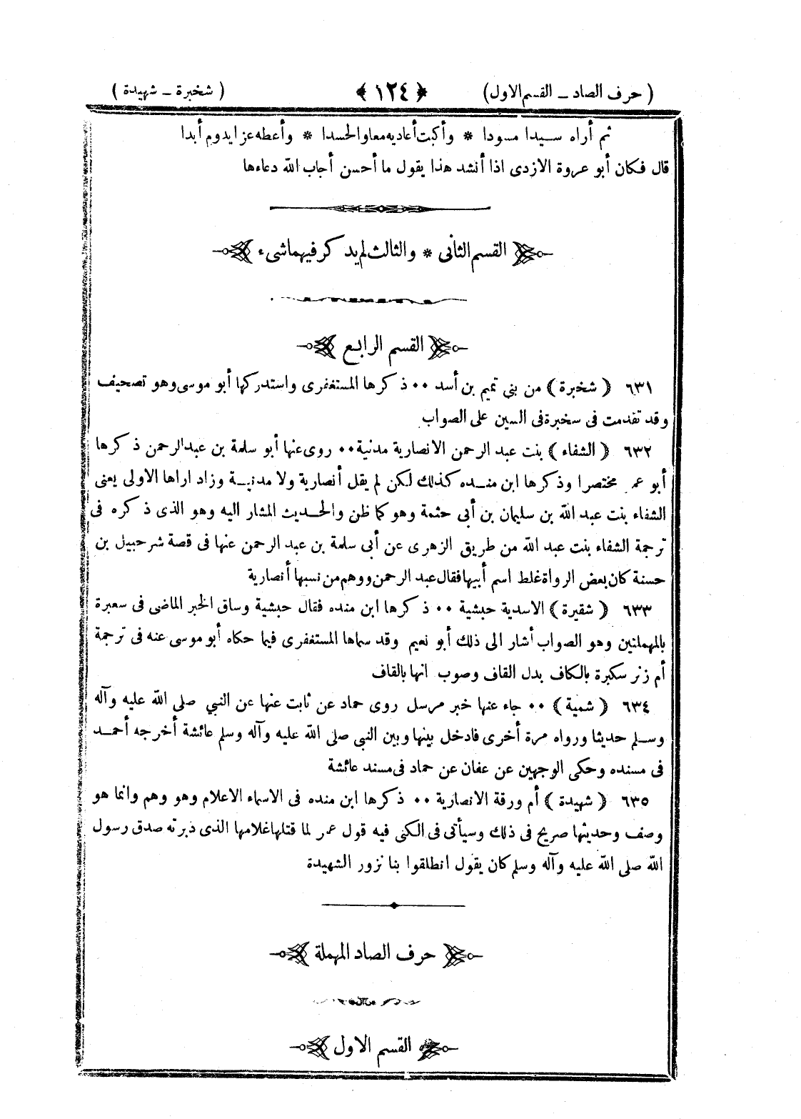 <124> ثم أراه سيدا مسودا واكبت أعاديه معا والحسدا وأعطه عزا يدوم أبدا قال فكان أبو عروة الأزدي إذا أنشد هذا يقول ما أحسن ما أجاب الله دعاءها القسم الثاني خال وكذا القسم الثالث لم يذكر فيهما شيء القسم الرابع شخبرة من بني تميم بن أسد ذكرها المستغفري واستدركها أبو موسى وهو تصحيف وقد تقدمت في سخبرة في السين على الصواب الشفاء بنت عبد الرحمن الأنصارية مدنية روى عنها أبو سلمة بن عبد الرحمن ذكرها أبو عمر مختصرا وذكرها بن منده كذلك لكن لم يقل أنصارية ولا مدنية وزاد أراها الأولى يعني الشفاء بنت عبد الله بن سليمان بن أبي حثمة وهو كما ظن والحديث المشار إليه هو الذي ذكره في ترجمة الشفاء بنت عبد الله من طريق الزهري عن أبي سلمة بن عبد الرحمن عنها في قصة شرحبيل بن حسنة كأن بعض الرواة غلط في اسم أبيها فقال عبد الرحمن ووهم من نسبها أنصارية شقيرة الأسدية حبشية ذكرها بن منده فقال حبشية وساق الخبر الماضي في سعيرة بالمهملتين وهو الصواب أشار إلى ذلك أبو نعيم وقد سماها المستغفري فيما حكاه أبو موسى عنه في ترجمة أم زفر شكيرة بالكاف بدل القاف وصوب أنها بالقاف شمية جاء عنها خبر مرسل روى حماد عن ثابت عنها عن النبي صلى الله عليه وسلم حديثا ورواه مرة أخرى فأدخل بينها وبين النبي صلى الله عليه وسلم عائشة أخرجه أحمد في مسنده وحكى الوجهين عن عفان عن حماد في مسند عائشة شهيدة أم ورقة الأنصارية ذكرها بن منده في الأسماء الأعلام وهو وهم وإنما هو وصف وحديثها صريح في ذلك وسيأتي في الكنى فيه قول عمر لما قتلها غلامها الذي دبرته صدق رسول الله صلى الله عليه وسلم كان يقول انطلقوا بنا نزور الشهيدة