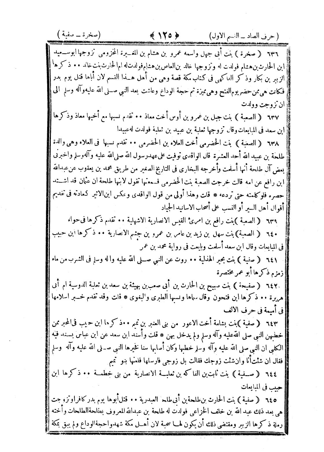 <125> صخرة بنت أبي جهل واسمه عمرو بن هشام بن المغيرة المخزومي تزوجها أبو سعيد بن الحارث بن هشام فولدت له وتزوجها خالد بن العاص بن هشام فولدت له أم الحارث بنت خالد ذكرها الزبير بن بكار وذكر لها الفاكهي في كتاب مكة قصة وهي من أهل هذا القسم لأن أباها قتل يوم بدر فكانت هي ممن حضر يوم الفتح وهي مميزة ثم حجة الوداع وعاشت بعد النبي صلى الله عليه وسلم إلى أن تزوجت وولدت الصعبة بنت جبل بن عمرو بن أوس أخت معاذ تقدم نسبها مع أخيها معاذ وذكرها بن سعد في المبايعات وقال تزوجها ثعلبة بن عبيد بن ثعلبة فولدت له عبيدا الصعبة بنت الحضرمي أخت العلاء بن الحضرمي تقدم نسبها في العلاء وهي والدة طلحة بن عبيد الله أحد العشرة قال الواقدي توفيت على عهد رسول الله صلى الله عليه وسلم وأخبرني بعض آل طلحة أنها أسلمت وأخرجه البخاري في التاريخ الصغير من طريق محمد بن يعقوب عن عبد الله بن رافع عن أمه قالت خرجت الصعبة بنت الحضرمي فسمعتها تقول لابنها طلحة إن عثمان قد اشتد حصره فلو كلمته حتى تردعه قلت وهذا أولى من قول الواقدي وعكس بن الأثير كعادته في تقديم أقوال أهل السير أو النسب على أصحاب الأسانيد الجياد الصعبة بنت رافع بن امرئ القيس الأنصارية الأشهلية تقدم ذكرها في حواء الصعبة بنت سهل بن زيد بن عامر بن عمرو بن جشم الأنصارية ذكرها بن حبيب في المبايعات وقال بن سعد أسلمت وبايعت في رواية محمد بن عمر صفية بنت بجير الهذلية روت عن النبي صلى الله عليه وسلم في الشرب من ماء زمزم ذكرها أبو عمر مختصرة صفية بنت صفيح بن الحارث بن أبي صعب بن هنية بن سعد بن ثعلبة الدوسية أم أبي هريرة ذكرها بن فتحون وقال سماها ونسبها الطبري والبغوي قلت وقد تقدم خبر إسلامها في أميمة في حرف الألف صفية بنت بشامة أخت الأعور من بني العنبر بن تميم ذكرها بن حبيب في المحبر ممن خطبهن النبي صلى الله عليه وسلم ولم يدخل بهن قلت وأسند بن سعد عن بن عباس بسند فيه الكلبي أن النبي صلى الله عليه وسلم خطبها وكان أصابها سباء فخيرها النبي صلى الله عليه وسلم فقال إن شئت أنا وإن شئت زوجك فقالت بل زوجي فأرسلها فلعنها بنو تميم صفية بنت ثابت بن الفاكه بن ثعلبة الأنصارية من بني خطمة ذكرها بن حبيب في المبايعات صفية بنت الحارث بن طلحة بن أبي طلحة العبدرية قتل أبوها يوم بدر كافرا وتزوجت هي بعد ذلك عبد الله بن خلف الخزاعي فولدت له طلحة بن عبد الله المعروف بطلحة الطلحات وأخته رملة ذكرها الزبير ومقتضى ذلك أن يكون لها صحبة لأن أهل مكة شهدوا حجة الوداع ولم يبق بمكة §