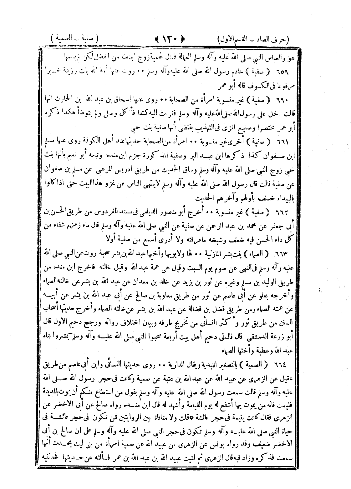 <130> هو والعباس النبي صلى الله عليه وسلم العمالة فقال لمحمية وزوج ابنتك من الفضل لكن لم يسمها صفية خادم رسول الله صلى الله عليه وسلم روت عنها أمة الله بنت رزينة خبرا مرفوعا في الكسوف قاله أبو عمر صفية غير منسوبة امرأة من الصحابة روى عنها إسحاق بن عبد الله بن الحارث أنها قالت دخل علي رسول الله صلى الله عليه وسلم فقربت إليه كتفا فأكل وصلى ولم يتوضأ هكذا ذكره أبو عمر مختصرا وصنيع المزي في التهذيب يقتضي أنها صفية بنت حيي صفية أخرى غير منسوبة امرأة من الصحابة حديثها عند أهل الكوفة روى عنها مسلم بن صفوان كذا ذكرها بن عبد البر وصفية المذكورة جزم بن مندة وتبعه أبو نعيم بأنها بنت حيي زوج النبي صلى الله عليه وسلم وساق الحديث من طريق إدريس المرهبي عن سلم بن صفوان عن صفية قالت قال رسول الله صلى الله عليه وسلم لا ينتهي الناس من غزو هذا البيت حتى إذا كانوا بالبيداء خسف بأولهم وآخرهم الحديث صفية غير منسوبة أخرج أبو منصور الديلمي في مسند الفردوس من طريق الحسن بن أبي جعفر عن محمد بن عبد الرحمن عن صفية عن النبي صلى الله عليه وسلم قال ماء زمزم شفاء من كل داء الحسن فيه ضعف وشيخه ما عرفته ولا أدري اسمع من صفية أم لا الصماء بنت بسر المازنية لها ولأبويها وأخيها عبد الله بن بسر صحبة روت عن النبي صلى الله عليه وسلم في النهي عن صوم يوم السبت وقيل هي عمة عبد الله وقيل خالته فأخرج بن منده من طريق الوليد بن مسلم وغيره عن ثور بن يزيد عن خالد بن معدان عن عبد الله بن بسر عن أخته الصماء وأخرجه بعلو عن أبي عاصم عن ثور من طريق معاوية بن صالح عن أبي عبد الله بن بسر عن أبيه عن عمته الصماء ومن طريق فضيل بن فضالة عن عبد الله بن بسر عن خالته الصماء أخرج حديثها أصحاب السنن من طريق ثور وأكثر النسائي من تخريج طرقه وبيان اختلاف رواته ورجح دحيم الأول قال أبو زرعة الدمشقي قال لي دحيم أهل بيت أربعة صحبوا النبي صلى الله عليه وسلم بسر وابناه عبد الله وعطية وأختهما الصماء الصميتة بالتصغير الليثية ويقال الدارية روى حديثها النسائي وابن أبي عاصم من طريق عقيل عن الزهري عن عبيد الله عن عبد الله بن عتبة عن صميتة وكانت في جحر رسول الله صلى الله عليه وسلم قالت سمعت رسول الله صلى الله عليه وسلم يقول من استطاع منكم أن يموت بالمدينة فليمت فإنه من يموت بها أشفع له واشهد له يوم القيامة قال بن منده رواه صالح عن أبي الأخضر عن الزهري فقال كانت يتيمة في حجر عائشة قلت ولا منافاة بين الروايتين فمن تكون في حجر عائشة في حياة النبي صلى الله عليه وسلم تكون في حجر النبي صلى الله عليه وسلم على أن صالح بن أبي الأخضر ضعيف وقد رواه يونس عن الزهري عن عبيد الله عن صميتة امرأة من بني ليث يحدث أنها سمعت فذكره وزاد فيه قال الزهري ثم لقيت عبيد الله بن عبد الله بن عمر فسألته عن حديثها فحدثنيه §
