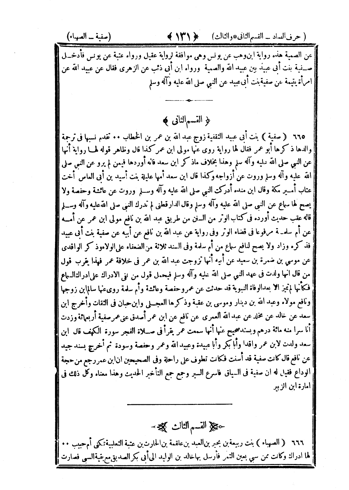<131> عن الصميتة هذه رواية بن وهب عن يونس وهي موافقة لرواية عقيل ورواه عتبة عن يونس فأدخل صفية بنت أبي عبيد بن عبيد الله والصميتة ورواه بن أبي ذئب عن الزهري فقال عن عبيد الله عن امرأة يتيمة عن صفية بنت أبي عبيد عن النبي صلى الله عليه وسلم القسم الثاني صفية بنت أبي عبيد الثقفية زوج عبد الله بن عمر بن الخطاب تقدم نسبها في ترجمة والدها ذكرها أبو عمر فقال لها رواية روى عنها مولى بن عمر كذا قال وظاهر قوله لها رواية أنها عن النبي صلى الله عليه وسلم وهذا بخلاف ما ذكر بن سعد فإنه أوردها فيمن لم يرو عن النبي صلى الله عليه وسلم وروت عن أزواجه وكذا قال بن سعد أمها عليلة بنت أسيد بن أبي العاص أخت عتاب أمير مكة وقال بن منده أدركت النبي صلى الله عليه وسلم وروت عن عائشة وحفصة ولا يصح لها سماع عن النبي صلى الله عليه وسلم وقال الدارقطني لم تدرك النبي صلى الله عليه وسلم قاله عقب حديث أورده في كتاب الوتر من السنن من طريق عبد الله بن نافع مولى بن عمر عم أمه عن أم سلمة مرفوعا في قضاء الوتر وفي رواية عن عبد الله بن نافع عن أبيه عن صفية بنت أبي عبيد فذكره وزاد ولا يصح لنافع سماع من أم سلمة وفي السند ثلاثة من الضعفاء على الولاء وذكر الواقدي عن موسى بن ضمرة بن سعيد عن أبيه أنها تزوجت عبد الله بن عمر في خلافة عمر فهذا يقرب قول من قال إنها ولدت في عهد النبي صلى الله عليه وسلم فيحمل قول من نفى الإدراك على إدراك السماع فكأنها لم تميز إلا بعد الوفاة النبوية وقد حدثت عن عمر وحفصة وعائشة وأم سلمة روى عنها سالم بن زوجها ونافع مولاه وعبد الله بن دينار وموسى بن عقبة وذكرها العجلي وابن حبان في الثقات وأخرج بن سعد عن خالد بن مخلد عن عبد الله العمري عن نافع عن بن عمر أصدق عني عمر صفية أربعمائة وزدت أنا سرا منه مائتي درهم وبسند صحيح عنها أنها سمعت عمر يقرأ في صلاة الفجر سورة الكهف قال بن سعد ولدت لابن عمر واقدا وأبا بكر وأبا عبيدة وعبد الله وعمر وحفصة وسودة ثم أخرج بسند جيد عن نافع قال كانت صفية قد أسنت فكانت تطوف على راحلة وفي الصحيحين أن بن عمر رجع من حجة الوداع فقيل له إن صفية في السياق فأسرع السير وجمع جمع التأخير الحديث وهذا معناه وكان ذلك في إمارة بن الزبير القسم الثالث الصهباء بنت ربيعة بن بحير بن عبد بن علقمة بن الحارث بن عتبة الثعلبية تكنى أم حبيب لها إدراك وكانت ممن سبى بعين التمر فأرسل بها خالد بن الوليد إلى أبي بكر الصديق مع بقية السبي فصارت §