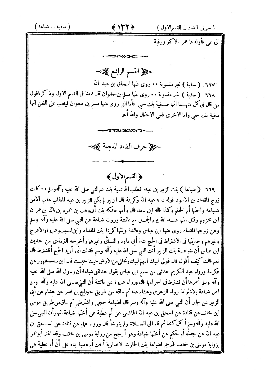 <132> إلى علي فأولدها عمر الأكبر ورقية القسم الرابع صفية غير منسوبة روى عنها إسحاق بن عبد الله صفية غير منسوبة روى عنها مسلم بن صفوان تقدمتا في القسم الأول وذكرنا قول من قال في كل منهما إنها صفية بنت حيي فأما التي روى عنها مسلم بن صفوان فيغلب على الظن أنها صفية بنت حيي وأما الأخرى فعلى الاحتمال والله أعلم