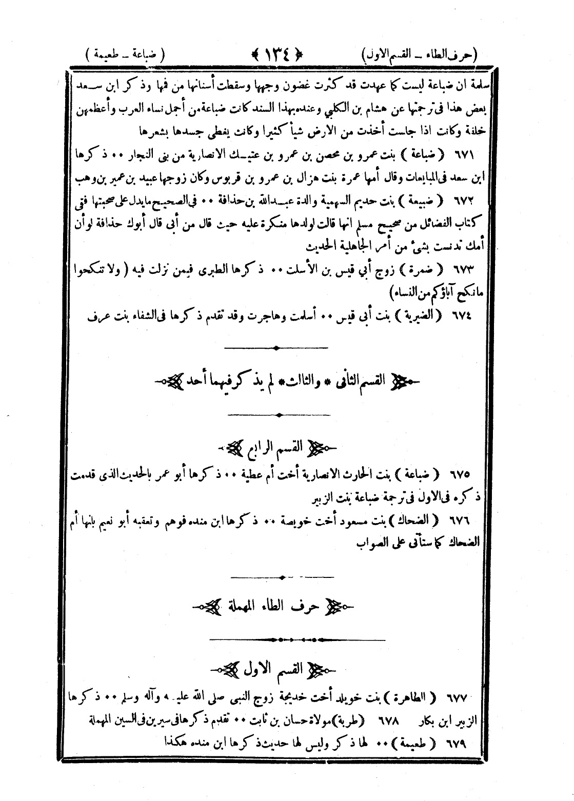<134> سلمة إن ضباعة ليست كما عهدت قد كثرت غضون وجهها وسقطت أسنانها من فمها وذكر بن سعد بعض هذا في ترجمتها عن هشام بن الكلبي وعنه بهذا السند كانت ضباعة من أجمل نساء العرب وأعظمهن خلقة وكانت إذا جلست أخذت من الأرض شيئا كثيرا وكانت تغطي جسدها بشعرها ضباعة بنت عمرو بن محصن بن عمرو بن عتيك الأنصارية من بني النجار ذكرها بن سعد في المبايعات وقال أمها عمرة بنت هزال بن عمرو بن قربوس وكان زوجها عبيد بن عمير بن وهب ضبيعة بنت حذيم السهمية والده عبد الله بن حذافة في الصحيح ما يدل على صحبتها ففي كتاب الفضائل من صحيح مسلم أنها قالت لولدها منكرة عليه حيث قال من أبي قالت أبوك حذافة لو أن أمك تدنست بشيء من أمر الجاهلية الحديث ضمرة زوج أبي قيس بن الأسلت ذكرها الطبري فيمن نزلت فيه ولا تنكحوا ما نكح آباؤكم من النساء الضيزنة بنت أبي قيس أسلمت وهاجرت وقد تقدم ذكرها في الشفاء بنت عوف القسم الثاني والقسم الثالث لم يذكر فيهما أحد الرابع ضباعة بنت الحارث الأنصارية أخت أم عطية ذكرها أبو عمر بالحديث الذي قدمت ذكره في الأول في ترجمة ضباعة بنت الزبير الضحاك بنت مسعود أخت حويصة ذكرها بن منده فوهم وتعقبه أبو نعيم بأنها أم الضحاك كما ستأتي على الصواب في الكنى
