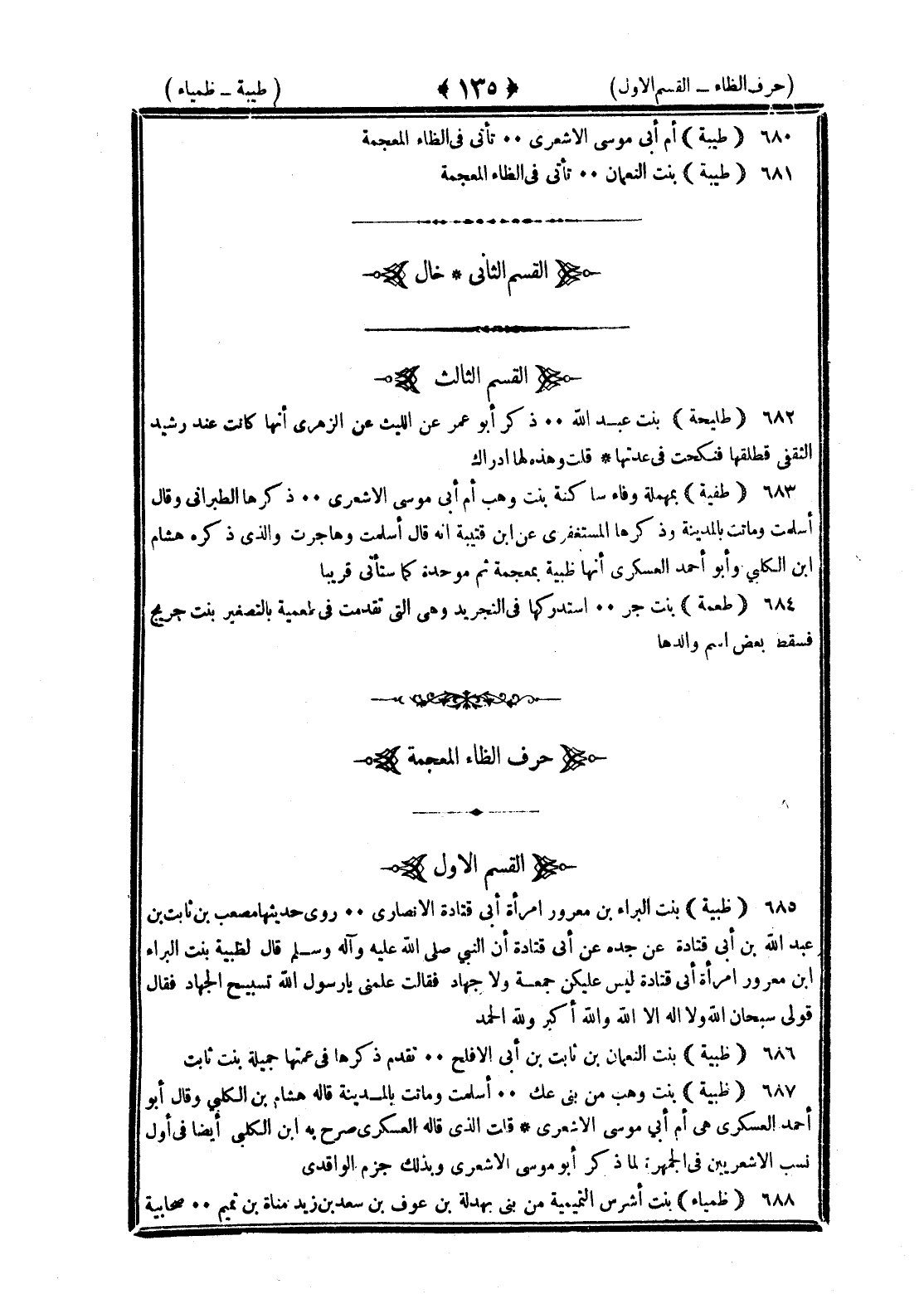 <135> طيبة أم أبي موسى الأشعري تأتي في الظاء المعجمة طيبة بنت النعمان تأتي في الظاء المعجمة القسم الثاني خال الثالث طليحة بنت عبد الله ذكر أبو عمر عن الليث عن الزهري أنها كانت عند رشيد الثقفي فطلقها فنكحت في عدتها قلت وهذه لها إدراك طفية بمهملة وفاء ساكنة بنت وهب أم أبي موسى الأشعري ذكرها الطبراني وقال أسلمت وماتت بالمدينة وذكر المتسغفري عن بن قتيبة أنه قال أسلمت وهاجرت والذي ذكره هشام بن الكلبي وأبو أحمد العسكري أنها ظبية بمعجمة ثم موحدة كما ستأتي قريبا طعيمة بنت جر استدركها في التجريد وهي التي تقدمت في طعيمة بالتصغير بنت جريج فسقط بعض أسم والدها