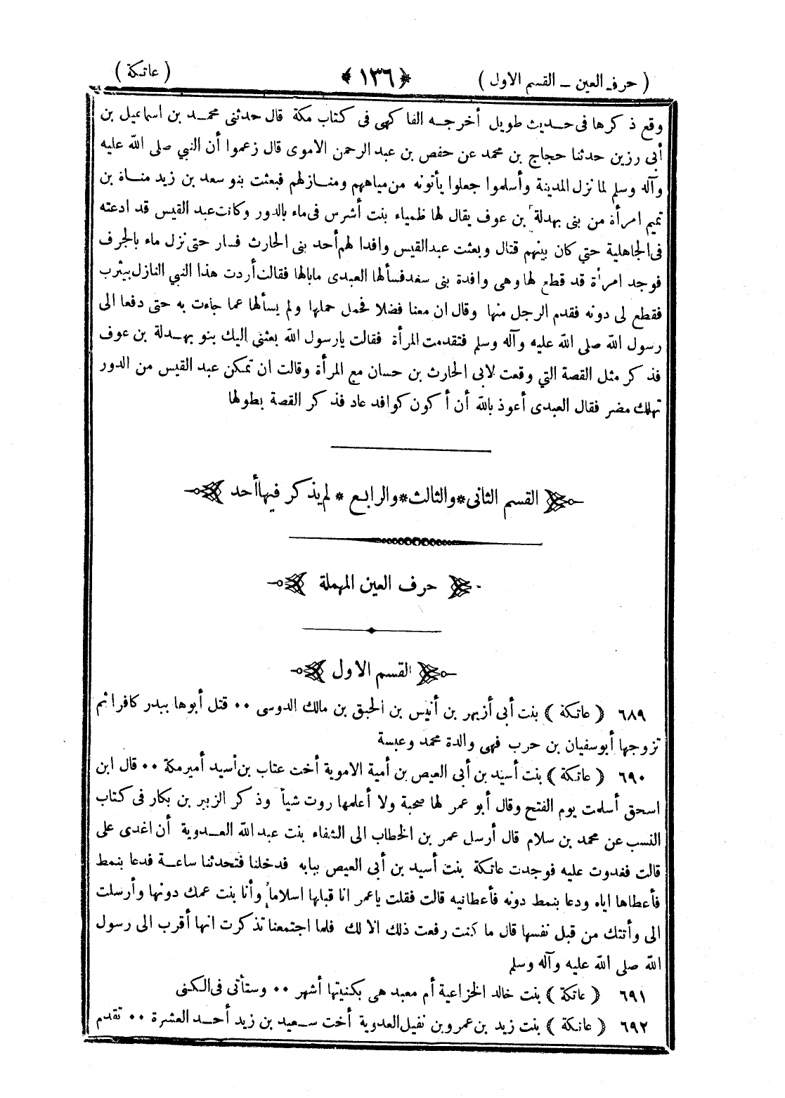 عاتكة بنت أبي أزيهر بن أنيس بن الحمق بن مالك الدوسي قتل أبوها ببدر كافرا ثم تزوجها أبو سفيان بن حرب فهي والدة ولديه محمد وعنبسة عاتكة بنت أسيد بن أبي العيص بن أمية الأموية أخت عتاب بن أسيد أمير مكة قال بن إسحاق أسلمت يوم الفتح وقال أبو عمر لها صحبة ولا أعلمها روت شيئا وذكر الزبير بن بكار في كتاب النسب عن محمد بن سلام قال أرسل عمر بن الخطاب إلى الشفاء بنت عبد الله العدوية أن أغدى علي قالت فغدوت عليه فوجدت عاتكة بنت أسيد بن أبي العيص ببابه فدخلنا فتحدثنا ساعة فدعا بنمط فأعطاها إياه ودعا بنمط دونه فأعطانيه قالت فقالت يا عمر أنا قبلها إسلاما وأنا بنت عمك دونها وأرسلت إلي وأتت من قبل نفسها قال ما كنت رفعت ذلك إلا لك فلما اجتمعتما تذكرت أنها أقرب إلى رسول الله صلى الله عليه وسلم منك عاتكة بنت خالد الخزاعية أم معبد هي بكنيتها أشهر وستأتي في الكنى عاتكة بنت زيد بن عمرو بن نفيل العدوية أخت سعيد بن زيد أحد العشرة تقدم §