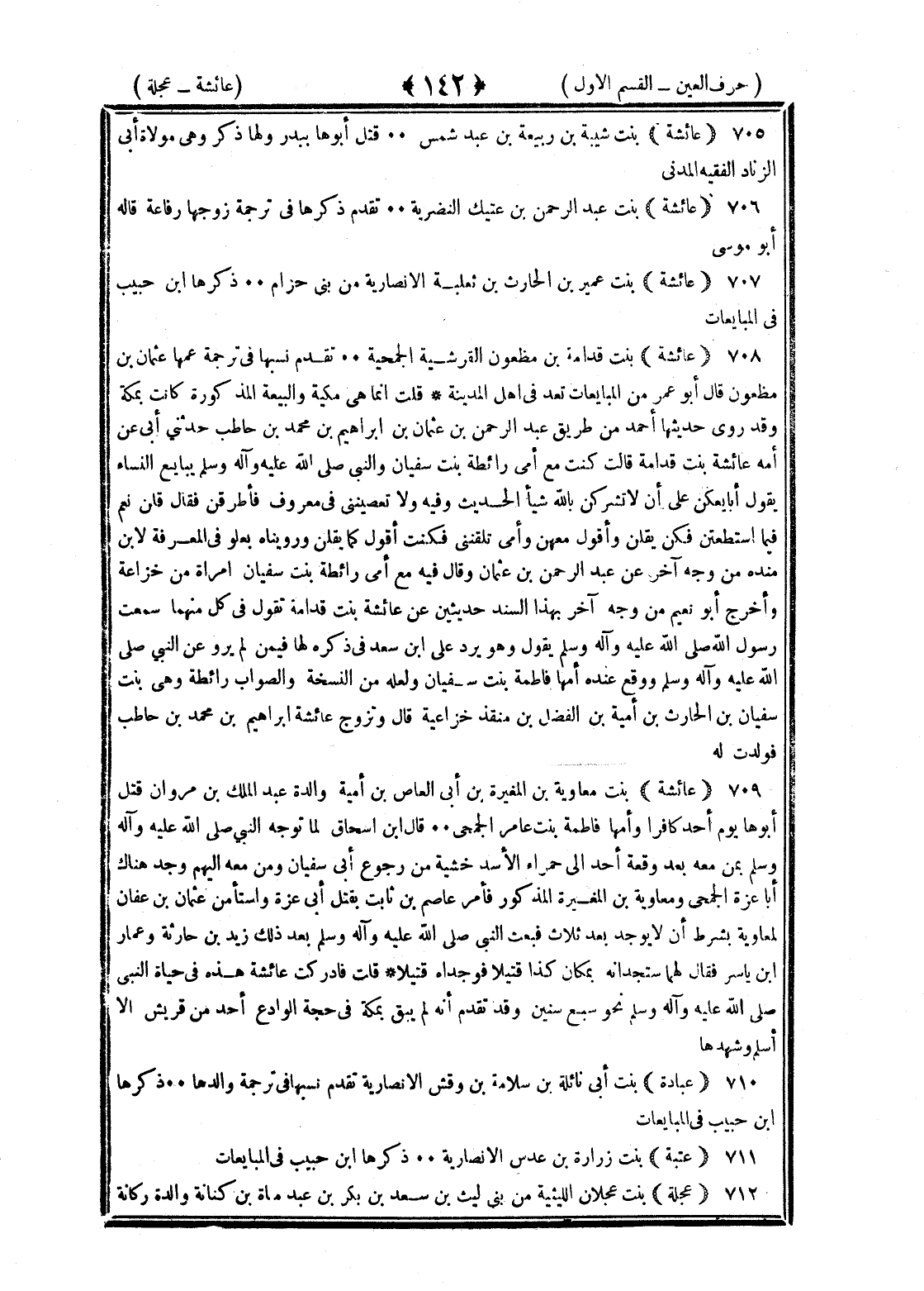 <142> عائشة بنت شيبة بن ربيعة بن عبد شمس قتل أبوها ببدر ولها ذكر وهي مولاة أبي الزناد الفقيه المدني عائشة بنت عبد الرحمن بن عتيك النضرية تقدم ذكرها في ترجمة زوجها رفاعة قاله أبو موسى عائشة بنت عمير بن الحارث بن ثعلبة الأنصارية من بني حرام ذكرها بن حبيب في المبايعات عائشة بنت قدامة بن مظعون القرشية الجمحية تقدم نسبها في ترجمة عمها عثمان بن مظعون قال أبو عمر من المبايعات تعد من أهل المدينة قلت إنما هي مكية والبيعة المذكورة كانت بمكة وقد روى حديثها أحمد من طريق عبد الرحمن بن عثمان بن إبراهيم بن محمد بن حاطب حدثني أبي عن أمه عائشة بنت قدامة قالت كنت مع أمي رائطة بنت سفيان والنبي صلى الله عليه وسلم يبايع النساء يقول أبايعكن على ألا تشركن بالله شيئا الحديث وفيه ولا تعصينني في معروف فأطرقن فقال قلن نعم فيما استعطتن فكن يقلن وأقول معهن وأمي تلقنني فكنت أقول كما يقلن ورويناه بعلو في المعرفة لابن منده من وجه آخر عن عبد الرحمن بن عثمان وقال فيه مع أمي رائطة بنت سفيان امرأة من خزاعة وأخرج أبو نعيم من وجه آخر بهذا السند حديثين عن عائشة بنت قدامة تقول في كل منهما سمعت رسول الله صلى الله عليه وسلم يقول وهو يرد على بن سعد في ذكره لها فيمن لم يرو عن النبي صلى الله عليه وسلم ووقع عنده أمها فاطمة بنت سفيان ولعله من النسخة والصواب رائطة بنت سفيان بن الحارث بن أمية بن الفضل بن منقذ خزاعية قال وتزوج عائشة إبراهيم بن محمد بن حاطب فولدت له عائشة بنت معاوية بن المغيرة بن أبي العاص بن أمية والدة عبد الملك بن مروان قتل أبوها يوم أحد كافرا وأمها فاطمة بنت عامر الجمحي قال بن إسحاق لما توجه النبي صلى الله عليه وسلم بمن معه بعد وقعة أحد إلى حمراء الأسد خشية من رجوع أبي سفيان ومن معه إليهم وجد هناك أبا عزة الجمحي ومعاوية بن المغيرة المذكور فأمر عاصم بن ثابت بقتل أبي عزة واستأمن عثمان بن عفان لمعاوية فشرط ألا يوجد بعد ثلاث فبعث النبي صلى الله عليه وسلم بعد ذلك زيد بن حارثة وعمار بن ياسر فقال لهما ستجدانه بمكان كذا قتيلا قلت فأدركت عائشة هذه من حياة النبي صلى الله عليه وسلم وعلى وآله وسلم نحو سبع سنين وقد تقدم أنه لم يبق بمكة في حجة الوداع أحد من قريش إلا أسلم وشهدها عبادة بنت أبي نائلة بن سلامة بن وقش الأنصارية تقدم نسبها في ترجمة والدها وذكرها بن حبيب في المبايعات عتبة بنت زرارة بن عدس الأنصارية ذكرها بن حبيب في المبايعات عجلة بنت عجلان الليثية من بني ليث بن سعد بن بكر بن عبد مناة بن كنانة والدة ركانة §