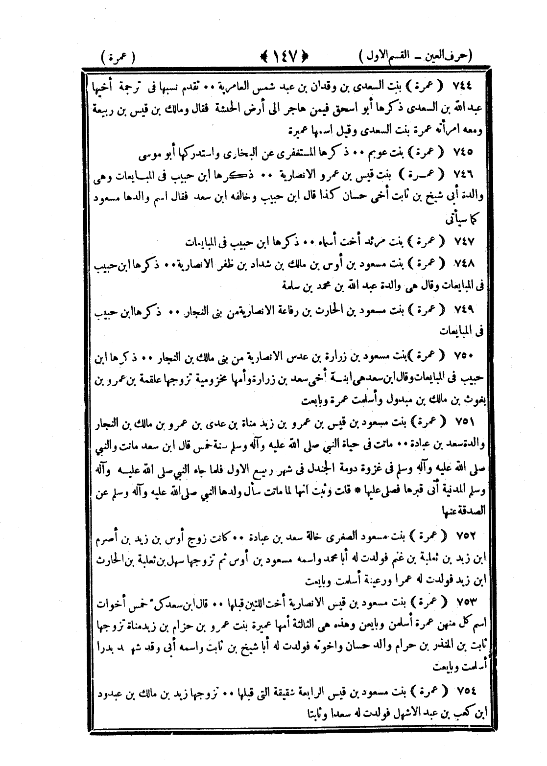 <147> عمرة بنت السعدي بن وقدان بن عبد شمس العامرية تقدم نسبها في ترجمة أخيها عبد الله بن السعدي ذكرها بن إسحاق فيمن هاجر إلى أرض الحبشة فقال ومالك بن قيس بن ربيعة ومعه امرأته عمرة بنت السعدي وقيل اسمها عميرة عمرة بنت عويم ذكرها المستغفري عن البخاري واستدركها أبو موسى عمرة بنت قيس بن عمرو الأنصارية ذكرها بن حبيب في المبايعات وهي والدة أبي شيخ بن ثابت أخي حسان كذا قال بن حبيب وخالفه بن سعد فقال اسم والدها مسعود كما سيأتي عمرة بنت مرثد أخت أسماء ذكرها بن حبيب في المبايعات عمرة بنت مسعود بن أوس بن مالك بن سواد بن ظفر الأنصارية ذكرها بن حبيب في المبايعات وقال هي والدة عبد الله بن محمد بن سلمة عمرة بنت مسعود بن الحارث بن رفاعة الأنصارية من بني النجار ذكرها بن حبيب في المبايعات عمرة بنت مسعود بن زرارة بن عدي الأنصارية من بني مالك بن النجار ذكرها بن حبيب في المبايعات وقال بن سعد هي ابنة أخي سعد بن زرارة وأمها مخزومية تزوجها علقمة بن عمرو بن يغوث بن مالك بن مبذول وأسلمت عمرة وبايعت عمرة بنت مسعود بن قيس بن عمرو بن زيد مناة بن عدي بن عمرو بن مالك بن النجار والدة سعد بن عبادة ماتت في حياة النبي صلى الله عليه وسلم سنة خمس قال بن سعد ماتت والنبي صلى الله عليه وسلم في غزوة دومة الجندل في شهر ربيع الأول فلما جاء النبي صلى الله عليه وسلم المدينة أتى قبرها فصلى عليها قلت وثبت أنها لما ماتت سأل ولدها النبي صلى الله عليه وسلم عن الصدقة عنها عمرة بنت مسعود الصغرى خالة سعد بن عبادة كانت زوج أوس بن زيد بن أصرم بن زيد بن ثعلبة بن غنم فولدت له أبا محمد واسمه مسعود بن أوس ثم تزوجها سهل بن ثعلبة بن الحارث بن زيد فولدت له عمرا ورغيبة أسلمت وبايعت عمرة بنت مسعود بن قيس الأنصارية أخت اللتين قبلها قال بن سعد كن خمس أخوات اسم كل منهن عمرة أسلمن وبايعن وهذه هي الثالثة أمها عميرة بنت عمرو بن حرام بن زيد مناة تزوجها ثابت بن المنذر بن حرام والد حسان وإخوته فولدت له أبا شيخ بن ثابت واسمه أبي وقد شهد بدرا أسلمت وبايعت عمرة بنت مسعود بن قيس الرابعة شقيقة التي قبلها تزوجها زيد بن مالك بن عبد ود بن كعب بن عبد الأشهل فولدت له سعدا وثابتا §