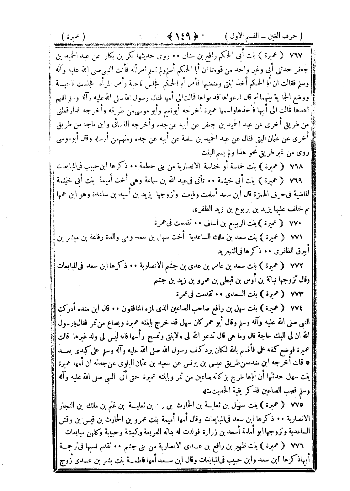 <149> عميرة بنت أبي الحكم رافع بن سنان روى حديثها بكر بن بكار عن عبد الحميد بن جعفر حدثني أبي وغير واحد من قومنا أن أبا الحكم أسلم ولم تسلم امرأته فأتت النبي صلى الله عليه وسلم فقالت إن أبا الحكم أخذ ابنتي ومنعنيها فأمر أبا الحكم فجلس ناحية وأمر المرأة فجلست ناحية ووضع الجارية بينهما ثم قال ادعواها فدعواها فمالت إلى أمها فقال رسول الله صلى الله عليه وسلم وعلى وآله وسلم اللهم اهدها فمالت إلى أبيها فأخذها واسمها عميرة أخرجه أبو نعيم وأبو موسى من طريقه وأخرجه الدارقطني من طريق أخرى عن عبد الحميد بن جعفر عن أبيه عن جده وأخرجه النسائي وابن ماجة من طريق أخرى عن عثمان البتي فقال عن عبد الحميد بن سلمة عن أبيه عن جده ومنهم من أرسله وقال أبو موسى روى من غير طريق نحو هذا ولم يسم البنت عميرة بنت خماشة أو حباشة الأنصارية من بني خطمة ذكرها بن حبيب في المبايعات عميرة بنت أبي خيثمة تأتي في عبد الله بن سماعه وهي أخت أميمة بنت أبي خيثمة الماضية في حرف الهمزة قال بن سعد أسلمت وبايعت وتزوجها يزيد بن أسيد بن ساعدة وهو بن عمها ثم خلف عليها يزيد بن يربوع بن زيد الظفري عميرة بنت الربيع بن إساف تقدمت في عمرة عميرة بنت سعد بن مالك الساعدية أخت سهل بن سعد وهي والدة رفاعة بن مبشر بن أبيرق الظفري ذكرها في التجريد عميرة بنت سعد بن عامر بن عدي بن جشم الأنصارية ذكرها بن سعد في المبايعات وقال تزوجها كباثة بن أوس بن قيظي بن عمرو بن زيد بن جشم عميرة بنت السعدي تقدمت في عمرة عميرة بنت سهل بن رافع صاحب الصاعين الذي لمزه المنافقون قال بن منده أدركت النبي صلى الله عليه وسلم وقال أبو عمر كان سهل قد خرج بابنته عميرة وبصاع من تمر فقال يا رسول الله إن لي إليك حاجة قال وما هي قال تدعو الله لي ولابنتي وتمسح رأسها فإنه ليس لي ولد غيرها قالت عميرة فوضع كفه علي فأقسم بالله لكان برد كف رسول الله صلى الله عليه وسلم على كبدي بعد قلت أخرجه بن منده من طريق عيسى بن يونس عن سعيد بن عثمان البلوي عن جدته عميرة بنت سهل حدثتها أن أباها خرج بزكاته صاعين من تمر وبابنته عميرة حتى أتى النبي صلى الله عليه وسلم فصب الصاعين فذكر بقية الحديث مثله عميرة بنت سهيل بن ثعلبة بن الحارث بن زيد بن ثعلبة بن غنم بن مالك بن النجار الأنصارية ذكرها بن سعد في المبايعات وقال أمها أميمة بنت عمرو بن الحارث بن وقش الساعدية وتزوجها أبو أمامة أسعد بن زرارة فولدت له بناته الفريعة وكبشة وحبيبة وكلهن مبايعات عميرة بنت ظهير بن رافع بن عدي الأنصارية من بني جشم تقدم نسبها في ترجمة أبيها ذكرها بن سعد وابن حبيب في المبايعات وقال بن سعد أمها فاطمة بنت بشر بن عدي زوج §