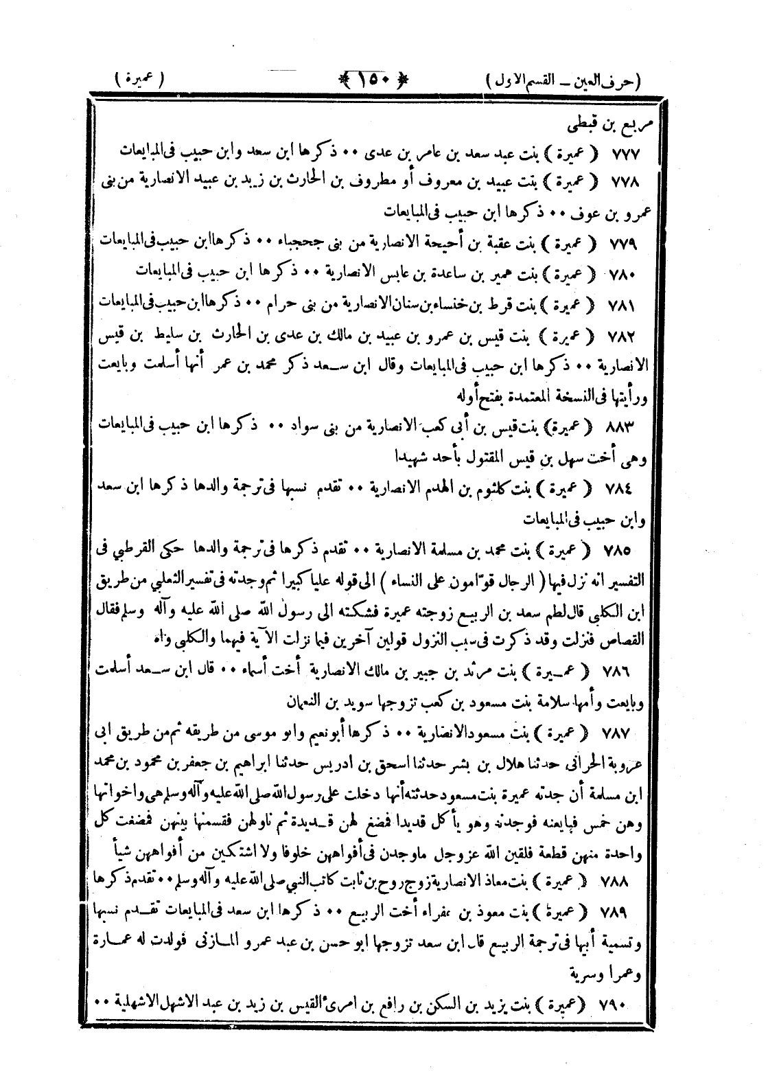 <150> مربع بن قيظي عميرة بنت عبد سعد بن عامر بن عدي ذكرها بن سعد وابن حبيب في المبايعات عميرة بنت عبيد بن معروف أو مطروف بن الحارث بن زيد بن عبيد الأنصارية من بني عمرو بن عوف ذكرها بن حبيب في المبايعات عميرة بنت عقبة بن أحيحة الأنصارية من بني جحجي ذكرها بن حبيب في المبايعات عميرة بنت عمير بن ساعدة بن عائش الأنصارية ذكرها بن حبيب في المبايعات عميرة بنت قرط بن خنساء بن سنان من بني حرام ذكرها بن حبيب في المبايعات عميرة بنت قيس بن عمرو بن عبيد بن مالك بن عدي بن الحارث بن سليط بن قيس الأنصارية ذكرها بن حبيب في المبايعات وقال بن سعد ذكر محمد بن عمر أنها أسلمت وبايعت ورأيتها في النسخة المعتمدة بفتح أوله عميرة بنت قيس بن أبي كعب الأنصارية من بني سواد ذكرها بن حبيب في المبايعات وهي أخت سهل بن قيس المقتول بأحد شهيدا عميرة بنت كلثوم بن الهدم الأنصارية تقدم نسبها في ترجمة والدها ذكرها بن سعد وابن حبيب في المبايعات عميرة بنت محمد بن سلمة الأنصارية تقدم ذكرها في ترجمة والدها حكى القرطبي في التفسير أنه نزل فيها الرجال قوامون على النساء إلى قوله عليا كبيرا ثم وجدته في تفسير الثعلبي من طريق بن الكلبي قال لطم سعد بن الربيع زوجته فشكته إلى رسول الله صلى الله عليه وسلم فقال القصاص فنزلت وقد ذكرت في سبب النزول قولين آخرين فيما نزلت الآية فيهما والكلبي واه عميرة بنت مرثد بن جبير بن مالك الأنصارية أخت أسماء قال بن سعد أسلمت وبايعت وأمها سلامة بنت مسعود بن كعب تزوجها سويد بن النعمان عميرة بنت مسعود الأنصارية ذكرها أبو نعيم وأبو موسى من طريقه ثم من طريق أبي عروبة الحراني حدثنا هلال بن بشر حدثنا إسحاق بن إدريس حدثنا إبراهيم بن جعفر بن محمود بن محمد بن مسلمة أن جدته عميرة بنت مسعود حدثته أنها دخلت على رسول الله صلى الله عليه وسلم هي وأخوتها وهن خمس فبايعنه فوجدنه وهو يأكل قديدا فمضغ لهن قديدة ثم ناولهن فقسمنها بينهن فمضغت كل واحدة منهن قطعة فلقين الله عز وجل ما وجدن في أفواههن خلوفا ولا اشتكين من أفواههن شيئا عميرة بنت معاذ الأنصارية زوج روح بن ثابت كاتب النبي صلى الله عليه وسلم ذكرها عميرة بنت معوذ بن عفراء أخت الربيع ذكرها بن سعد في المبايعات تقدم نسبها وتسمية أبيها في ترجمة الربيع قال بن سعد تزوجها أبو حسن بن عبد عمرو المازني فولدت له عمارة وعمرا وسرية عميرة بنت يزيد بن السكن بن رافع بن امرئ القيس بن زيد بن عبد الأشهل الأشهلية §