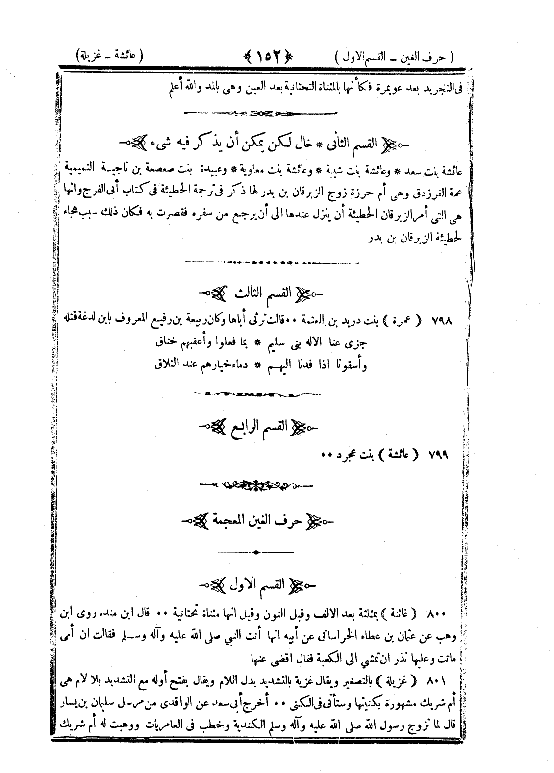 <152> في التجريد بعد عويمرة فكأنها بالمثناة التحتانية بعد العين وهي بالمدينة والله أعلم القسم الثاني خال لكن يمكن أن يذكر فيه عائشة بنت سعد وعائشة بنت شيبة وعائشة بنت معاوية وعبيدة بنت صعصعة بن ناجية التميمية عمة الفرزدق وهي أم حزرة زوج الزبرقان بن بدر لها ذكر في ترجمة الحطيئة في كتاب أبي الفرج وأنها هي التي أمر الزبرقان الحطيئة أن ينزل عندها إلى أن يرجع من سفره فقصرت به فكان ذلك سبب هجاء الحطيئة الزبرقان بن بدر الثالث عمرة بنت دريد بن الصمة قالت ترثي أباها وكان ربيعة بن رفيع المعروف بابن الدغنة قتله جزى عنا الإله بني سليم بما فعلوا وأعقبهم عقاق وأسقانا إذا قدنا إليهم دماء خيارهم عند التلاق