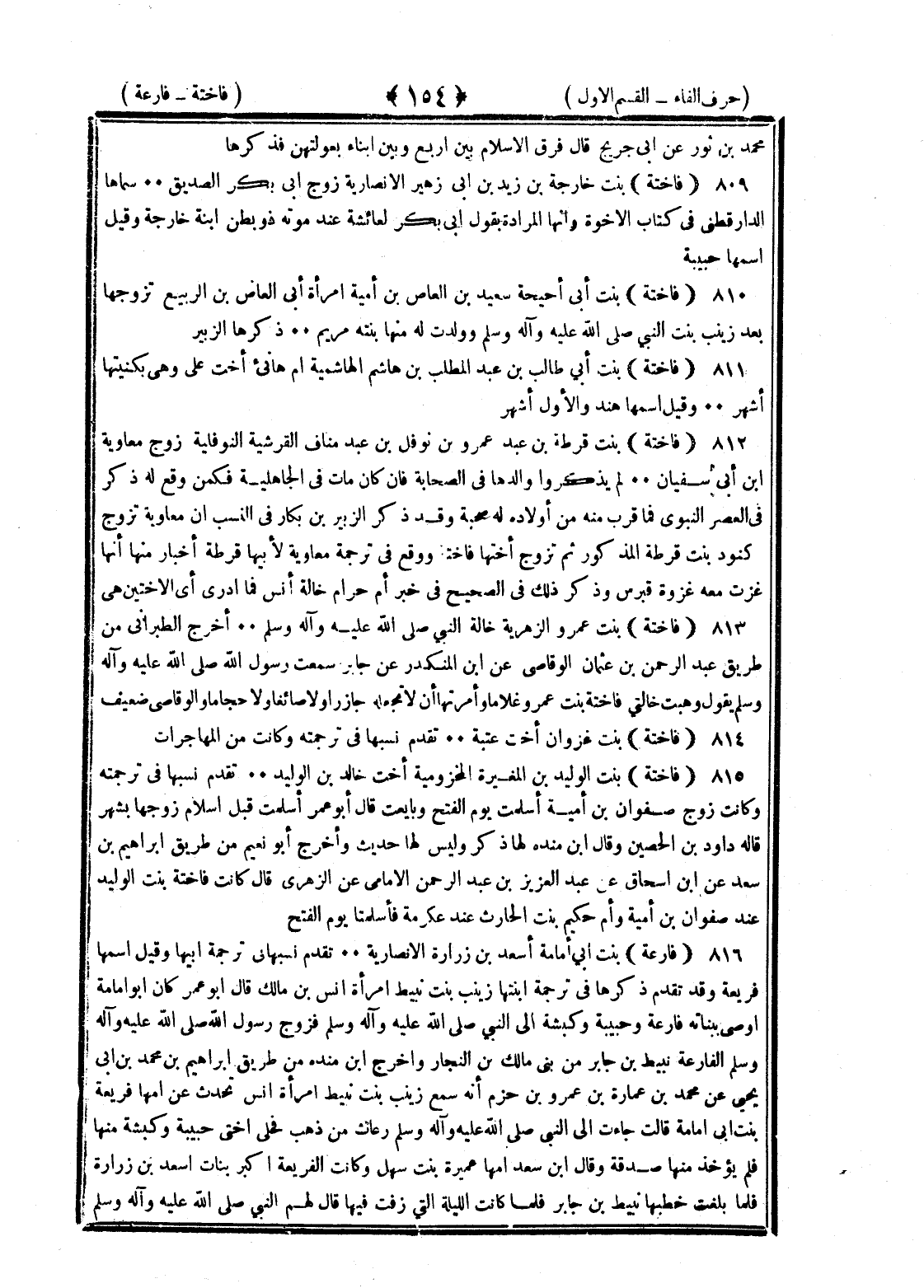 <154> محمد بن ثور عن بن جريج قال فرق الإسلام بين أربع وبين أبناء بعولتهن فذكرها فاختة بنت خارجة بن زيد بن أبي زهير الأنصارية زوج أبي بكر الصديق سماها الدارقطني في كتاب الإخوة وأنها المراد بقول أبي بكر لعائشة عند موته ذو بطن ابنة خارجة وقيل اسمها حبيبة فاختة بنت أبي أحيحة سعد بن العاص بن أمية امرأة أبي العاص بن الربيع تزوجها بعد زينب بنت النبي صلى الله عليه وسلم وولدت له منها بنته مريم ذكرها الزبير فاختة بنت أبي طالب بن عبد المطلب بن هاشم الهاشمية أم هانئ أخت علي وهي بكنيتها أشهر وقيل اسمها هند والأول أشهر فاختة بنت قرظة بن عبد عمروة بن نوفل بن عبد مناف القرشية النوفلية زوج معاوية بن أبي سفيان لم يذكروا والدها في الصحابة فإن كان مات في الجاهلية فكمن وقع له ذكر في العصر النبوي فما قرب منه من أولاده له صحبة وقد ذكر الزبير بن بكار في النسب أن معاوية تزوج كنود بنت قرظة المذكورة ثم تزوج أختها فاختة ووقع في ترجمة معاوية لأبيها قرظة أخبار منها غزت معه غزوة قبرس وذكر ذلك في الصحيح في خبر أم حرام خالة أنس فما أدري أي الأختين هي فاختة بنت عمرو والزهرية خالة النبي صلى الله عليه وسلم أخرج الطبراني من طريق عبد الرحمن بن عثمان الوقاصي عن بن المنكدر عن جابر سمعت رسول الله صلى الله عليه وسلم يقول وهبت خالتي فاختة بنت عمرو غلاما وأمرتها ألا تجعله جازرا ولا صائغا ولا حجاما والوقاصي ضعيف فاختة بنت غروان أخت عتبة تقدم نسبها في ترجمته وكانت من المهاجرات فاختة بنت الوليد بن المغيرة المخزومية أخت خالد بن الوليد تقدم نسبها في ترجمته وكانت زوج صفوان بن أمية أسلمت يوم الفتح وبايعت قال أبو عمر أسلمت قبل إسلام زوجها بشهر قاله داود بن الحصين وقال بن منده لها ذكر وليس لها حديث وأخرج أبو نعيم من طريق إبراهيم بن سعد عن بن إسحاق عن عبد العزيز بن عبد الرحمن الإمامي عن الزهري قال كانت فاختة بنت الوليد عند صفوان بن أمية وأم حكيم بنت الحارث عند عكرمة فأسلمتا يوم الفتح فارعة بنت أبي أمامة أسعد بن زرارة الأنصارية تقدم نسبها في ترجمة أبيها وقيل اسمها فريعة وقد تقدم ذكرها في ترجمة ابنتها زينب بنت نبيط امرأة أنس بن مالك قال أبو عمر كان أبو أمامة أوصى ببناته فارعة وحبيبة وكبشة إلى النبي صلى الله عليه وسلم فزوج النبي صلى الله عليه وسلم الفارعة نبيط بن جابر من بني مالك بن النجار وأخرج بن منده من طريق إبراهيم بن محمد بن أبي يحيى عن محمد بن عمارة بن عمرو بن حزم أنه سمع زينب بنت نبيط امرأة أنس تحدث عن أمها فريعة بنت أبي أمامة قالت جاءت إلى النبي صلى الله عليه وسلم رعاث من ذهب فحلى أختي حبيبة وكبشة منها فلم يؤخذ منها صدقة وقال بن سعد أمها عميرة بنت سهل وكانت الفريعة أكبر بنات أسعد بن زرارة فلما بلغت خطبها نبيط بن جابر فلما كانت الليلة التي زفت فيها قال لهم النبي صلى الله عليه وسلم §