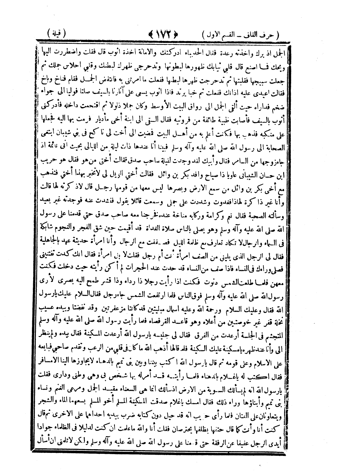 <172> الجمل إذ بكر وأخذته رعدة فقالت الحديباء أدركتك والأمانة أخذة أثوب قال فقلت واضطررت إليها ويحك فما أصنع قالت قلبي ثيابك ظهورها لبطونها وتدحرجي ظهرك لبطنك وقلبي أحلاس جملك ثم جعلت سبيجها فقلبتها ثم تدحرجت ظهرها لبطنها ففعلت ما أمرتني به فانتقض الجمل فقام فناخ وبال فقالت أعيدي عليه أذانك ففعلت ثم خبا يرتد فإذا أثوب يسعى على آثارنا بالسيف صلتا فوألنا إلى حواء ضخم فداره حيث ألقى الجمل إلى رواق البيت الأوسط وكان جملا ذلولا ثم اقتحم داخله فأدركني أثوب بالسيف فأصابت ظبته طائفة من فرويته فقال ألقى إلي ابنة أخي يا دفار فرمت بها إليه فجعلها على منكبه فذهب بها فكنت أعلم به من أهل البيت فمضيت إلى أخت لي ناكح في بني شيبان أبتغي الصحابة إلى رسول الله صلى الله عليه وسلم فبينا أنا عندها ذات ليلة من الليالي تحسب أني نائمة إذ جاء زوجها من السامر فقال وأبيك لقد وجدت لفيلة صاحب صدق فقالت أختي من هو فقال هو حريث بن حسان الشيباني وافد بكر بن وائل فقالت أختي الويل لي لا تخبر بهذا أختي فتذهب مع أخي بكر بن وائل بين سمع الأرض وبصرها ليس معها من قومها رجل قال لا ذكرته لها قالت وأنا غير ذاكرة لهذا فغدوت وشددت على جمل وسمعت قائلا يقول فنشدت عنه فوجدته غير بعيد وسألته الصحبة فقال نعم وكرامة وركابه مناخة عنده فخرجنا معه صاحب صدق حتى قدمنا على رسول الله صلى الله عليه وسلم وهو يصلي بالناس صلاة الغداة قد أقيمت حين شق الفجر والنجوم شابكة في السماء والرجال لا تكاد تعارف مع ظلمة الليل فصففت مع الرجال وأنا امرأة حديثه عهد بالجاهلية فقال لي الرجل الذي يليني من الصف امرأة أنت أم رجل فقلت لا بل امرأة فقال إنك كدت تفتنيني فصلى وراءك في النساء فإذا صف من النساء قد حدث عند الحجرات لم أكن رأيته حيث دخلت فكنت معهن فلما طلعت الشمس دنوت فكنت إذا رأيت رجلا ذا رواء وذا قشر طمح إليه بصري لأرى رسول الله صلى الله عليه وسلم فوق الناس فلما ارتفعت الشمس جاء رجل فقال السلام عليك يا رسول الله فقال وعليك السلام ورحمة الله وعليه أسمال مليتين قد كانت مزعفرتين وقد نقضتا وبيده عسيب نخلة قفر غير خوصتين من أعلاه وهو قاعد القرفصاء فلما رأيت رسول الله صلى الله عليه وسلم المتخشع في الجلسة أرعدت من الفرق فقال لي جليسه يا رسول الله أرعدت المسكينة فقال بيده ولم ينظر إلي وأنا عند ظهره يا مسكينة عليك السكينة فلما قالها أذهب الله ما كان في قلبي من الرعب وتقدم صاحبي فبايعه على الإسلام وعلى قومه ثم قال يا رسول الله اكتب بيننا وبين بني تميم بالدهناء لا يجاوزها إلينا إلا مسافر أو مجاوز فقال اكتب له يا غلام بالدهناء فلما رأيته قد أمر له بها شخص بن وهي وطني وداري فقلت يا رسول الله إنه لم يسألك السوية من الأرض إذ سألك إنما هي الدهناء مقيد الجمل ومرعي الغنم ونساء بني تميم وأبناؤها وراء ذلك فقال أمسك يا غلام صدقت المسكينة المسلم أخو المسلم يسعهما الماء والشجر ويتعاونان على الفتان فلما رأى حريث أنه قد حيل دون كتابه ضرب بيديه إحداهما على الأخرى ثم قال كنت أنا وأنت كما قال حتفها ضائن تحمل بأظلافها فقلت أنا والله ما علمت إن كنت لدليلا في الظلماء جوادا أبدى الرجل عفيفا عن الرفيقة حتى قدمنا على رسول الله صلى الله عليه وسلم ولكن لا تلمني أن أسأل §