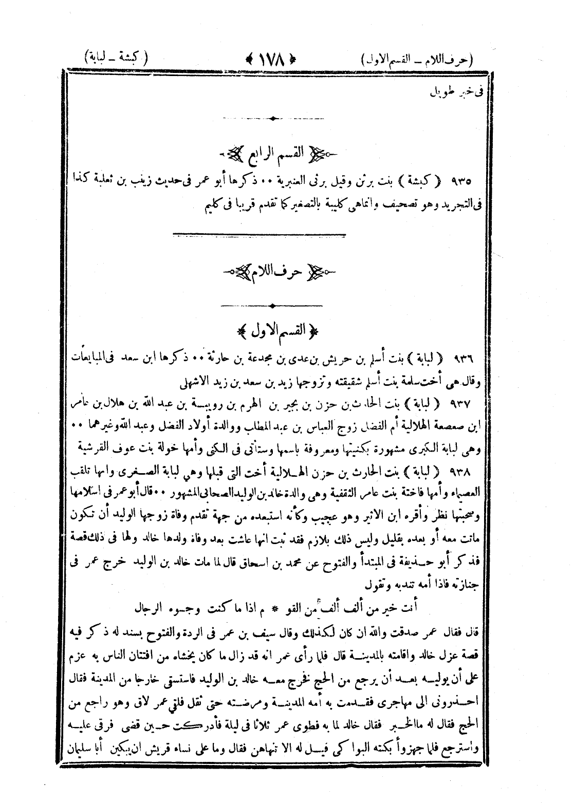 <178> في خبر طويل القسم الرابع كبشة بنت برثن وقيل يثربي العنبرية ذكرها أبو عمر في حديث زينب بنت ثعلبة كذا في التجريد وهو تصحيف وإنما هي كليبة بالتصغير كما تقدم قريبا في كلثم