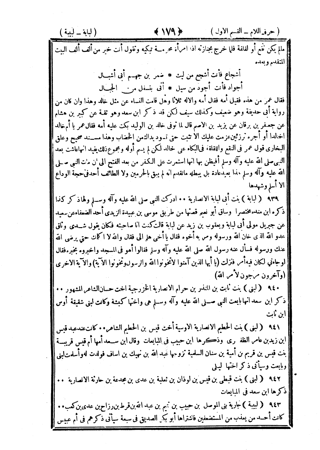 <179> ما لم يكن نقع أو لقلقة فلما أخرج بجنازته إذا امرأة محرمة تبكيه وتقول أنت خير من ألف ألف البيت المتقدم وبعده أشجاع فأنت أشجع من ليث صهر بن جهم أبي أشبال أجواد فأنت أجود من سيل أتى يستقل بين الجبال فقال عمر من هذه فقيل أمه فقال أمه والإله ثلاثا وهل قامت النساء عن مثل خالد وهذا وإن كان من رواية أبي حذيفة وهو ضعيف وكذلك سيف لكن قد ذكر بن سعد وهو ثقة عن كثير بن هشام عن جعفر بن برقان عن يزيد بن الأصم قال لما توفي خالد بن الوليد بكت عليه أمه فقال عمر يا أم خالد أخالدا أو أجره ترزئين عزمت عليك إلا تثبت حتى تسود يداك من الخضاب وهذا مسند صحيح وعلق البخاري قول عمر في النقع واللقلقة في البكاء على خالد لكن لم يسم أمه ومجموع ذلك يفيد أنها عاشت بعد النبي صلى الله عليه وسلم أفيظن بها أنها استمرت على الكفر من بعد الفتح إلى أن مات النبي صلى الله عليه وسلم هذا بعيد عادة بل يبطله ما تقدم أنه لم يبق بالحرمين ولا الطائف أحد في حجة الوداع إلا أسلم وشهدها لبابة بنت أبي لبابة الأنصارية أدركت النبي صلى الله عليه وسلم ولها ذكر كذا ذكرها بن منده مختصرا وساق أبو نعيم قصتها من طريق موسى بن عبيدة الربذي أحد الضعفاء عن سعيد بن جبير مولى أبي لبابة ويعقوب بن زيد عن لبابة قالت كنت أنا صاحبته فكان يقول شدى وثاق عدو الله الذي خان الله ورسوله ومر به أخوه فقال يا أخي هلم إلي فقال لا والله لا أكلمك حتى يرضى الله عنك ورسوله فسأل عنه رسول الله صلى الله عليه وسلم فقال هو في المسجد وأخبره بخبره فقال لو جاءني لكان فيه أمر فنزلت يا أيها الذين آمنوا لا تخونوا الله والرسول وتخونوا أماناتكم الآية والآية الأخرى وآخرون مرجون لأمر الله لبنى بنت ثابت بن المنذر بن حرام الأنصارية الخزرجية أخت حسان الشاعر المشهور ذكر بن سعد أنها بايعت النبي صلى الله عليه وسلم هي وأختها كبشة وكانت لبني شقيقة أوس بن ثابت لبنى بنت الخطيم الأنصارية الأوسية أخت قيس بن الخطيم الشاعر كانت عند عبد قيس بن زيد بن عامر الظفري وذكرها بن حبيب في المبايعات وقال بن سعد أمها أم قيس قريبة بنت قيس بن قريم بن أمية بن سنان السلمية وقال بن سعد أمها أم قيس قريبة بنت قيس بن قريم بن أمية بن سنان السلمية تزوجها عبد الله بن نهيك بن إساف فولدت له وأسلمت لبني وبايعت وسيأتي ذكر أختها ليلى لبنى بنت قيظي بن قيس بن لوذان بن ثعلبة بن عدي بن مجدعة بن حارثة الأنصارية ذكرها بن سعد في المبايعات لبيبة جارية بني المؤمل بن حبيب بن تميم بن عبد الله بن قرط بن رزاح بن عدي بن كعب كانت أحد من يعذب من المستضعفين فاشتراها أبو بكر الصديق في سبعة سيأتي ذكرهم في أم عبيس §