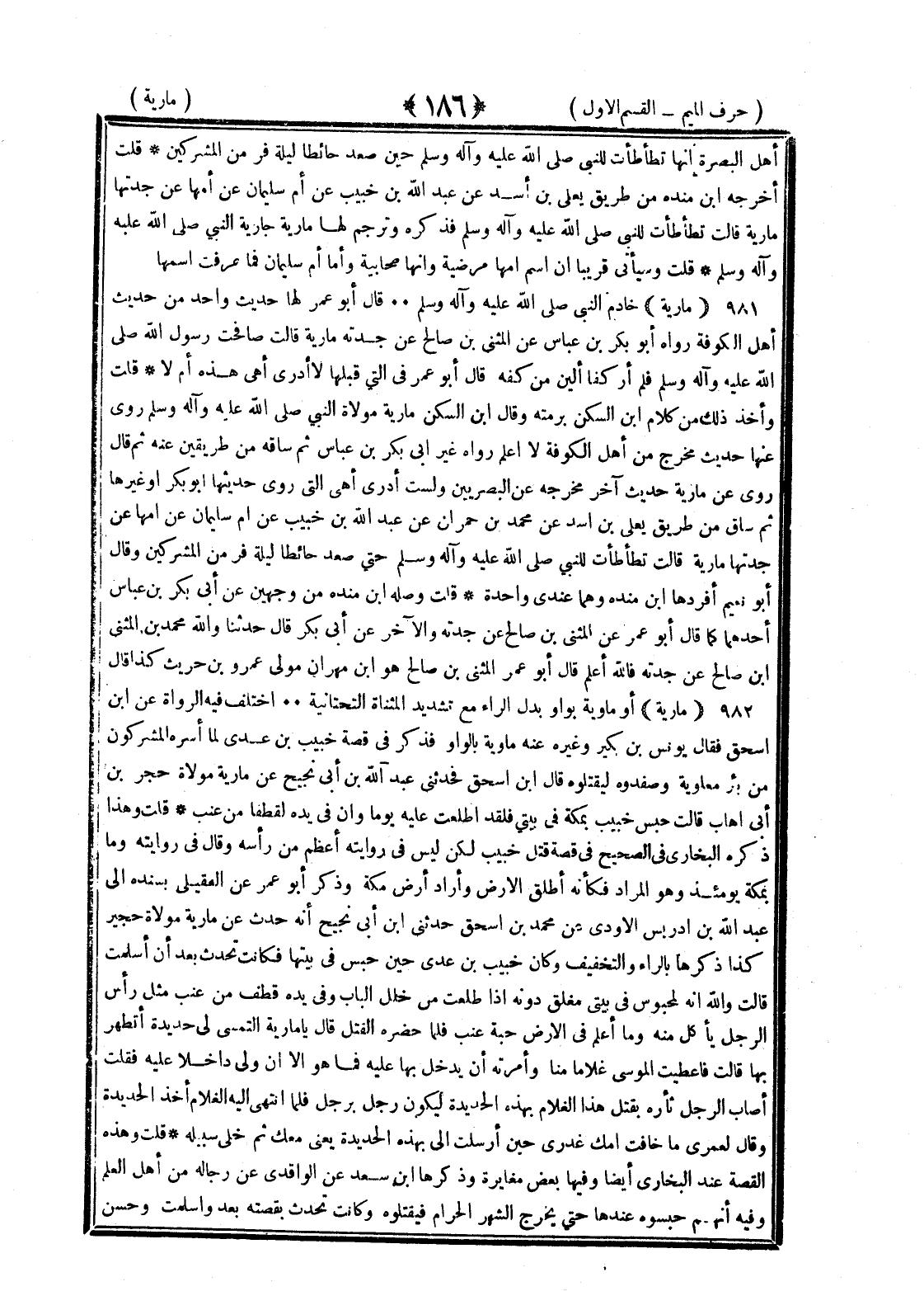 <186> أهل البصرة أنها تطأطأت للنبي صلى الله عليه وسلم حين صعد حائطا ليلة فر من المشركين قلت أخرجه بن منده من طريق يعلى بن أسد عن عبد الله بن حبيب عن أم سليمان عن أمها عن جدتها مارية قالت تطأطأت للنبي صلى الله عليه وسلم فذكره وترجم لها مارية جارية النبي صلى الله عليه وسلم قلت وسيأتي قريبا أن اسم أمها مرضية وأنها صحابية وأما أم سليمان فما عرفت اسمها مارية خادم النبي صلى الله عليه وسلم قال أبو عمر لها حديث واحد من حديث أهل الكوفة رواه أبو بكر بن عياش عن المثنى بن صالح عن جدته مارية قالت صافحت رسول الله صلى الله عليه وسلم فلم أر كفا ألين من كفه قال أبو عمر في التي قبلها لا أدري أهي هذه أم لا قلت وأخذ ذلك من كلام بن السكن برمته وقال بن السكن مارية مولاة النبي صلى الله عليه وسلم روي عنها حديث مخرج عن أهل الكوفة لا أعلم رواه غير بن عباس ثم ساقه من طريقين عنه ثم قال روي عن مارية حديث آخر مخرجه عن البصريين ولست أدري أهي التي روي حديثها أبو بكر أو غيرها ثم ساق من طريق يعلى بن أسد عن محمد بن حمران عن عبد الله بن حبيب عن أم سليمان عن أمها عن جدتها مارية قالت تطأطأت للنبي صلى الله عليه وسلم حتى صعد حائطا ليلة فر من المشركين وقال أبو نعيم أفردها بن منده وهما عندي واحدة قلت وصله بن منده من وجهين عن أبي بكر بن عياش أحدهما كما قال أبو عمر عن المثنى بن صالح عن جدته والآخر عن أبي بكر قال حدثنا والله محمد بن المثنى بن صالح عن جدته والله أعلم قال أبو عمر المثنى بن صالح هو بن مهران مولى عمرو بن حريث كذا قال مارية أو ماوية بواو بدل الراء مع تشديد المثناة التحتانية اختلف فيه الرواة عن بن إسحاق فقال يونس بن بكير وغيره عنه ماوية بالواو فذكر قصة خبيب بن عدي لما أسره المشركون من بئر معونة وصفدوه ليقتلوه قال بن إسحاق فحدثني عبد الله بن أبي نجيح عن مارية مولاة حجير بن أبي إهاب قالت حبس خبيب بمكة في بيتي فلقد اطلعت عليه يوما وإن في يده لقطفا من عنب أعظم من رأسه يأكل منه وما في الأرض يومئذ حبة عنب قلت وهذا ذكره البخاري في الصحيح في قصة قتل خبيب لكن ليس في روايته أعظم من رأسه وقال في روايته وما بمكة يومئذ وهو المراد فكأنه أطلق الأرض وأراد أرض مكة وذكر أبو عمر عن العقيلي بسنده إلى عبد الله بن إدريس الأودي عن محمد بن إسحاق حدثني بن أبي نجيح أنه حدث عن مارية مولاة حجير كذا ذكرها بالراء والتخفيف وكان خبيب بن عدي حين حبس في بيتها فكانت تحدث بعد أن أسلمت قالت والله إنه لمحبوس في بيتي مغلق دونه إذا طلعت من خلل الباب وفي يده قطف من عنب مثل رأس الرجل يأكل منه وما أعلم في الأرض حبة عنب فلما حضره القتل قال يا مارية التمسي لي حديدة أتطهر بها قالت فأعطيت الموسى غلاما منا وأمرته أن يدخل بها عليه فما هو إلا أن ولي داخلا عليه فقلت أصاب الرجل ثأره يقتل هذا الغلام بهذه الحديدة ليكون رجل برجل فلما الله انتهى إليه الغلام أخذ الحديدة وقال لعمري ما خافت أمك غدري حين أرسلت إلي بهذه الحديدة يعني معك ثم خلى سبيله وهذه القصة عند البخاري أيضا وفيها بعض مغايرة وذكره بن سعد عن الواقدي عن رجاله من أهل العلم وفيها أنهم حبسوه عندها حتى يخرج الشهر الحرام فيقتلوه وكانت تحدث بقصته بعد وأسلمت وحسن §