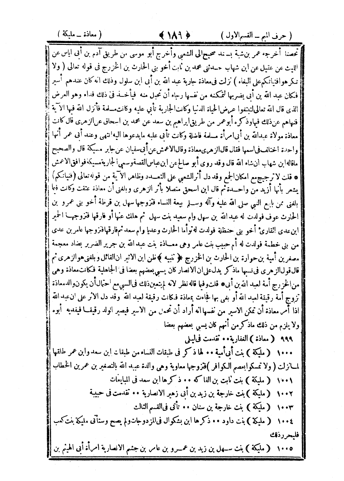 <189> تحصنا أخرجه عمر بن شبة بسند صحيح إلى الشعبي وأخرج أبو موسى من طريق آدم بن أبي إياس عن الليث عن عقيل عن بن شهاب حدثني محمد بن ثابت أخو بني الحارث بن الخزرج في قوله تعالى ولا تكرهوا فتياتكم على البغاء نزلت في معاذة جارية عبد الله بن أبي بن سلول وذلك أنه كان عندهم أسيرا فكان عبد الله بن أبي يضربها لتمكنه من نفسها رجاء أن تحبل منه فيأخذ في ذلك فداء وهو العرض الذي قال الله تعالى لتبتغوا عرض الحياة الدنيا وكانت الجارية تأبى عليه وكانت مسلمة فأنزل الله فيها الآية فنهاهم عن ذلك فيها وذكره أبو عمر من طريق إبراهيم بن سعد عن محمد بن إسحاق عن الزهري قال كانت معاذة مولاة عبد الله بن أبي امرأة مسلمة فاضلة وكانت تأبى عليه ما يدعوها إليه انتهى وعند أبي عمر أنهما واحدة واختلف في اسمها فقال قال الزهري معاذة وقال الأعمش عن أبي سفيان عن جابر مسيكة قال والصحيح ما قاله بن شهاب إن شاء الله قال وقد روى أبو صالح عن بن عباس القصة وسمي الجارية مسيكة فوافق الأعمش قلت لا ترجيح مع إمكان الجمع وقد دل أثر الشعبي على التعدد وظاهر الآية من قوله تعالى فتياتكم يشعر بأنها أزيد من واحدة ثم قال بن إسحاق متصلا بأثر الزهري وبلغني ممن بايع النبي صلى الله عليه وسلم بيعة النساء فتزوجها سهل بن قزظة أخو بني عمرو بن الحارث فولدت له عبد الله بن سهل وأم سعيد بنت سهل ثم هلك عنها أو فارقها فتزوجها الحمير بن عدي القاري أخو بني حنظلة فولدت له توأما الحارث وعديا وأم سعد ثم فارقها فتزوجها عامر بن عدي من بني خطمة فولدت له أم حبيب بنت عامر وهي معاذة بنت عبد الله بن جرير الضرير بضاد معجمة مصغرا بن أمية بن خدارة بن الحارث بن الخزرج تنبيه ظن بن الأثير أن القائل وبلغني هو الزهري ثم قال قول الزهري في نسبها ما ذكر يدل على أن الأنصار كان يسبي بعضهم بضعا في الجاهلية فكانت معاذة وهي من الخزرج أمة لعبد الله بن أبي قلت وفيما قاله نظر لأنه لم يتعين ذلك في السبي مع احتمال أن يكون والد معاذة تزوج أمة رقيقة لعبد الله أو بغي بها فجاءت بمعاذة فكانت رقيقة لعبد الله وقد دل الأثر على أن عبد الله إذ أمر معاذة أن تمكن الأسير من نفسها أنه أراد أن تحمل من الأسير فيصير الولد رقيقا فيفديه أبوه ولا يلزم من ذلك ما ذكر من أنهم كان يسبي بعضهم بعضا معاذة الغفارية تقدمت في ليلى مليكة بنت أبي أمية لها ذكر في طبقات النساء من طبقات بن سعد وأن عمر طلقها لما نزلت ولا تمسكوا بعصم الكوافر فتزوجها معاوية وهي والدة عبيد الله بالتصغير بن عمر بن الخطاب مليكة بنت ثابت بن الفاكه ذكرها بن سعد في المبايعات مليكة بنت خارجة بن زيد بن أبي زهير الأنصارية تقدمت في حبيبة مليكة بنت خارجة بن سنان تأتي في القسم الثالث مليكة بنت داود ذكرها بن يشكوال في المزدوجات ولم يصح وستأتي مليكة بنت كعب فليحرر ذلك مليكة بنت سهل بن زيد بن عمرو بن عامر بن جشم الأنصارية امرأة أبي الهيثم بن §
