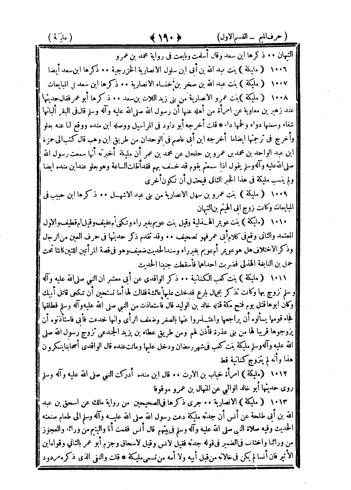 <190> التيهان ذكرها بن سعد وقال أسلمت وبايعت في رواية محمد بن عمر مليكة بنت عبد الله بن أبي بن سلول الأنصارية الخزرجية ذكرها بن سعد أيضا مليكة بنت عبد الله بن صخر بن خنساء الأنصارية ذكرها بن سعد في المبايعات مليكة بنت عمرو الأنصارية من بني زيد اللات بن سعد ذكرها أبو عمر فقال حديثها عند زهير بن معاوية عن امرأة من أهله عنها أن رسول الله صلى الله عليه وسلم قال في البقرة ألبانها شفاء وسمنها دواء ولحمها داء قلت أخرجه أبو داود في المراسيل ووصله بن منده ووقع لنا عنه بعلو وأخرج في ترجمتها أيضا ما أخرجه بن أبي عاصم في الوحدان من طريق بن وهب قال كتب إلي حمزة بن عبد الواحد بن محمد بن عمرو بن حلحل عن محمد بن عمر أن مليكة أخبرته أنها سمعت رسول الله صلى الله عليه وسلم يقول إذا سمعتم بقوم قد خسف بهم فقد أظلت الساعة وهو بعلو عند بن منده أيضا ولم ينسب مليكة في هذا الخبر الثاني فيحتمل أن تكون أخرى مليكة بنت عمرو بن سهل الأنصارية من بني عبد الأشهل ذكرها بن حبيب في المبايعات وكانت زوج أبي الهيثم بن التيهان مليكة بنت عويمر الهذلية وقيل بنت عويم بغير راء وتكنى أم عفيف وقيل أم عويم قطيف والأول المعتمد والثاني وقع في كلام أبي عمر فهو تصحيف وقد تقدم ذكر حديثها في حرف العين من الرجال وذكر الاختلاف هل هو عويمر أم عويم بغير راء وسند الحديث ضعيف وهو في قصة المرأتين اللتين كانتا تحت حمل بن النابغة الهذلي فضربت إحداهما الأخرى فأسقطت جنينا الحديث مليكة بنت كعب الكنانية ذكر الواقدي عن أبي معشر أن النبي صلى الله عليه وسلم تزوج بها وكانت تذكر بجمال بارع فدخلت عليها عائشة فقالت لها أما تستحين أن تنكحي قاتل أبيك وكان أبوها قتل يوم فتح مكة قتله خالد بن الوليد قال فاستعاذت من النبي صلى الله عليه وسلم فطلقها فجاء قومها يسألونه أن يراجعها واعتذروا عنها بالصغر وضعف الرأي وأنها خدعت فأبى فاستأذنوه أن يزوجها قريبا لها من بني عذرة فأذن لهم ومن طريق عطاء بن يزيد الجندعي تزوج رسول الله صلى الله عليه وسلم مليكة بنت كعب في شهر رمضان ودخل عليها وماتت عنده قال الواقدي أصحابنا ينكرون هذا وأنه لم يتزوج كنانية قط مليكة امرأة خباب بن الأرت قال بن منده أدركت النبي صلى الله عليه وسلم روى حديثها أبو خالد الوالبي عن المنهال بن عمرو موقوفا مليكة الأنصارية جرى ذكرها في الصحيحين من رواية مالك عن إسحاق بن عبد الله بن أبي طلحة عن أنس أن جدته مليكة دعت رسول الله صلى الله عليه وسلم إلى طعام صنعته الحديث وفيه صلاة النبي صلى الله عليه وسلم في بيتهم قال أنس فقمت أنا واليتيم من ورائه والعجوز من ورائنا واختلف في الضمير في قوله جدته فقيل لأنس وقيل لإسحاق وجزم أبو عمر بالثاني وقواه بن الأثير فإن أنسا لم يكن في خالاته من قبل أبيه ولا أمه من تسمى مليكة قلت والنفي الذي ذكره مردود §