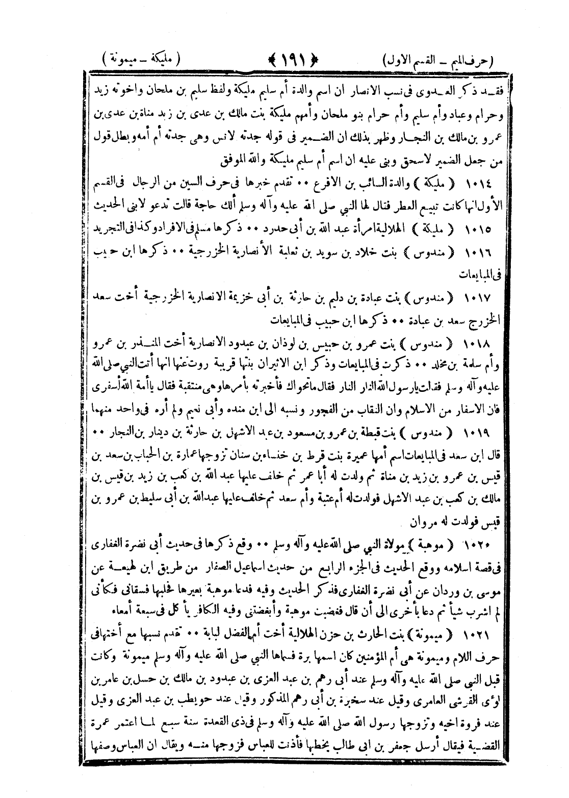 <191> فقد ذكر العدوي في نسب الأنصار أن اسم والدة أم سليم مليكة ولفظه سليم بن ملحان وإخوته زيد وحرام وعباد وأم سليم وأم حرام بنو ملحان وأمهم مليكة بنت مالك بن عدي بن زيد مناة بن عدي بن عمرو بن مالك بن النجار وظهر بذلك أن الضمير في قوله جدته لأنس وهي جدته أم أمه وبطل قول من جعل الضمير لإسحاق وبنى عليه أن اسم أم سليم مليكة والله الموفق مليكة والدة السائب بن الأقرع تقدم خبرها في حرف السين من الرجال في القسم الأول أنها كانت تبيع العطر فقال لها النبي صلى الله عليه وسلم ألك حاجة قالت تدعو لابني الحديث مليكة الهلالية امرأة عبد الله بن أبي حدرد ذكرها مسلم في الأفراد وكذا في التجريد مندوس بنت خلاد بن سويد بن ثعلبة الأنصارية الخزرجية ذكرها بن حبيب في المبايعات مندوس بنت عبادة بن دليم بن حارثة بن أبي خزيمة الأنصارية الخزرجية أخت سيد الخزرج سعد بن عبادة ذكرها بن حبيب في المبايعات مندوس بنت عمرو بن خنيس بن لوذان بن عبد ود الأنصارية أخت المنذر بن عمرو وأم سلمة بن مخلد ذكرت في المبايعات وذكر بن الأثير أن بنتها قريبة روت عنها أنها أتت النبي صلى الله عليه وسلم فقالت يا رسول الله النار فقال ما فحواك فأخبرته بأمرها وهي منتقبة فقال يا أمة الله أسفري فإن الإسفار من الإسلام وإن النقاب من الفجور ونسبه إلى بن منده وأبي نعيم ولم أره في واحد منهما مندوس بنت قطبة بن عمرو بن مسعود بن عبد الأشهل بن حارثة بن دينار بن النجار قال بن سعد في المبايعات اسم أمها عميرة بنت قرط بن خنساء بن سنان تزوجها عمارة بن الحباب بن سعد بن قيس بن عمرو بن زيد مناة ثم ولدت له أبا عمرو ثم خلف عليها عبد الله بن كعب بن زيد بن قيس بن مالك بن كعب بن عبد الأشهل فولدت له أم عتبة وأم سعد ثم خلف عليها عبد الله بن أبي سليط بن عمرو بن قيس فولدت له مروان موهبة مولاة النبي صلى الله عليه وسلم وقع ذكرها في حديث أبي نضرة الغفاري في قصة إسلامه ووقع الحديث في الجزء الرابع من حديث إسماعيل الصفار من طريق بن لهيعة عن موسى بن وردان عن أبي نضرة الغفاري فذكر الحديث وفيه فدعا موهبة بعيرا منها فحلبها فسقاني فكأني لم أشرب شيئا ثم دعا بأخرى إلى أن قال فغضبت موهبة وأبغضتني وفيه الكافر يأكل في سبعة أمعاء ميمونة بنت الحارث بن حزن الهلالية أخت أم الفضل لبابة تقدم نسبها مع أختها في حرف اللام وميمونة في أم المؤمنين كان اسمها برة فسماها النبي صلى الله عليه وسلم ميمونة وكانت قبل النبي صلى الله عليه وسلم عند أبي رهم بن عبد العزي بن عبد ود بن مالك بن حسل بن عامر بن لؤي القرشي العامري وقيل عند سخبرة بن أبي رهم المذكور وقيل عند حويطب بن عبد العزي وقيل عند فروة أخيه وتزوجها رسول الله صلى الله عليه وسلم في ذي القعدة سنة سبع لما اعتمر عمرة القضية فيقال أرسل جعفر بن أبي طالب يخطبها فأذنت للعباس فزوجها منه ويقال إن العباس وصفها §