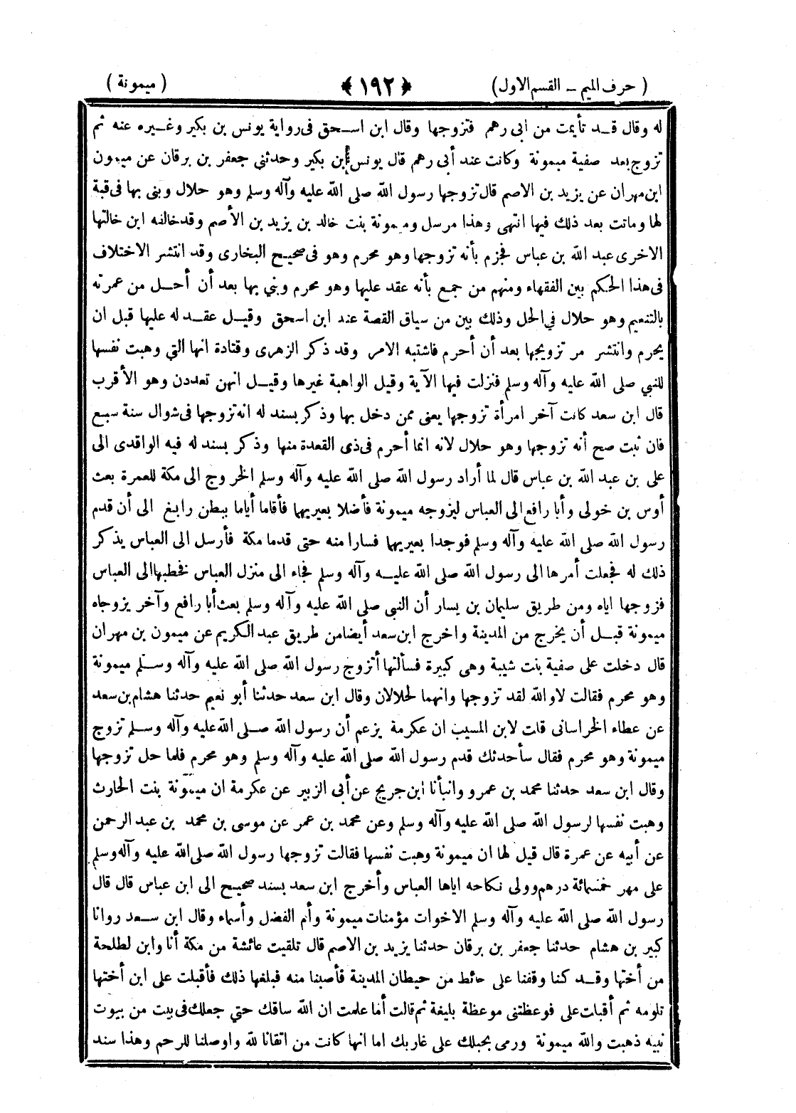 <192> له وقال قد تأيمت من أبي رهم فتزوجها وقال بن إسحاق في رواية يونس بن بكير وغيره عنه ثم تزوج بعد صفية ميمونة وكانت عند أبي رهم قال يونس بن بكير وحدثني جعفر بن برقان عن ميمون بن مهران عن يزيد بن الأصم قال تزوجها رسول الله صلى الله عليه وسلم وهو حلال وبني بها في قبة لها وماتت بعد ذلك فيها انتهى وهذا مرسل عن ميمونة بنت خالد بن يزيد بن الأصم وقد خالفه بن خالتها الأخرى عبد الله بن عباس فجزم بأنه تزوجها وهو محرم وهو في صحيح البخاري وقد انتشر الاختلاف في هذا الحكم بين الفقهاء ومنهم من جمع بأنه عقد عليها وهو محرم وبني بها بعد أن أحل من عمرته بالتنعيم وهو حلال في الحل وذلك بين من سياق القصة عند بن إسحاق وقيل عقد له عليها قبل أن يحرم وانتشر أمر تزويجها بعد أن أحرم فاشتبه الأمر وقد ذكر الزهري وقتادة أنها التي وهبت نفسها للنبي صلى الله عليه وسلم فنزلت فيها الآية وقيل الواهبة غيرها وقيل إنهن تعددن وهو الأقرب قال بن سعد كانت آخر امرأة تزوجها يعني ممن دخل بها وذكر بسند له أنه تزوجها في شوال سنة سبع فإن ثبت صح أنه تزوجها وهو حلال لأنه إنما أحرم في ذي القعدة منها وذكر بسند له فيه الواقدي إلى علي بن عبد الله بن عباس قال لما أراد رسول الله صلى الله عليه وسلم الخروج إلى مكة للعمرة بعث أوس بن خولي وأبا رافع إلى العباس ليزوجه ميمونة فاضلا بعيرهما فأقاما أياما ببطن رابغ إلى أن قدم رسول الله صلى الله عليه وسلم فوجدا بعيريهما فسارا معه حتى قدما مكة فأرسل إلى العباس يذكر ذلك له فجعلت أمرها إلى رسول الله صلى الله عليه وسلم فجاء إلى منزل العباس فخطبها إلى العباس فزوجها إياه ومن طريق سليمان بن يسار أن النبي صلى الله عليه وسلم بعث أبا رافع وآخر يزوجانه ميمونة قبل أن يخرج من المدينة وأخرج بن سعد أيضا من طريق عبد الكريم عن ميمون بن مهران قال دخلت على صفية بنت شيبة وهي كبيرة فسألتها أتزوج رسول الله صلى الله عليه وسلم ميمونة وهو محرم فقالت لا والله لقد تزوجها وإنهما لحلالان وقال بن سعد حدثنا أبو نعيم حدثنا هشام بن سعد عن عطاء الخراساني قلت لابن المسيب إن عكرمة يزعم أن رسول الله صلى الله عليه وسلم تزوج ميمونة وهو محرم فقال سأحدثك قدم رسول الله صلى الله عليه وسلم وهو محرم فلما حل تزوجها وقال بن سعد حدثنا محمد بن عمر وأنبأنا بن جريج عن أبي الزبير عن عكرمة أن ميمونة بنت الحارث وهبت نفسها لرسول الله صلى الله عليه وسلم وعن محمد بن عمر عن موسى بن محمد بن عبد الرحمن عن أبيه عن عمرة قال قيل لها إن ميمونة وهبت نفسها فقالت تزوجها رسول الله صلى الله عليه وسلم على مهر خمسمائة درهم وولي نكاحه إياها العباس وأخرج بن سعد بسند صحيح إلى بن عباس قال قال رسول الله صلى الله عليه وسلم الأخوات مؤمنات ميمونة وأم الفضل وأسماء وقال بن سعد أخبرنا كثير بن هشام حدثنا جعفر بن برقان حدثنا يزيد بن الأصم قال تلقيت عائشة من مكة أنا وابن طلحة من أختها وقد كنا وقعنا على حائظ من حيطان المدينة فأصبنا منه فبلغها ذلك فأقبلت على بن أختها تلومه ثم أقبلت علي فوعظتني موعظة بليغة ثم قالت أما علمت أن الله ساقك حتى جعلك في بيت من بيوت نبيه ذهبت والله ميمونة ورمى بحبلك على غاربك أما أنها كانت من أتقانا لله وأوصلنا للرحم وهذا سند §