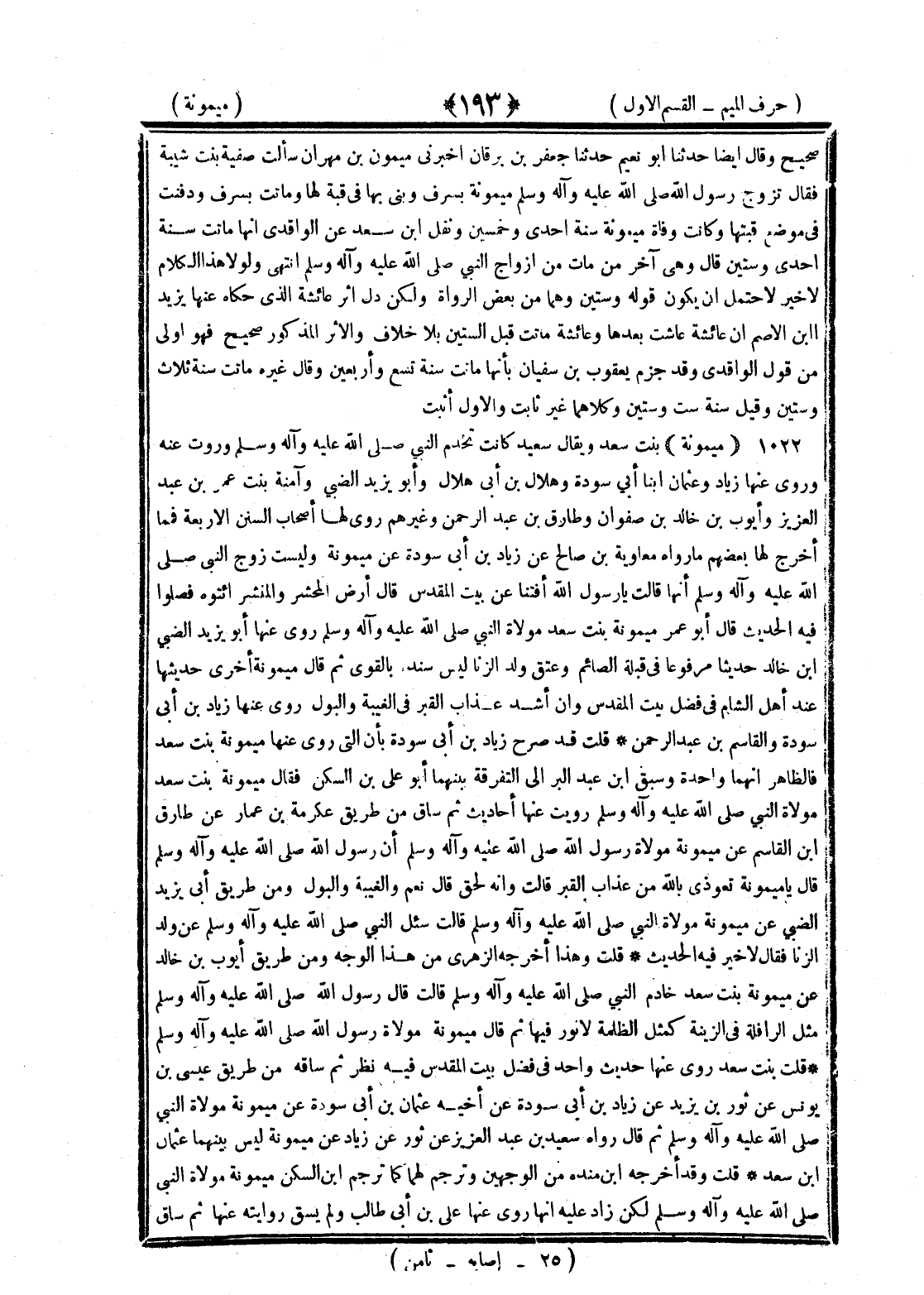<193> صحيح وقال أيضا حدثنا أبو نعيم حدثنا جعفر بن برقان أخبرني ميمون بن مهران سألت صفية بنت شيبة فقالت تزوج رسول الله صلى الله عليه وسلم ميمونة بسرف وبنى بها في قبة لها وماتت بسرف ودفنت في موضع قبتنا وكانت وفاة ميمونة سنة إحدى وخمسين ونقل بن سعد عن الواقدي أنها ماتت سنة إحدى وستين قال وهي آخر من مات من أزواج النبي صلى الله عليه وسلم انتهى ولولا هذا الكلام الأخير لاحتمل أن يكون قوله وستين وهما من بعض الرواة ولكن دل أثر عائشة الذي حكاه عنها يزيد بن الأصم أن عائشة ماتت قبل الستين بلا خلاف والأثر المذكور صحيح فهو أولى من قول الواقدي وقد جزم يعقوب بن سفيان بأنها ماتت سنة تسع وأربعين وقال غيره ماتت سنة ثلاث وستين وقيل سنة ست وستين وكلاهما غير ثابت والأول أثبت ميمونة بنت سعد ويقال سعيد كانت تخدم النبي صلى الله عليه وسلم وروت عنه وروى عنها زياد وعثمان ابنا أبي سودة وهلال بن أبي هلال وأبو يزيد الضبي وآمنة بنت عمر بن عبد العزيز وأيوب بن خالد بن صفوان وطارق بن عبد الرحمن وغيرهم روى لها أصحاب السنن الأربعة مما أخرج لها بعضهم ما رواه معاوية بن صالح عن زياد بن أبي سودة عن ميمونة وليست زوج النبي صلى الله عليه وسلم أنها قالت يا رسول الله أفتنا عن بيت المقدس قال أرض المحشر والمنشر إئتوه فصلوا فيه الحديث قال أبو عمر ميمونة بنت سعد مولاة النبي صلى الله عليه وسلم روى عنها أبو يزيد الضبي بن خالد حديثا مرفوعا في قبلة الصائم وعتق ولد الزنا وليس سنده بالقوي ثم قال ميمونة أخرى حديثها عند أهل الشام في فضل بيت المقدس وإن أشد عذاب القبر في الغيبة والبول روى عنها زياد بن أبي سودة والقاسم بن عبد الرحمن قلت قد صرح زياد بن أبي سودة بأن التي روى عنها ميمونة بنت سعد فالظاهر أنهما واحدة وسبق بن عبد البر إلى التفرقة بينهما أبو علي بن السكن فقال ميمونة بنت سعد مولاة النبي صلى الله عليه وسلم رويت عنها أحاديث ثم ساق من طريق عكرمة بن عمار عن طارق بن القاسم عن ميمونة مولاة رسول الله صلى الله عليه وسلم أن رسول الله صلى الله عليه وسلم قال يا ميمونة تعوذي بالله من عذاب القبر قالت وإنه لحق قال نعم والغيبة والبول من طريق أبي يزيد الضبي عن ميمونة مولاة النبي صلى الله عليه وسلم قالت سئل النبي صلى الله عليه وسلم عن ولد الزنا فقال لا خير فيه الحديث قلت وهذا أخرجه الزهري من هذا الوجه ومن طريق أيوب بن خالد عن ميمونة بنت سعد خادم النبي صلى الله عليه وسلم قالت قال رسول الله صلى الله عليه وسلم مثل الرافلة في الزينة كمثل الظلمة لا نور فيها ثم قال ميمونة مولاة رسول الله صلى الله عليه وسلم قلت بنت سعد روى عنها حديث واحد في فضل بيت المقدس فيه نظر ثم ساقه من طريق عيسى بن يونس عن ثور بن يزيد عن زياد بن أبي سودة عن أخيه عثمان بن أبي سودة عن ميمونة مولاة النبي صلى الله عليه وسلم وعلى آله وسلم ثم قال رواه سعيد بن عبد العزيز عن ثور عن زياد عن ميمونة ليس بينهما عثمان بن سعد قلت وقد أخرجه بن منده من الوجهين وترجم لهما كما ترجم بن السكن ميمونة مولاة النبي صلى الله عليه وسلم ولكن زاد عليه أنها روي عنها علي بن أبي طالب ولم يسق روايته عنها ثم ساق §