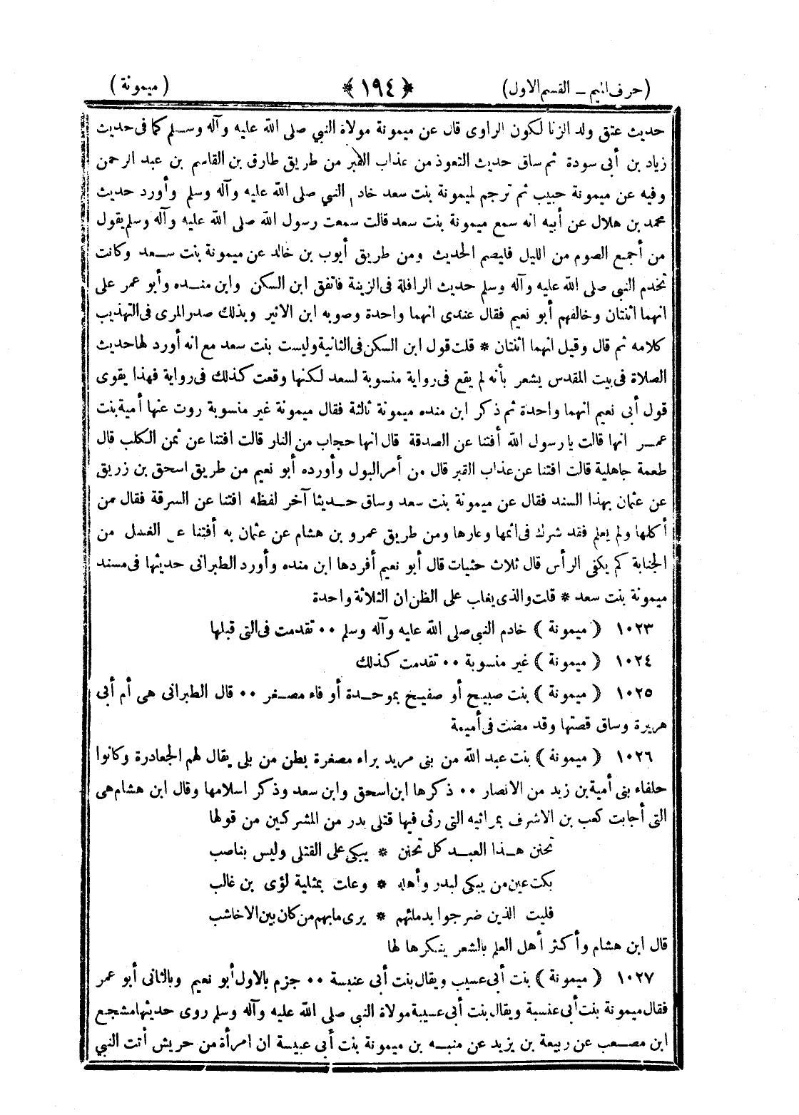 <194> حديث عتق ولد الزنا لكون الراوي قال عن ميمونة مولاة النبي صلى الله عليه وسلم كما في حديث التعوذ من عذاب القبر من طريق طارق بن القاسم بن عبد الرحمن وفيه عن ميمونة بنت حبيب ثم ترجم لميمونة بنت سعد خادم النبي صلى الله عليه وسلم وأورد حديث محمد بن هلال عن أبيه أنه سمع ميمونة بنت سعد قالت سمعت رسول الله صلى الله عليه وسلم يقول من أجمع الصوم من الليل فليصم الحديث ومن طريق أيوب بن خالد عن ميمونة بنت سعد وكانت تخدم النبي صلى الله عليه وسلم حديث حديث الرافلة في الزينة فاتفق بن السكن وابن منده وأبو عمر على أنهما اثنتان وخالفهم أبو نعيم فقال عندي أنهما واحدة وصوبه بن الأثير وبذلك صدر المزي في التهذيب كلامه ثم قال وقيل إنهما اثنتان قلت قول بن السكن في الثانية وليست بنت سعد مع أنه أورد لها حديث الصلاة في بيت المقدس يشعر بأنه لم يقع في رواية أخرجه فهذا يقوي قول أبي نعيم إنهما واحدة ثم ذكر بن منده ميمونة ثالثة فقال ميمونة غير منسوبة روت عنها أمية بنت عمر أنها قالت يا رسول الله أفتنا عن الصدقة قال أنها حجاب من النار قالت أفتنا عن ثمن الكلب قال طعمة جاهلية قالت أفتنا عن عذاب القبر قال من أمر البول وأورده أبو نعيم من طريق إسحاق بن زريق عن عثمان بهذا السند فقال عن ميمونة بنت سعد وساق حديثا آخر لفظه أفتنا عن السرقة فقال من أكلها ولم يعلم فقد شرك في إثمها وعارها ومن طريق عمرو بن هشام عن عثمان به أفتنا عن الغسل من الجنابة كم يكفي الرأس قال ثلاث حثيات قال أبو نعيم أفردها بن منده وأورد الطبراني حديثهما في مسند ميمونة بنت سعد قلت والذي يغلب على الظن أن الثلاثة واحدة ميمونة خادم النبي صلى الله عليه وسلم تقدمت في التي قبلها ميمونة غير منسوبة تقدمت كذلك ميمونة بنت صبيح أو صفيح بموحدة أو فاء مصغرة قال الطبراني هي أم أبي هريرة وساق قصتها وقد مضت في أميمة ميمونة بنت عبد الله من بني مريد براء مصغرة بطن من بلي يقال لهم الجعادرة وكانوا حلفاء بني أمية بن زيد من الأنصار ذكرها بن إسحاق وابن سعد وذكر إسلامها وقال بن هشام هي التي أجابت كعب بن الأشرف بمراثيه التي رثي فيها قتلى بدر من المشركين من قولها تحنن هذا العبد كل تحنن يبكي على القتلى وليس بناصب بكت عين من يبكي لبدر وأهله وعلت بمثليه لؤي بن غالب فليت الذين ضرجوا بدمائهم يرى ما بهم من كان بين الأخاشب قال بن هشام وأكثر أهل العلم بالشعر ينكرها لها ميمونة بنت أبي عسيب ويقال بنت عنبسة جزم بالأول أبو نعيم وبالثاني أبو عمر فقال ميمونة بنت أبي عنبسة مولاة النبي صلى الله عليه وسلم روت عنه في الدعاء وقال بن منده ميمونة بنت عنبسة ويقال بنت أبي عنبسة مولاة النبي صلى الله عليه وسلم روى حديثها مشجع بن مصعب عن ربيعة بن يزيد عن منبه عن ميمونة بنت أبي عنبسة أن امرأة من حريش أتت النبي §