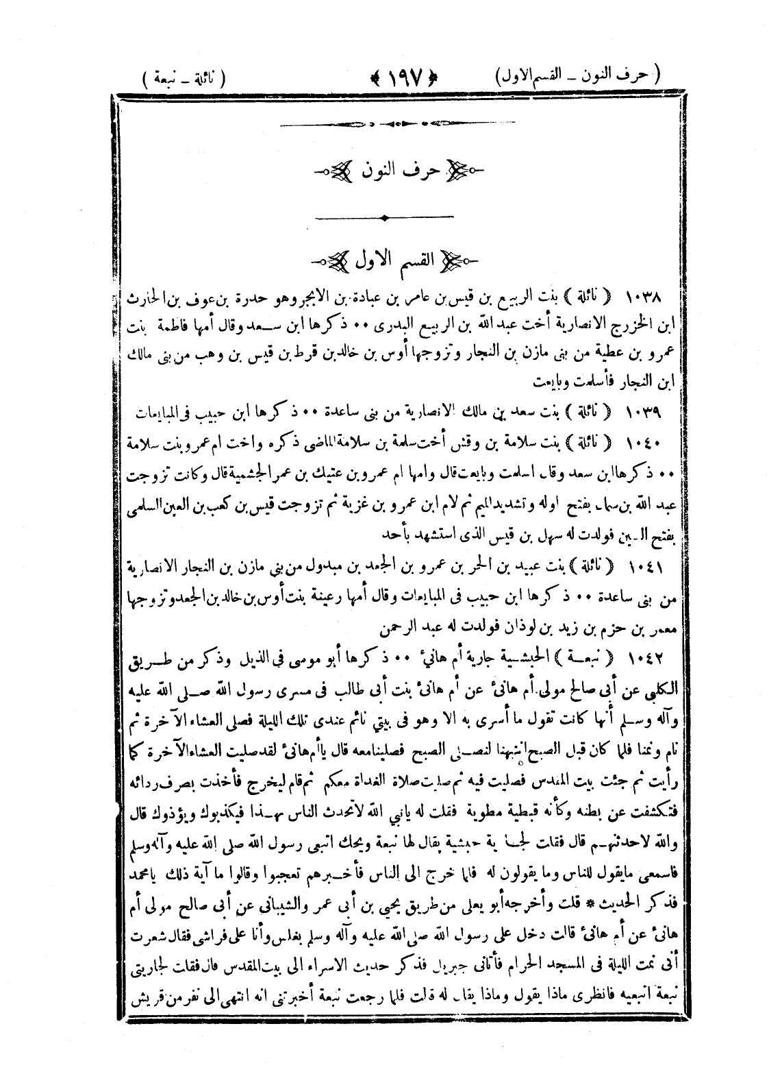 نائلة بنت الربيع بن قيس بن عامر بن عبادة بن الأبجر وهو خدرة بن عوف بن الحارث بن الخزرج الأنصارية أخت عبد الله بن الربيع البدري ذكرها بن سعد وقال أمها فاطمة بنت عمرو بن عطية من بني مازن بن النجار وتزوجها أوس بن خالد بن قرط بن قيس بن وهب من بني مالك بن النجار فأسلمت وبايعت نائلة بنت سعد بن مالك الأنصارية من بني ساعدة ذكرها بن حبيب في المبايعات نائلة بنت سلامة بن وقش أخت سلمة بن سلامة الماضي ذكره وأخت أم عمرو بنت سلامة ذكرها بن سعد وقال أسلمت وبايعت قال وأمها أم عمرو بنت عتيك بن عمرو الجشمية قال وكانت تزوجت عبد الله بن سمال بفتح أوله وتشديد الميم ثم لام بن عمرو بن عزية ثم تزوجت قيس بن كعب بن القين السلمي بفتح السين فولدت له سهل بن قيس الذي استشهد بأحد نائلة بنت عبيد بن الحر بن عمرو بن الجعد بن مبذول من بني مازن بن النجار الأنصارية من بني ساعدة ذكرها بن حبيب في المبايعات وقال أمها رغيبة بنت أوس بن خالد بن الجعد وتزوجها معمر بن حزم بن زيد بن لوذان فولدت له عبد الرحمن نبعة الحبشية جارية أم هانئ ذكرها أبو موسى في الذيل وذكر من طريق الكلبي عن أبي صالح مولى أم هانئ بنت أبي طالب في مسرى رسول الله صلى الله عليه وسلم أنها كانت تقول ما أسرى به إلا وهو في بيتي نائم عندي تلك الليلة فصلى العشاء الآخرة ثم نام ونمنا فلما كان الصبح انتبهنا لنصلي الصبح فصلينا معه قال يا أم هانئ لقد صليت العشاء الآخرة كما رأيت ثم جئت بيت المقدس فصليت فيه ثم صليت صلاة الغداة معكم ثم قام ليخرج فأخذت بطرف ردائه فتكشفت عن بطنه وكأنه قبطي مطوية فقلت له يا نبي الله لا تحدث الناس بهذا فيكذبوك ويؤذوك قال والله لأحدثنهم قال فقلت لجارية حبشية يقال لها نبعة ويحك اتبعي رسول الله صلى الله عليه وسلم فاسمعي ما يقول للناس وما يقولون له فلما خرج إلى الناس فأخبرهم تعجبوا وقالوا ما آية ذلك يا محمد فذكر الحديث قلت وأخرجه أبو يعلى من طريق يحيى بن أبي عمرو الشيباني عن أبي صالح مولى أم هانئ عن أم هانئ قالت دخل علي رسول الله صلى الله عليه وسلم بغلس وأنا على فراشي فقال شعرت أني نمت الليلة في المسجد الحرام فأتاني جبريل فذكر حديث الإسراء إلى بيت المقدس قال فقلت لجاريتي نبعة اتبعيه فانظري ماذا يقول وماذا يقال له قالت فلما رجعت نبعة أخبرتني أنه انتهى إلى نفر من قريش §