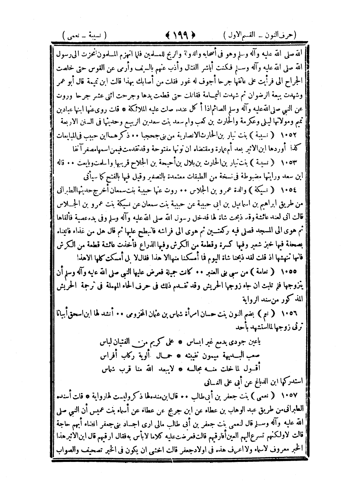 <199> الله صلى الله عليه وسلم وهو في أصحابه والدولة والريح للمسلمين فلما انهزم المسلمون انحزت إلى رسول الله صلى الله عليه وسلم فكنت أباشر القتال وأذب عنهم بالسيف وأرمي عن القوس حتى خلصت الجراح إلي فرأيت على عاتقها جرحا أجوف له غور فقلت من أصابك بهذا قالت بن قميئة قال أبو عمر وشهدت بيعة الرضوان ثم شهدت اليمامة فقاتلت حتى قطعت يدها وجرحت اثنا عشر جرحا وروت عن النبي صلى الله عليه وسلم الصائم إذا أكل عنده صلت عليه الملائكة قلت روى عنها ابنها عباد بن تميم ومولاتها ليلى وعكرمة والحارث بن كعب وأم سعد بن الربيع وحديثها في السنن الأربعة نسيبة بنت نيار بن الحارث الأنصارية من بني جحجبي ذكرها بن حبيب في المبايعات كذا أوردها بن الأثير بعد أم عمارة ومقتضاة أن نونها مفتوحة وقد تقدمت فيمن اسمها مصغر آنفا نسيبة بنت نيار بن الحارث بن بلال بن أحيحة بن الجلاح الأنصارية تزوجها عقبة بن عبد ود بن عقبة بن أحيحة بن الجلاح قريبها وأسلمت وبايعت قاله بن سعد ورأيتها مضبوطة في نسخة من الطبقات معتمده بالتصغير وقيل فيها بالفتح كما سيأتي نسيكة والدة عمرو بن الجلاس روت عنها حبيبة بنت سمعان أخرج حديثها الطبراني من طريق إبراهيم بن إسماعيل بن أبي حبيبة عن حبيبة بنت سمعان عن نسيكة بنت عمرو بن الجلاس قالت أني لعند عائشة وقد ذبحت شاة لها فدخل رسول الله صلى الله عليه وسلم وفي يده عصية فألقاها ثم هوى إلى المسجد فصلى فيه ركعتين ثم هوى إلى فراشه فانبطح عليه ثم قال هل من غذاء فأتيناه بصحفة فيها خبز شعير وفيها كسرة وقطعة من الكرش وفيها الذراع فأخذت عائشة قطعة من الكرش فإنها تنهشها إذ قلت لقد ذبحنا شاة اليوم فما أمسكنا منها إلا هذا فقال لا بلى أمسكت كلها إلا هذا نعامة من سبي بني العنبر كانت جميلة فعرض عليها النبي صلى الله عليه وسلم أن يتزوجها فلم تلبث أن جاء زوجها الحريش وقد تقدم ذلك في حرف الحاء المهملة في ترجمة الحريش المذكور مسند الرواية نعم بضم النون بنت حسان امرأة شماس بن عثمان المخزومي أنشد لها بن إسحاق أبياتا ترثي زوجها لما استشهد بأحد يا عين جودي بدمع غير إبساس على كريم من الفتيان لباس صعب البديهة ميمون نقيبته حمال ألوية ركاب أفراس أقول لما خلت منه مجالسه لا يبعد الله منا قرب شماس استدركها بن الدباغ عن أبي علي الغساني نعمي بنت جعفر بن أبي طالب قال بن منده لها ذكر وليست لها رواية قلت أسنده الطبراني من طريق عبد الوهاب بن عطاء عن بن جريج عن عطاء عن أسماء بنت عميس أن النبي صلى الله عليه وسلم قال لنعمي بنت جعفر بن أبي طالب مالي أرى أجساد بني جعفر أنضاء أبهم حاجة قالت لا ولكنهم تسرع إليهم العين أفأرقيهم قالت فعرضت عليه كلاما لا بأس به فقال أرقيهم قال بن الأثير هذا الخبر معروف لأسماء ولا أعرف هذه في أولاد جعفر قلت أخشى أن يكون في الخبر تصحيف والصواب §