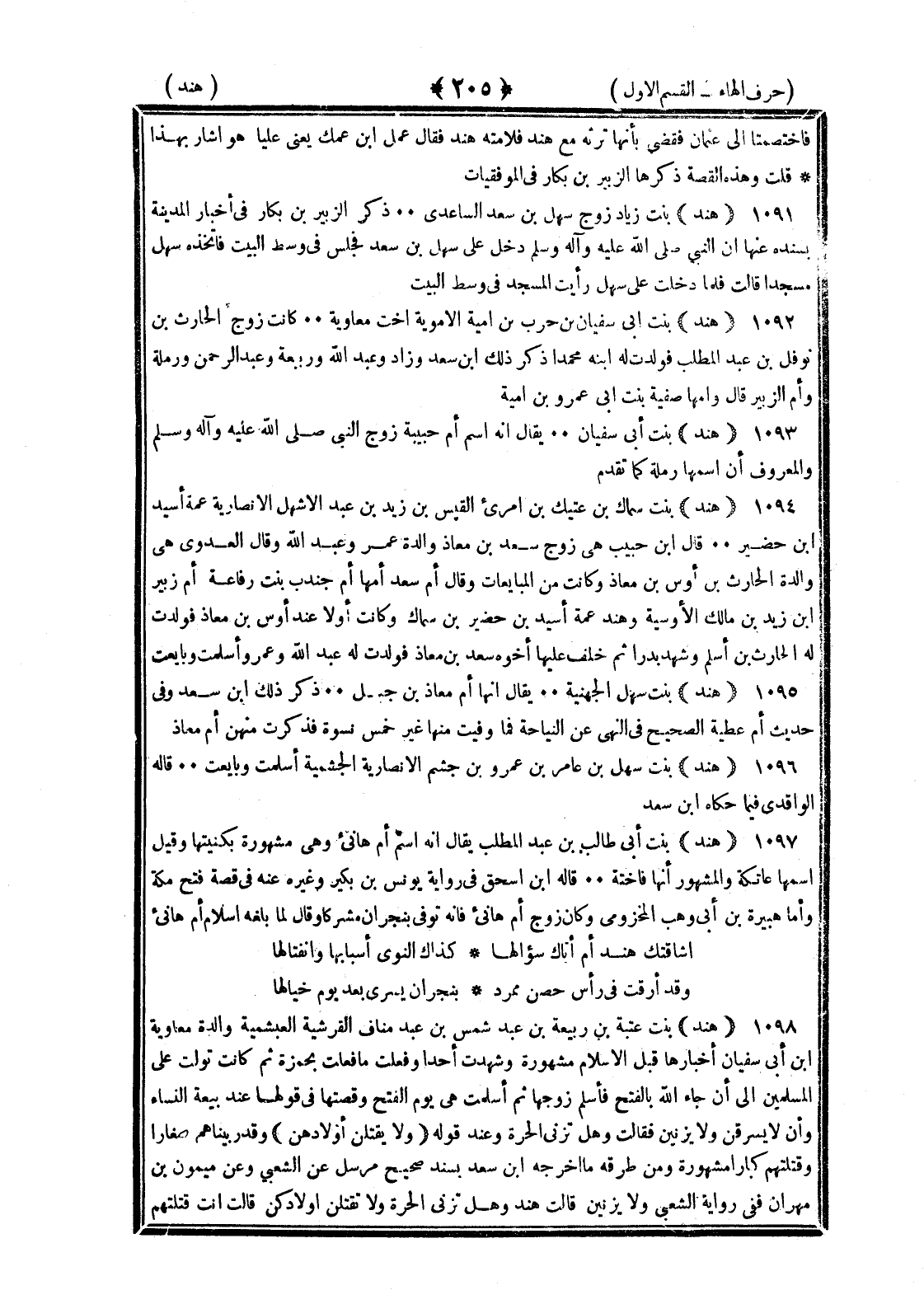 <205> فاختصمتا إلى عثمان فقضى بأنها ترثه مع هند فلامته هند فقال عمل بن عمك يعني عليا هو أشار بهذا قلت وهذه القصة ذكرها الزبير بن بكار في الموفقيات هند بنت زياد زوج سهل بن سعد الساعدي ذكر الزبير بن بكار في أخبار المدينة بسنده عنها أن النبي صلى الله عليه وسلم دخل على سهل بن سعد فجلس في وسط البيت فاتخذه سهل مسجدا قلت فلما دخلت على سهل رأيت المسجد في وسط البيت هند بنت أبي سفيان بن حرب بن أمية الأموية أخت معاوية كانت زوج الحارث بن نوفل بن عبد المطلب فولدت له ابنه محمدا ذكر ذلك بن سعد وزاد وعبد الله وربيعة وعبد الرحمن ورملة وأم الزبير قال وأمها صفية بنت أبي عمرو بن أمية هند بنت أبي سفيان يقال إنه اسم أم حبيبة زوج النبي صلى الله عليه وسلم والمعروف أن اسمها رملة كما تقدم هند بنت سماك بن عتيك بن امرئ القيس بن زيد بن عبد الأشهل الأنصارية عمه أسيد بن حضير قال بن حبيب هي زوج سعد بن معاذ والدة عمر وعبد الله وقال العدوي هي والدة الحارث بن أوس بن معاذ وكانت من المبايعات وقال بن سعد أمها أم جندب بنت رفاعة أم زنبر بن زيد بن مالك الأوسية وهند عمة أسيد بن حضير بن سماك وكانت أولا عند أوس بن معاذ فولدت له الحارث بن أسلم وشهد بدرا ثم خلف عليها أخوه سعد بن معاذ فولد له عبد الله وعمر وأسلمت وبايعت هند بنت سهل الجهنية يقال أنها أم معاذ بن جبل ذكر ذلك بن سعد وفي حديث أم عطية الصحيح في النهي عن النياحة فما وفت منهن غير خمس نسوة فذكرت منهن أم معاذ هند بنت سهل بن عمرو بن جشم الأنصارية الجشمية أسلمت وبايعت قاله الواقدي فيما حكاه بن سعد هند بنت أبي طالب بن عبد المطلب يقال أنه اسم أم هانئ وهي مشهورة بكنيتها وقيل اسمها عاتكة والمشهور فاختة قاله بن إسحاق في رواية يونس بن بكير وغيره عنه في قصة فتح مكة وأما هبيرة بن أبي هبيرة بن أبي وهب المخزومي وكان زوج أم هانئ فإنه توفي بنجران مشركا وقال لما بلغه إسلام أم هانئ أشاقتك هند أم أتاك سؤالها كذاك النوى أسبابها وانفتالها وقد أرقت في رأس حصن ممرد بنجران يسرى بعد يوم خيالها هند بنت عتبة بن ربيعة بن عبد شمس بن عبد مناف القرشية والدة معاوية بن أبي سفيان أخبارها قبل الإسلام مشهورة وشهدت أحدا وفعلت ما فعلت بحمزة ثم كانت تؤلب على المسلمين إلى أن جاء الله بالفتح فأسلم زوجها ثم أسلمت هي يوم الفتح وقصتهما في قولها عند بيعة النساء وأن لا يسرقن ولا يزنين فقالت وهل تزني الحرة وعند قوله ولا يقتلن أولادهن وقد ربيناهم صغارا وقتلتهم كبارا مشهورة ومن طرقه ما أخرجه بن سعد بسند صحيح مرسل عن الشعبي وعن ميمون بن مهران ففي رواية الشعبي ولا يزنين قالت هند وهل تزني الحرة ولا تقتلن أولادكن قالت أنت قتلتهم §