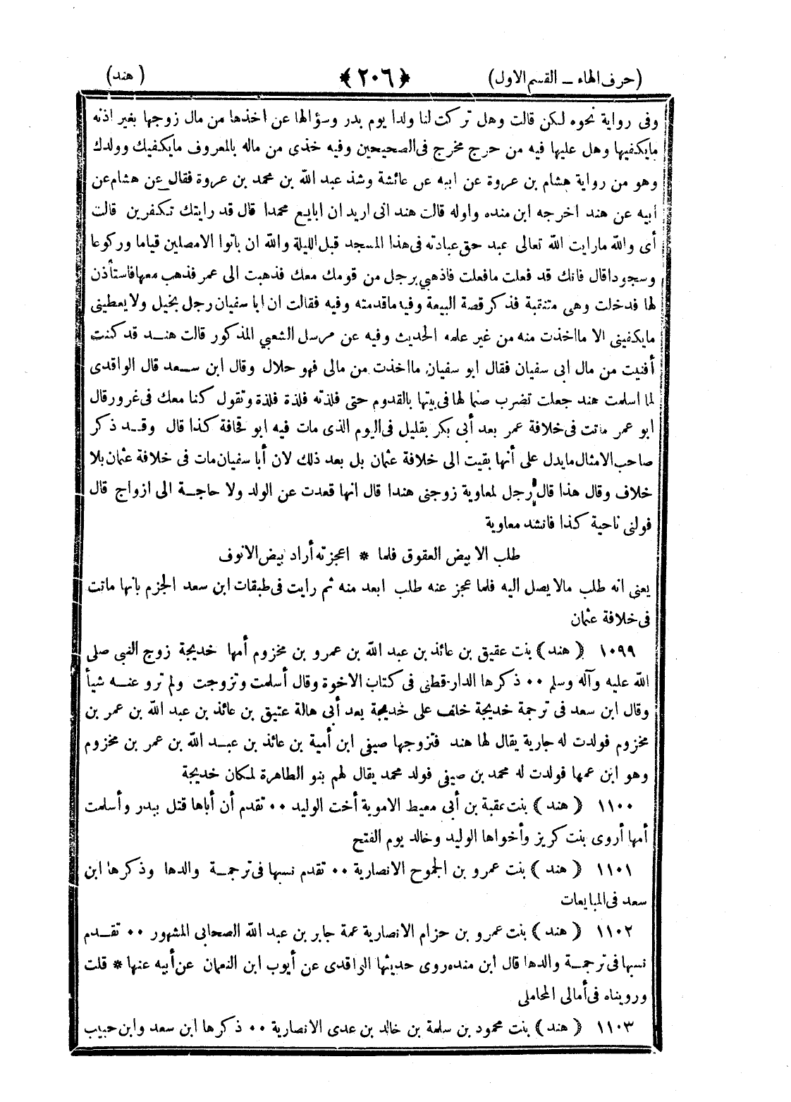 <206> وفي رواية نحوه لكن قالت وهل تركت لنا ولدا يوم بدر وسؤالها عن أخذها من مال زوجها بغير ادنه ما يكفيها وهل عليها فيه من حرج مخرج في الصحيحين وفيه خذى من ماله بالمعروف ما يكفيك وولدك وهو من رواية هشام بن عروة عن أبيه عن عائشة وشذ عبد الله بن محمد بن عروة فقال عن هشام عن أبيه عن هند أخرجه بن منده وأوله قالت هند أني أريد أن أبايع محمدا قال قد رأيتك تكفرين قالت أي والله والله ما رأيت الله تعالى عبد حق عبادته في هذا المسجد قبل الليلة والله إن باتوا إلا مصلين قياما وركوعا وسجودا قال فإنك قد فعلت ما فعلت فاذهبي برجل من قومك معك فذهبت إلى عمر فذهب معها فاستأذن لها فدخلت وهي متنقبة فذكر قصة البيعة وفيه ما قدمته وفيه فقالت إن أبا سفيان رجل بخيل ولا يعطيني ما يكفيني إلا ما أخذت منه من غير علمه الحديث وفيه عن مرسل الشعبي المذكور قالت هند قد كنت أفنيت من مال أبي سفيان فقال أبو سفيان ما أخذت من مالي فهو حلال وقال بن سعد قال الواقدي لما أسلمت هند جعلت تضرب صنما لها في بيتها بالقدوم حتى فلذته فلذة فلذة وتقول كنا معك في غرور قال أبو عمر ماتت في خلافة عمر بعد أبي بكر بقليل في اليوم الذي مات فيه أبو قحافة كذا قال وقد ذكر صاحب الأمثال ما يدل على أنها بقيت إلى خلافة عثمان بل بعد ذلك لأن أبا سفيان مات في خلافة عثمان بلا خلاف وقال هذا قال رجل لمعاوية زوجتي هندا قال أنها قعدت عن الولد ولا حاجة إلى الزواج قال فولني ناحية كذا فأنشد معاوية طلب الأبيض العقوق فلما أعجزته أراد بيض ألا نوق يعني أنه طلب ما لا يصل إليه فلما عجز عنه طلب أبعد منه ثم رأيت في طبقات بن سعد الجزم بأنها ماتت في خلافة عثمان هند بنت عتيق بن عائذ بن عبد الله بن عمر بن مجزوم أمها خديجة زوج النبي صلى الله عليه وسلم ذكرها الدارقطني في كتاب الإخوة وقال أسلمت وتزوجت ولم ترو عنه شيئا وقال بن سعد في ترجمة خديجة خلف على خديجة بعد أبي هالة عتيق بن عائذ بن عبد الله بن عمر بن مخزوم فولدت له جارية لها هند فتزوجها صيفي بن أمية بن عائذ بن عبد الله بن عمر بن مخزوم وهو بن عمها فولدت له محمد بن صيفي فولد محمد يقال لهم بنو الطاهرة لمكان خديجة هند بنت عقبة بن أبي معيط الأموية أخت الوليد تقدم أن أباها قتل ببدر وأسلمت أمها أروى بنت كريز وأخواها الوليد وخالد يوم الفتح هند بنت عمرو بن الجموح الأنصارية تقدم نسبها في ترجمة والدها وذكرها بن سعد في المبايعات هند بنت عمرو بن حرام الأنصارية عمة جابر بن عبد الله الصحابي المشهور تقدم نسبها في ترجمة والدها قال بن منده روى حديثها الواقدي عن أيوب بن النعمان عن أبيه عنها قلت ورويناه في أمالي المحاملي هند بنت محمود بن سلمة بن خالد بن عدي الأنصارية ذكرها بن سعد وابن حبيب §