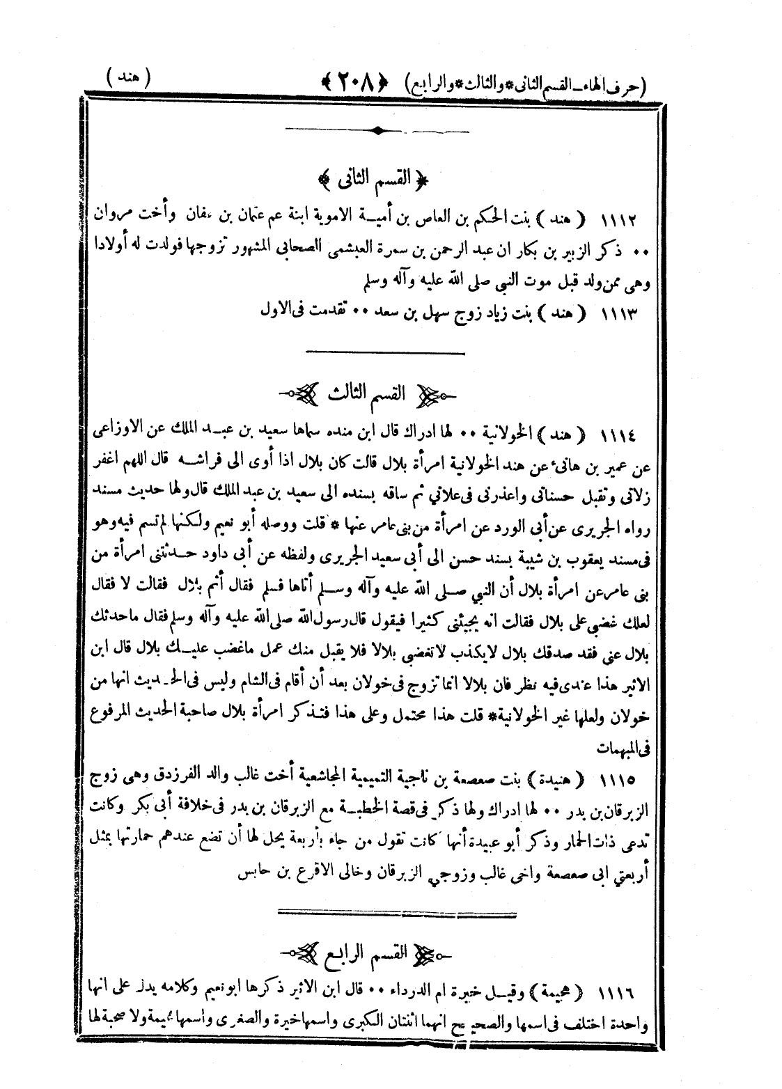 <208> القسم الثاني هند بنت الحكم بن العاص بن أمية الأموية ابنة عم عثمان بن عفان وأخت مروان ذكر الزبير بن بكار أن عبد الرحمن بن سمرة العبشمي الصحابي المشهور تزوجها فولدت له أولادا وهي ممن ولد قبل موت النبي صلى الله عليه وسلم هند بنت زياد زوج سهل بن سعد تقدمت في الأول القسم الثالث هند الخولانية لها إدراك قال بن منده سماها سعيد بن عبد الملك عن الأوزاعي عن عمير بن هانئ عن هند الخولانية امرأة بلال قالت كان بلال إذا أوى إلى فراشه قال اللهم اغفر زلاتي وتقبل حسناتي واعذرني في علاتي ثم ساقه بسند إلى سعيد بن عبد الملك قال ولها حديث مسند رواه الجريري عن أبي الورد عن امرأة من بني عامر عنها قلت ووصله أبو نعيم ولكنها لم تسم فيه وهو في مسند يعقوب بن شيبة بسند حسن إلى أبي سعيد الجريري ولفظه عن أبي الورد حدثتني امرأة من بني عامر عن امرأة بلال أن النبي صلى الله عليه وسلم أتاها فسلم فقال أثم بلال فقالت لا فقال لعلك غضبى على بلال فقالت إنه يجيئني كثيرا فيقول قال رسول الله صلى الله عليه وسلم فقال ما حدثك بلال عني فقد صدقك بلال لا يكذب لا تغضبي بلالا فلا يقبل منك عمل ما غضب عليك بلال قال بن الأثير هذا عندي فيه نظر فإن بلال إنما تزوج في خولان بعدما أقام في الشام وليس في الحديث أنها من خولان ولعلها غير الخولانية قلت هذا محتمل وعلى هذا فتذكر امرأة بلال صاحبة الحديث المرفوع في المبهمات هنيدة بنت صعصعة بن ناجية التميمية المجاشعية أخت غالب والد الفرزدق وهي زوج الزبرقان بن بدر لها إدراك ولها ذكر في قصة الحطيئة مع الزبرقان بن بدر في خلافة أبي بكر وكانت تدعي ذات الخمار وذكر أبو عبيدة أنها كانت تقول من جاء بأربعة يحل لها أن تضع عندهم خمارها بمثل أربعتي أبي صعصعة وأخي غالب وزوجي الزبرقان وخالي الأقرع بن حابس القسم الرابع هجيمة وقيل خيرة أم الدرداء قال بن الأثير ذكرها أبو نعيم وكلامه يدل على أنها واحدة واختلف في اسمها والصحيح أنهما اثنتان الكبرى واسمها خيرة والصغرى واسمها هجيمة ولا صحبة لها §