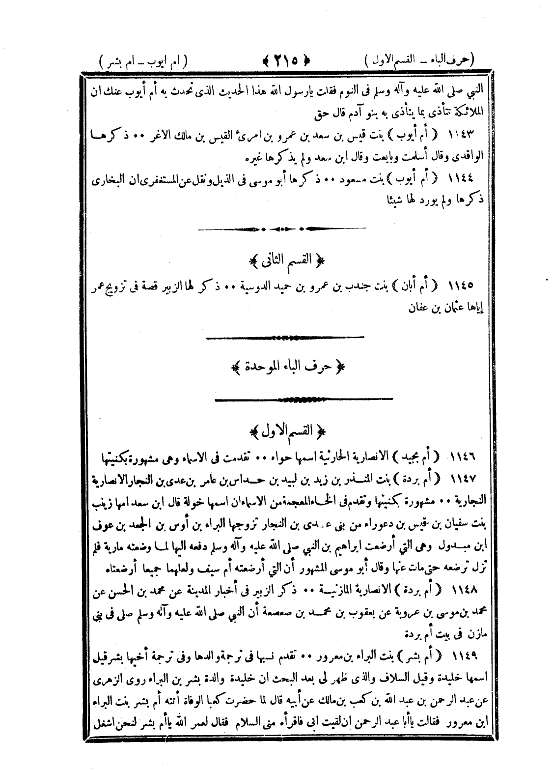 <215> النبي صلى الله عليه وسلم في النوم فقلت يا رسول الله أهذا الحديث الذي تحدث به أم أيوب عنك إن الملائكة تتأذى مما يتأذى به بنو آدم قال حق أم أيوب بنت قيس بن سعد بن عمرو بن امرئ القيس بن مالك الأغر ذكرها الواقدي وقال أسلمت وبايعت قال بن سعد ولم يذكرها غيره أم أيوب بنت مسعود ذكرها أبو موسى في الذيل ونقل عن المستغفري أن البخاري ذكرها ولم يورد لها شيئا القسم الثاني أم أبان بنت جندب بن عمرو بن حمة الدوسية ذكر لها الزبير قصة في تزويج عمر إياها عثمان بن عفان