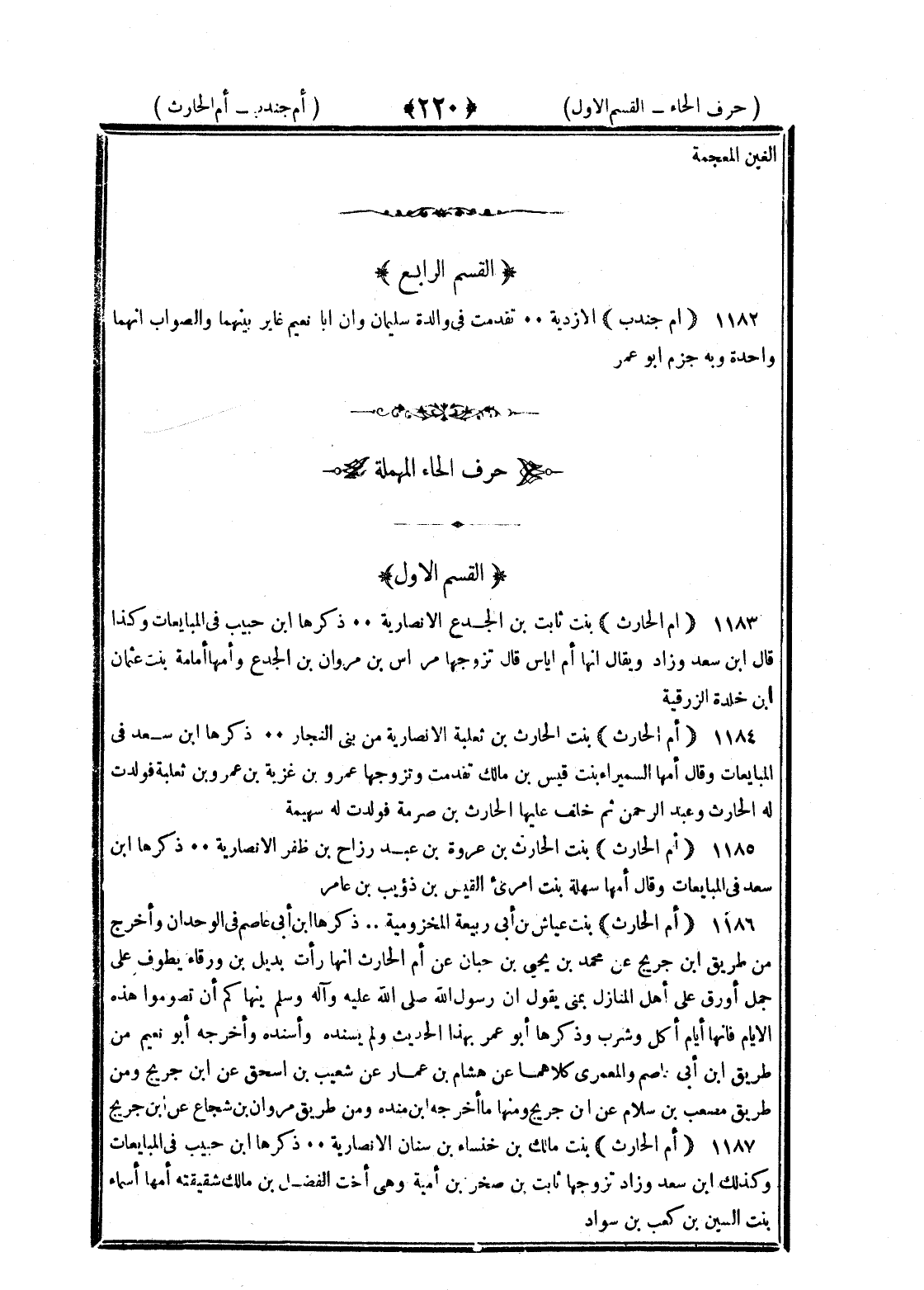 أم الحارث بنت ثابت بن الجذع الأنصارية ذكرها بن حبيب في المبايعات وكذا قال بن سعد وزاد ويقال أنها أم إياس قال تزوجها مرداس بن مروان بن الجذع وأمها أمامة بنت عثمان بن خلدة الزرقية أم الحارث بنت الحارث بن ثعلبة الأنصارية من بني النجار ذكرها بن سعد في المبايعات وقال أمها السميراء بنت قيس بن مالك تقدمت وتزوجها عمرو بن غزية بن عمرو بن ثعلبة فولدت له الحارث وعبد الرحمن ثم خلف عليها الحارث بن خزمة فولدت له سهيمة أم الحارث بنت الحارث بن عروة بن عبد رزاح بن ظفر الأنصارية ذكرها بن سعد في المبايعات وقال أمها سهلة بنت امرئ القيس بن ذؤيب بن عامر أم الحارث بنت عياش بن أبي ربيعة المخزومية ذكرها بن أبي عاصم في الوحدان وأخرج من طريق بن جريج عن محمد بن يحيى بن حبان عن أم الحارث أنها رأت بديل بن ورقاء يطوف على جمل أورق على أهل المنازل بمنى يقول إن رسول الله صلى الله عليه وسلم ينهاكم أن تصوموا هذه الأيام فإنها أيام أكل وشرب وذكرها أبو عمر بهذا الحديث ولم يسنده وأسنده وأخرجه أبو نعيم من طريق بن أبي عاصم والمعمري كلاهما عن هشام بن عمار عن شعيب بن إسحاق عن بن جريج ومن طريق مصعب بن سلام عن بن جريج ومنها ما أخرجه بن منده من طريق مروان بن شجاع عن بن جريج أم الحارث بنت مالك بن خنساء بن سنان الأنصارية ذكرها بن حبيب في المبايعات وكذلك بن سعد وزاد تزوجها ثابت بن صخر بن أمية وهي أخت الطفيل بن مالك شقيقته أمها أسماء بنت القين بن كعب بن سواد §