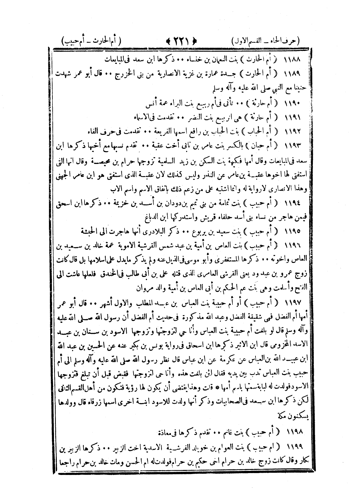 <221> أم الحارث بنت النعمان بن خنساء ذكرها بن سعد في المبايعات أم الحارث جدة عمارة بن غزية الأنصارية من بني الخزرج قال أبو عمر شهدت حنينا مع النبي صلى الله عليه وسلم أم حارثة تأتي في أم ربيع بنت البراء عمة أنس أم حارثة هي الربيع بنت النضر تقدمت في الأسماء أم الحباب بنت الحباب أم رافع اسمها الفريعة تقدمت في حرف الفاء أم حبان بالكسر بنت عامر بن نابي أخت عقبة تقدم نسبها مع أخيها ذكرها بن سعد في المبايعات وقال أمها فكيهة بنت السكن بن زيد السلمية تزوجها حرام بن محيصة وقال أنها التي استفتى لها أخوها عقبة بن عامر عن المنذر وليس كذلك لأن عقبة الذي استفتى هو بن عامر الجهني وهذا الأنصاري لا رواية له وإنما اشتبه على من زعم ذلك باتفاق الاسم واسم الأب أم حبيب بنت ثمامة من بني تميم بن دودان بن أسد بن خزيمة ذكرها بن إسحاق فيمن هاجر من نساء بني أسد حلفاء قريش واستدركها بن الدباغ أم حبيب بنت سعيد بن يربوع ذكر البلاذري أنها هاجرت إلى الحبشة أم حبيب بنت العاص بن أمية بن عبد شمس القرشية الأموية عمة خالد بن سعيد بن العاص وإخوته ذكرها المستغفري وأبو موسى في الذيل عنه ولم يذكر ما يدل على إسلامها بل قال كانت زوج عمرو بن عبد ود يعني القرشي العامري الذي قتله علي بن أبي طالب في الخندق فلعلها عاشت إلى الفتج وأسلمت وهي بنت عم الحكم بن أبي العاص بن أمية والد مروان أم حبيب أو أم حبيبة بنت العباس بن عبد المطلب والأول أشهر قال أبو عمر أمها أم الفضل فهي شقيقة الفضل وعبد الله مذكورة في حديث أم الفضل أن رسول الله صلى الله عليه وسلم قال لو بلغت أم حبيبة بنت العباس وأنا حي لتزوجتها وتزوجها الأسود بن سنان بن عبد الأسد المخزومي قال بن الأثير ذكرها بن إسحاق في رواية يونس بن بكير عنه عن الحسين بن عبد الله بن عبيد الله بن العباس عن عكرمة عن بن عباس قال نظر رسول الله صلى الله عليه وسلم إلى أم حبيب بنت العباس تدب بين يديه فقال لئن بلغت هذه وأنا حي لتزوجتها فقبض قبل أن تبلغ فتزوجها الأسود فولدت له لبابة سمتها باسم أمها قلت وهذا يقتضي أن يكون لها رؤية فتكون من أهل القسم الثاني لكن ذكرها بن سعد في الصحابيات وذكر أنها ولدت للأسود ابنة أخرى اسمها زرقاء قال وولدها يسكنون مكة أم حبيب بنت غانم تقدم ذكرها في معاذة أم حبيب بنت العوام بن خويلد القرشية الأسدية أخت الزبير ذكرها الزبير بن بكار وقال كانت زوج خالد بن حزام أخي حكيم بن حزام فولدت له أم الحسن ومات خالد بن حزام راجعا §