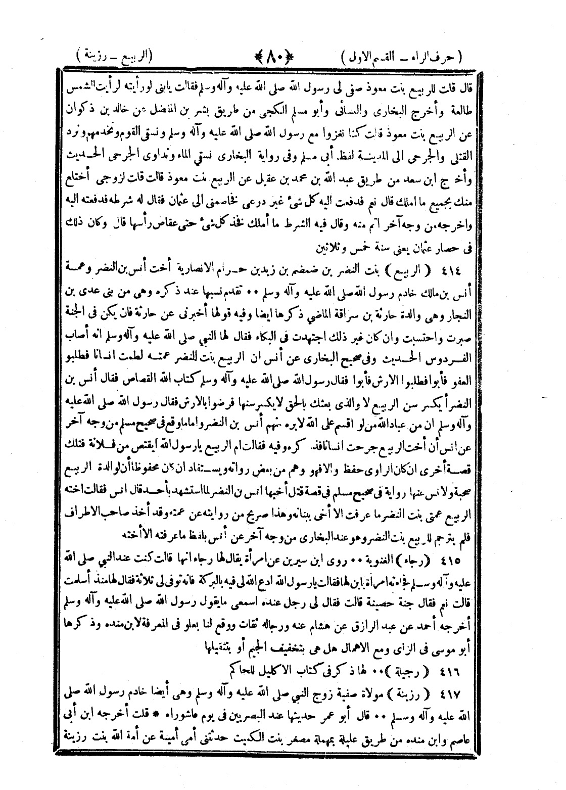 <80> قال قلت للربيع بنت معوذ صفي لي رسول الله صلى الله عليه وسلم فقالت يا بني لو رأيته لرأيت الشمس طالعة وأخرج البخاري والنسائي وأبو مسلم الكجي من طريق بشر بن المفضل عن خالد بن ذكوان عن الربيع بنت معوذ قالت كنا نغزو مع رسول الله صلى الله عليه وسلم ونسقي القوم ونخدمهم ونرد القتلى والجرحى إلى المدينة لفظ أبي مسلم وفي رواية البخاري نسقي الماء ونداوي الجرحى الحديث وأخرج بن سعد من طريق عبد الله بن محمد بن عقيل عن الربيع بنت معوذ قالت قلت لزوجي أختلع منك بجميع ما أملك قال نعم فدفعت إليه كل شيء غير درعي فخاصمني الى عثمان فقال له شرطه فدفعته إليه وأخرجه من وجه آخر أتم منه وقال فيه الشرط أملك فخذ كل شيء حتى عقاص رأسها قال وكان ذلك في حصار عثمان يعني سنة خمس وثلاثين الربيع بنت النضر بن ضمضم بن زيد بن حرام الأنصارية أخت أنس بن النضر وعمة أنس بن مالك خادم رسول الله صلى الله عليه وسلم تقدم نسبها عند ذكره وهي من بني عدي بن النجار وهي والدة حارثة بن سراقة الماضي ذكره أيضا وفيه قولها أخبرني عن حارثة فإن يكن في الجنة صبرت واحتسبت وإن كان غير ذلك اجتهدت في البكاء فقال لها النبي صلى الله عليه وسلم إنه أصاب الفردوس الحديث وفي صحيح البخاري عن أنس أن الربيع بنت النضر عمته لطمت إنسانا فطلبوا العفو فأبوا فطلبوا الأرش فأبوا فقال رسول الله صلى الله عليه وسلم كتاب الله القصاص فقال أنس بن النضر أيكسر سن الربيع لا والذي بعثك بالحق لا يكسر سنها فرضوا بالأرش فقال رسول الله صلى الله عليه وسلم إن من عباد الله من لو أقسم على الله لأبرة منهم أنس بن النضر وأما ما وقع في صحيح مسلم من وجه آخر عن أنس أن أخت الربيع جرحت إنسانا فذكره وفيه فقالت أم الربيع يا رسول الله أيقتص من فلانة فتلك قصة أخرى إن كان الراوي حفظ وإلا فهو وهم من بعض رواته ويستفاد إن كان محفوظا أن لوالدة الربيع صحبة ولأنس عنها رواية في صحيح مسلم في قصة قتل أخيها أنس بن النضر لما استشهد بأحد قال أنس فقالت أخته الربيع عمتي بنت النضر ما عرفت إلا أخي ببنانه وهذا صريح من روايته عن عمته وقد أخل صاحب الأطراف فلم يترجم للربيع بنت النضر وهو عند البخاري من وجه آخر عن أنس بلفظ ما عرفته إلا أخته رجاء الغنوية روى بن سيرين عن امرأة يقال لها رجاء أنها قالت كنت عند النبي صلى الله عليه وسلم فجاءته امرأة بابن لها فقالت يا رسول الله ادع الله لي فيه بالبركة فإنه توفي لي ثلاثة فقال لها منذ أسلمت قالت نعم فقال جنة حصينة قالت فقال لي رجل عنده اسمعي ما يقول رسول الله صلى الله عليه وسلم أخرجه أحمد عن عبد الرزاق عن هشام عنه ورجاله ثقات ووقع لنا بعلو في المعرفة لابن منده وذكرها أبو موسى في الراء وفي الزاي ومع الإهمال هل هي بتخفيف الجيم أو بتثقيلها رحيلة لها ذكر في كتاب الإكليل للحاكم رزينة مولاة صفية زوج النبي صلى الله عليه وسلم وهي أيضا خادم رسول الله صلى الله عليه وسلم قال أبو عمر حديثها عند البصريين في يوم عاشوراء قلت أخرجه بن أبي عاصم وابن منده من طريق عليلة بمهملة مصغرة بنت الكميت حدثتني أمي أمينة عن أمة الله بنت رزينة §