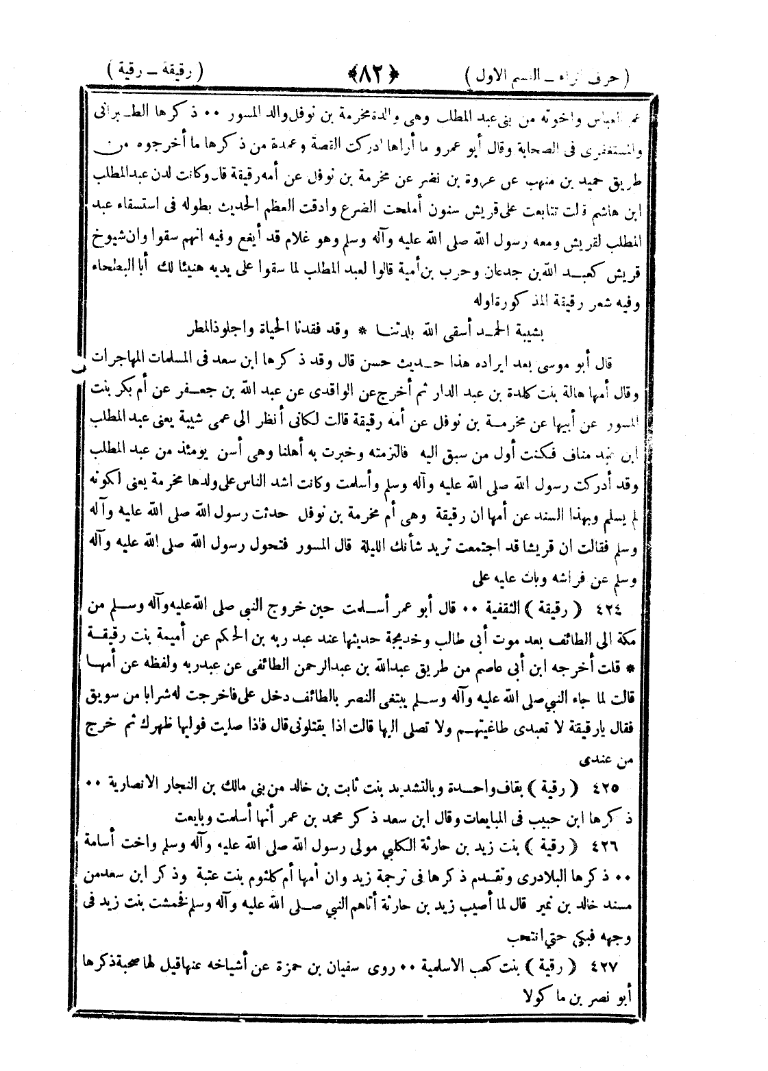 <82> عم العباس وإخوته من بني عبد المطلب وهي والدة مخرمة بن نوفل والد المسور ذكرها الطبراني والمستغفري في الصحابة وقال أبو عمر وما أراها أدركت وعمدة من ذكرها ما أخرجوه من طريق حميد بن منهب عن عروة بن مضرس عن مخرمة بن نوفل عن أمه رقيقة قال وكانت لدة عبد المطلب بن هاشم قالت تتابعت على قريش سنون أمحلت الضرع وأدقت العظم الحديث بطوله في استسقاء عبد المطلب لقريش ومعه رسول الله صلى الله عليه وسلم وهو غلام قد أيفع وفيه أنهم سقوا وإن شيوخ قريش كعبدالله بن جدعان وحرب بن أمية قالوا لعبد المطلب لما سقوا على يديه هنيئا لك أبا البطحاء وفيه شعر رقيقة المذكورة أوله بشيبة الحمد أسقى الله بلدتنا وقد فقدنا الحيا واجلوذ المطر قال أبو موسى بعد إيراده هذا حديث حسن قال وقد ذكرها بن سعد في المسلمات المهاجرات وقال أمها هالة بنت كلدة بن عبد الدار ثم أخرج عن الواقدي عن عبد الله بن جعفر عن أم بكر بنت المسور عن أبيها عن مخرمة بن نوفل عن أمه رقيقة قالت لكأني أنظر الى عمي شيبة تعني عبد المطلب بن عبد مناف فكنت أول من سبق اليه فالتزمته وخبرت به أهلنا وهي أسن يومئذ من عبد المطلب وقد أدركت رسول الله صلى الله عليه وسلم فاسلمت وكانت أشد الناس على ولدها مخرمة يعني لكونه لم يسلم وبهذا السند عن أمها ان رقيقة وهي أم مخرمة بن نوفل حدثت رسول الله صلى الله عليه وسلم فقالت إن قريشا قد اجتمعت تريد بياتك الليلة قال المسور فتحول رسول الله صلى الله عليه وسلم عن فراشه وبات عليه علي رقيقة الثقفية قال أبو عمر أسلمت حين خروج النبي صلى الله عليه وسلم من مكة الى الطائف بعد موت أبي طالب وخديجة حديثها عند عبد ربه بن الحكم عن أميمة بنت رقيقة قلت أخرجه بن أبي عاصم من طريق عبد الله بن عبد الرحمن الطائفي عن عبد ربه ولفظه عن أمها قالت لما جاء النبي صلى الله عليه وسلم يبتغي النصر بالطائف دخل علي فأخرجت له شرابا من سويق فقال يا رقيقة لا تعبد طاغيتهم ولا تصلي إليها قالت إذا يقتلوني قال فإذا صليت فوليها ظهرك ثم خرج من عندي رقية بقاف واحدة وبالتشديد بنت ثابت بن خالد من بني مالك بن النجار الأنصارية ذكرها بن حبيب في المبايعات وقال بن سعد ذكر محمد بن عمر أنها أسلمت وبايعت رقية بنت زيد بن حارثة الكلبي مولى رسول الله صلى الله عليه وسلم وأخت أمانة ذكرها البلاذري وتقدم ذكرها في ترجمة زيد وأن أمها أم كلثوم بنت عتبة وذكر بن سعد من مسند خالد بن نمير قال لما أصيب زيد بن حارثة أتاهم النبي صلى الله عليه وسلم فخمشت بنت زيد في وجهه فبكى حتى انتحب رقية بنت كعب الأسلمية روى سفيان بن حمزة عن أشياخه عنها قيل لها صحبة ذكرها أبو نصر بن ماكولا §