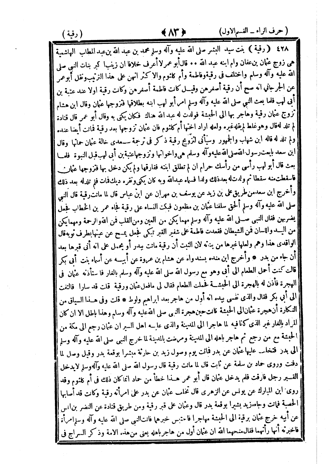 <83> رقية بنت سيد البشر صلى الله عليه وسلم محمد بن عبد الله بن عبد المطلب الهاشمية هي زوج عثمان بن عفان وأم ابنه عبد الله قال أبو عمر لا أعرف خلافا أن زينب أكبر بنات النبي صلى الله عليه وسلم واختلف في رقية وفاطمة وأم كلثوم والأكثر أنهن على هذا الترتيب ونقل أبو عمر عن الجرجاني أنه صح أن رقية أصغرهن وقيل كانت فاطمة أصغرهن وكانت رقية أولا عند عتبة بن أبي لهب فلما بعث النبي صلى الله عليه وسلم أمر أبو لهب ابنه بطلاقها فتزوجها عثمان وقال بن هشام تزوج عثمان رقية وهاجر بها الى الحبشة فولدت له عبد الله هناك فكان يكنى به وقال أبو عمر قال قتادة لم تلد له قال وهو غلط لم يقله غيره ولعله أراد أختها أم كلثوم فإن عثمان تزوجها بعد رقية فماتت أيضا عنده ولم تلد له قاله بن شهاب والجمهور وسيأتي لتزويج رقية ذكر في ترجمة سعدي أم عثمان حماتها وقال بن سعد بايعت رسول الله صلى الله عليه وسلم هي وأخواتها وتزوجها عتبه بن أبي لهب قبل النبوة فلما بعث قال أبو لهب رأسي من رأسك حرام إن لم تطلق ابنته ففارقها ولم يكن دخل بها فتزوجها عثمان فأسقطت منه سقطا ثم ولدت له بعد ذلك ولدا فسماه عبد الله وبه كان يكنى ونقره ديك فمات فلم تلد له بعد ذلك وأخرج بن سعد من طريق علي بن زيد عن يوسف بن مهران عن بن عباس قال لما ماتت رقية قال النبي صلى الله عليه وسلم ألحقي بسلفنا عثمان بن مظعون فبكت النساء على رقية فجاء عمر بن الخطاب فجعل يضربهن فقال النبي صلى الله عليه وسلم مهما يكن من العين ومن القلب فمن الله والرحمة مهما يكن من اليد واللسان فمن الشيطان فقعدت فاطمة على شفير القبر تبكي فجعل يمسح عن عينها بطرف ثوبه قال الواقدي هذا وهم ولعلها غيرها من بناته لأن الثبت أن رقية ماتت ببدر أو يحمل على أنه أتى قبرها بعد أن جاء من بدر وأخرج بن منده بسند واه عن هشام بن عروة عن أبيه عن أسماء بنت أبي بكر قالت كنت أحمل الطعام الى أبي وهو مع رسول الله صلى الله عليه وسلم بالغار فاستأذنه عثمان في الهجرة فأذن له في الهجرة الى الحبشة فحملت الطعام فقال لي ما فعل عثمان ورقية قلت قد سارا فالتفت الى أبي بكر فقال والذي نفسي بيده إنه أول من هاجر بعد إبراهيم ولوط قلت وفي هذا السياق من النكارة أن هجرة عثمان الى الحبشة كانت حين هجرة النبي صلى الله عليه وسلم وهذا باطل إلا إن كان المراد بالغار غير الذي كانا فيه لما هاجرا الى المدينة والذي عليه أهل السير أن عثمان رجع مكة من الحبشة مع الى من رجع ثم هاجر بأهله الى المدينة ومرضت بالمدينة لما خرج النبي صلى الله عليه وسلم الى بدر فتخلف عليها عثمان عن بدر فماتت يوم وصول زيد بن حارثة مبشرا بوقعة بدر وقيل وصل لما دفنت وروى حماد بن سلمة عن ثابت عن أنس قال ما ماتت رقية قال رسول الله صلى الله عليه وسلم لا يدخل القبر رجل قارف فلم يدخل عثمان قال أبو عمر هذا خطأ من حماد إنما كان ذلك في أم كلثوم وقد روى بن المبارك عن يونس عن الزهري قال تخلف عثمان عن بدر على امرأته رقية وكانت قد أصابها الحصبة فماتت وجاء زيد بشيرا بوقعة بدر قال وعثمان على قبر رقية ومن طريق قتادة عن النضر بن أنس عن أبيه خرج عثمان برقية الى الحبشة مهاجرا فاحتبس خبرهما فأتت النبي صلى الله عليه وسلم امرأة فأخبرته أنها رأتهما فقال النبي صلى الله عليه وسلم قبحهما الله إن عثمان أول من هاجر بأهله يعني من هذه الأمة وذكر السراج في §