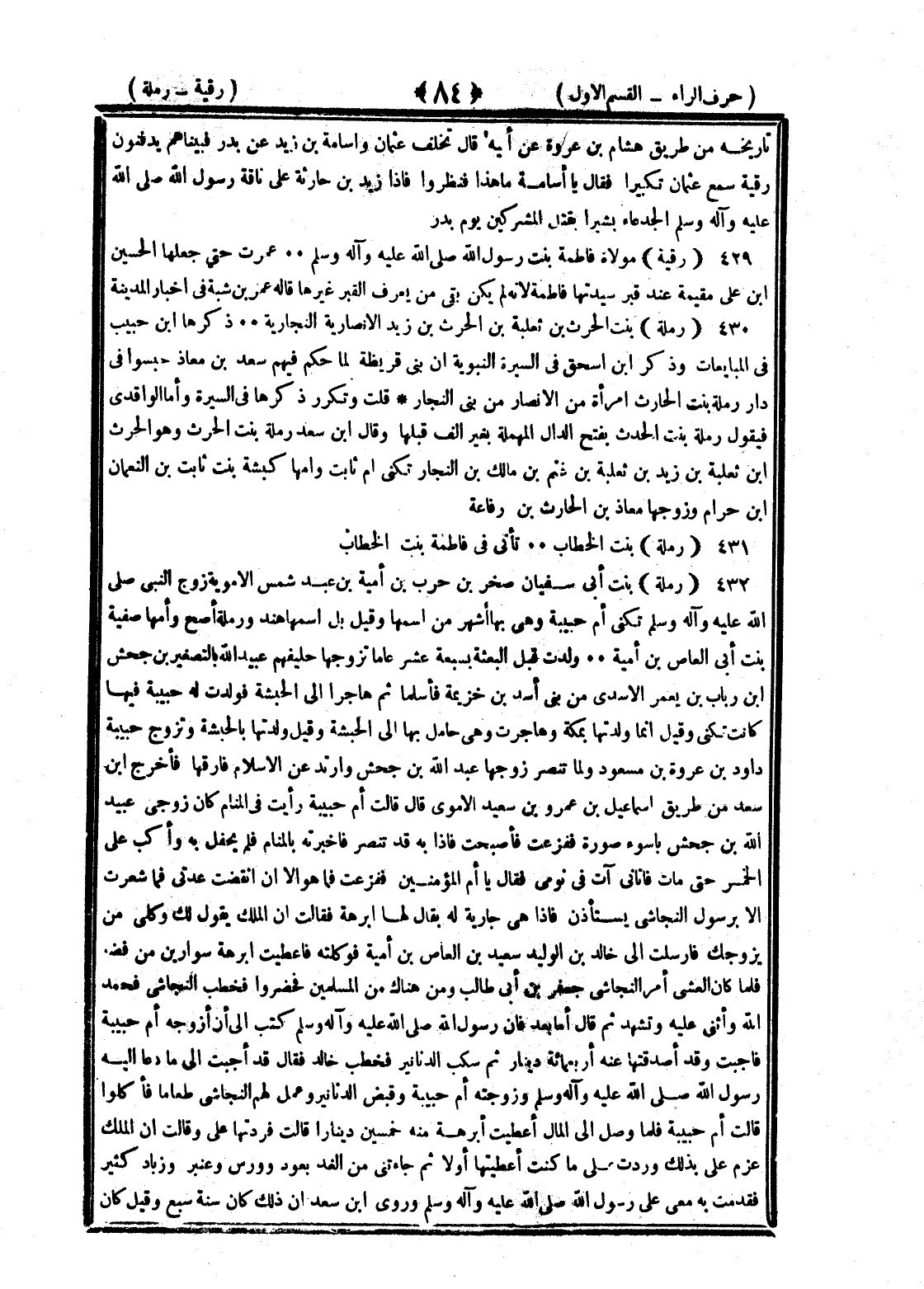 <84> تاريخه من طريق هشام بن عروة عن أبيه قال تخلف عثمان وأسامة بن زيد عن بدر فبينا هم يدفنون رقية سمع عثمان تكبيرا فقال يا أسامة ما هذا فنظروا فإذا زيد بن حارثة على ناقة رسول الله صلى الله عليه وسلم الجدعاء بشيرا بقتل المشركين يوم بدر رقية مولاة فاطمة بنت رسول الله صلى الله عليه وسلم عمرت حتى جعلها الحسين بن علي مقيمة عند قبر سيدتها فاطمة لأنه لم يكن بقي من يعرف القبر غيرها قاله عمر بن شبة في أخبار المدينة رملة بنت الحارث بن ثعلبة بن الحارث بن زيد الأنصارية النجارية ذكرها بن حبيب في المبايعات وذكر بن إسحاق في السيرة النبوية أن بني قريظة لما حكم فيهم سعد بن معاذ حبسوا في دار رملة بنت الحارث امرأة من الأنصار من بني النجار قلت وتكرر ذكرها في السيرة وأما الواقدي فيقول رملة بنت الحدث بفتح الدال المهملة بغير ألف قبلها وقال بن سعد رملة بنت الحارث وهو الحارث بن ثعلبة بن زيد بن ثعلبة بن غنم بن مالك بن النجار تكنى أم ثابت وأمها كبشة بنت ثابت بن النعمان بن حرام وزوجها معاذ بن الحارث بن رفاعة رملة بنت الخطات تأتي في فاطمة بنت الخطاب رملة بنت أبي سفيان صخر بن حرب بن أمية بن عبد شمس الأموية زوج النبي صلى الله عليه وسلم تكنى أم حبيبة وهي بها أشهر من اسمها وقيل بل اسمها هند ورملة أصح أمها صفية بنت أبي العاص بن أمية ولدت قبل البعثة بسبعة عشر عاما تزوجها حليفهم عبيد الله بالتصغير بن جحش بن رئاب بن يعمر الأسدي من بني أسد بن خزيمة فأسلما ثم هاجرا الى الحبشة فولدت له حبيبة فبها كانت تكنى وقيل إنما ولدتها بمكة وهاجرت وهي حامل بها الى الحبشة وقيل ولدتها بالحبشة وتزوج حبيبة داود بن عروة بن مسعود ولما تنصر زوجها عبيد الله بن جحش وارتد عن الإسلام فارقها فأخرج بن سعد من طريق إسماعيل بن عمرو بن سعيد الأموي قال قالت أم حبيبة رأيت في المنام كأن زوجي عبيد الله بن جحش بأسوأ صورة ففزعت فأصبحت فإذا به قد تنصر فأخبرته بالمنام فلم يحفل به وأكب على الخمر حتى مات فأتاني آت في نومي فقال يا أم المؤمنين ففزعت فما هو إلا أن انقضت عدتي فما شعرت إلا برسول النجاشي يستأذن فإذا هي جارية له يقال لها أبرهة فقالت إن الملك يقول لك وكلي من يزوجك فأرسلت الى خالد بن سعيد بن العاص بن أمية فوكلته فأعطيت أبرهة سوارين من فضة فلما كان العشي أمر النجاشي جعفر بن أبي طالب فحمد الله وأثنى عليه وتشهد ثم قال أما بعد فإن رسول الله صلى الله عليه وسلم كتب الي أن أزوجه أم حبيبة فأجبت وقد أصدقتها عنه أربعمائة دينار ثم سكب الدنانير فخطب خالد فقال قد أجبت الى ما دعا اليه رسول الله صلى الله عليه وسلم وزوجته أم حبيبة وقبض الدنانير وعمل لهم النجاشي طعاما فأكلوا قالت أم حبيبة فلما وصل الي المال أعطيت أبرهة منه خمسين دينارا قالت فردتها علي وقالت إن الملك عزم على بذلك وردت على ما كنت أعطيتها أولا ثم جاءتني من الغد بعود وورس وعنبر وزباد كثير فقدمت به معي على رسول الله صلى الله عليه وسلم وروى بن سعد أن ذلك كان سنة سبع وقيل كان §