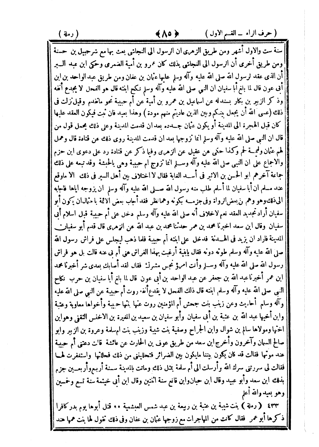 <85> سنة ست والأول أشهر ومن طريق الزهري أن الرسول الى النجاشي بعث بها مع شرحبيل بن حسنة ومن طريق أخرى أن الرسول الى النجاشي بذلك كان عمرو بن أمية الضمري وحكى بن عبد البر أن الذي عقد لرسول الله صلى الله عليه وسلم عليها عثمان بن عفان ومن طريق عبد الواحد بن أبي عون قال لما بلغ أبا سفيان أن النبي صلى الله عليه وسلم نكح ابنته قال هو الفحل لا يقدع أنفه وذكر الزبير بن بكار بسند له عن إسماعيل بن عمرو بن أمية عن أم حبيبة نحو ما تقدم وقيل نزلت في ذلك عسى الله أن يجعل بينكم وبين الذين عاديتم منهم مودة وهذا بعيد فإن ثبت فيكون العقد عليها كان قبل الهجرة الى المدينة أو يكون عثمان جدده بعد أن قدمت المدينة وعلى ذلك يحمل قول من قال إن النبي صلى الله عليه وسلم إنما تزوجها بعد أن قدمت المدينة روى ذلك عن قتادة قال وعمل لهم عثمان وليمة لحم وكذا حكى عن عقيل عن الزهري وفيما ذكر عن قتادة رد على دعوى بن حزم الإجماع على أن النبي صلى الله عليه وسلم إنما تزوج أم حبيبة وهي بالحبشة وقد تبعه على ذلك جماعة أخرهم أبو الحسن بن الأثير في أسد الغابة فقال لا اختلاف بين أهل السير في ذلك إلا ما وقع عند مسلم أن أبا سفيان لما أسلم طلب منه رسول الله صلى الله عليه وسلم أن يزوجه إياها فأجابه الى ذلك وهو وهم من بعض الرواة وفي جزمه بكونه وهما نظر فقد أجاب بعض الأئمة باحتمال أن يكون أبو سفيان أراد تجديد العقد نعم لا خلاف أنه صلى الله عليه وسلم دخل على أم حبيبة قبل إسلام أبي سفيان وقال بن سعد أخبرنا محمد بن عمر حدثنا محمد بن عبد الله عن الزهري قال قدم أبو سفيان المدينة فأراد أن يزيد في الهدنة فدخل على ابنته أم حبيبة فلما ذهب ليجلس على فراش رسول الله صلى الله عليه وسلم طوته دونه فقال يا بنية أرغبت بهذا الفراش عني أم بي عنه قالت بل هو فراش رسول الله صلى الله عليه وسلم وأنت امرؤ نجس مشرك فقال لقد أصابك بعدي شر أخبرنا محمد بن عمر أخبرنا عبد الله بن جعفر عن عبد الواحد بن أبي عون قال لما بلغ أبا سفيان بن حرب نكاح النبي صلى الله عليه وسلم ابنته قال ذلك الفحل لا يقدع أنفه روت أم حبيبة عن النبي صلى الله عليه وسلم أحاديث وعن زينب بنت جحش أم المؤمنين روت عنها بنتها حبيبة وأخواها معاوية وعتبة وابن أخيها عبد الله بن عتبة بن أبي سفيان وأبو سفيان بن سعيد بن المغيرة بن الأخنس الثقفي وهو بن أختها ومولياها سالم بن سوال وأبو الجراح وصفية بنت شيبة وزينب بنت أم سلمة وعروة بن الزبير وأبو صالح السمان وآخرون وأخرج بن سعد من طريق عوف بن الحارث عن عائشة قالت دعتني أم حبيبة عند موتها فقالت قد كان يكون بيننا ما يكون بين الضرائر فتحللينني من ذلك فحللتها واستغفرت لها فقالت لي سررتني سرك الله وأرسلت الى أم سلمة بمثل ذلك وماتت بالمدينة سنة أربع وأربعين جزم بذلك بن سعد وأبو عبيد وقال بن حبان وابن قانع سنة اثنتين وقال بن أبي خيثمة سنة تسع وخمسين وهو بعيد والله أعلم رملة بنت شيبة بن ربيعة بن عبد شمس العبشمية قتل أبوها يوم بدر كافرا ذكرها أبو عمر فقال كانت من المهاجرات هاجرت مع زوجها عثمان بن عفان وفي ذلك تقول لها بنت عمها هند §