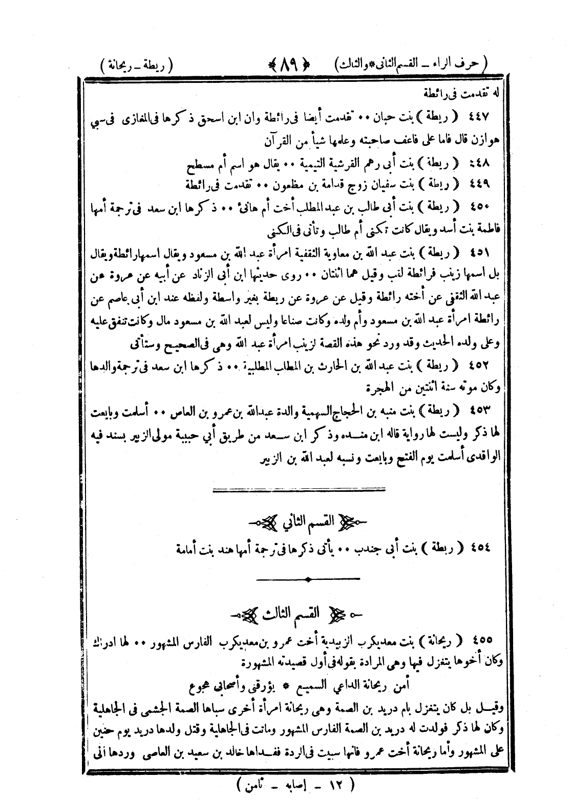 <89> له تقدمت في رائطة ريطة بنت حبان تقدمت أيضا في رائطة وأن بن إسحاق ذكرها في المغازي في سبي هوازن قال أما علي فأعف صاحبته وعلمها شيئا من القرآن ريطة بنت أبي رهم القرشية التيمية يقال هو اسم أم مسطح ريطة بنت سفيان زوج قدامة بن مظعون تقدمت في رائطة ريطة بنت أبي طالب بن عبد المطلب أخت أم هانئ ذكرها بن سعد في ترجمة أمها فاطمة بنت أسد ويقال كانت تكنى أم طالب وتأتي في الكنى ريطة بنت عبد الله بن معاوية الثقفية امرأة عبد الله بن مسعود ويقال اسمها رائطة ويقال بل اسمها زينب فرائطة لقب وقيل هما اثنتان روى حديثها بن أبي الزناد عن أبيه عن عروة عن عبد الله الثقفي عن أخته رائطة وقيل عن عروة عن ريطة بغير واسطة ولفظه عند بن أبي عاصم عن رائطة امرأة عبد الله بن مسعود وأم ولده وكانت صناعا وليس لعبد الله بن مسعود مال وكانت تنفق عليه وعلى ولده الحديث وقد ورد نحو هذه القصة لزينب امرأة عبد الله وهي في الصحيح وستأتي ريطة بنت عبد الله بن الحارث بن المطلب المطلبية ذكرها بن سعد في ترجمة والدها وكان موته سنة اثنتين من الهجرة ريطة بنت منبه بن الحجاج السهمية والدة عبد الله بن عمرو بن العاص أسلمت وبايعت لها ذكر وليست لها رواية قاله بن منده وذكر بن سعد من طريق أبي حبيبة مولى الزبير بسند فيه الواقدي أنها أسلمت يوم الفتح وبايعت ونسبه لعبد الله بن الزبير القسم الثاني ريطة بنت أبي جندب يأتي ذكرها في ترجمة أمها هند بنت أمامة القسم الثالث ريحانة بنت معد يكرب الزبيدية أخت عمرو بن معد يكرب الفارس المشهور لها إدراك وكان أخوها يتغزل فيها وهي المرادة بقوله في أول قصيدته المشهورة أمن ريحانة الداعي السميع يؤرقني وأصحابي هجوع وقيل بل كان يتغزل بأم دريد بن الصمة وهي ريحانة امرأة أخرى سباها الصمة الجشمي في الجاهلية وكان لها ذكر فولدت له دريد بن الصمة الفارس المشهور وماتت في الجاهلية وقتل ولدها دريد يوم حنين على المشهور وأما ريحانة أخت عمرو فإنها سبيت في الردة ففداها خالد بن سعيد بن العاصي وردها إلى §
