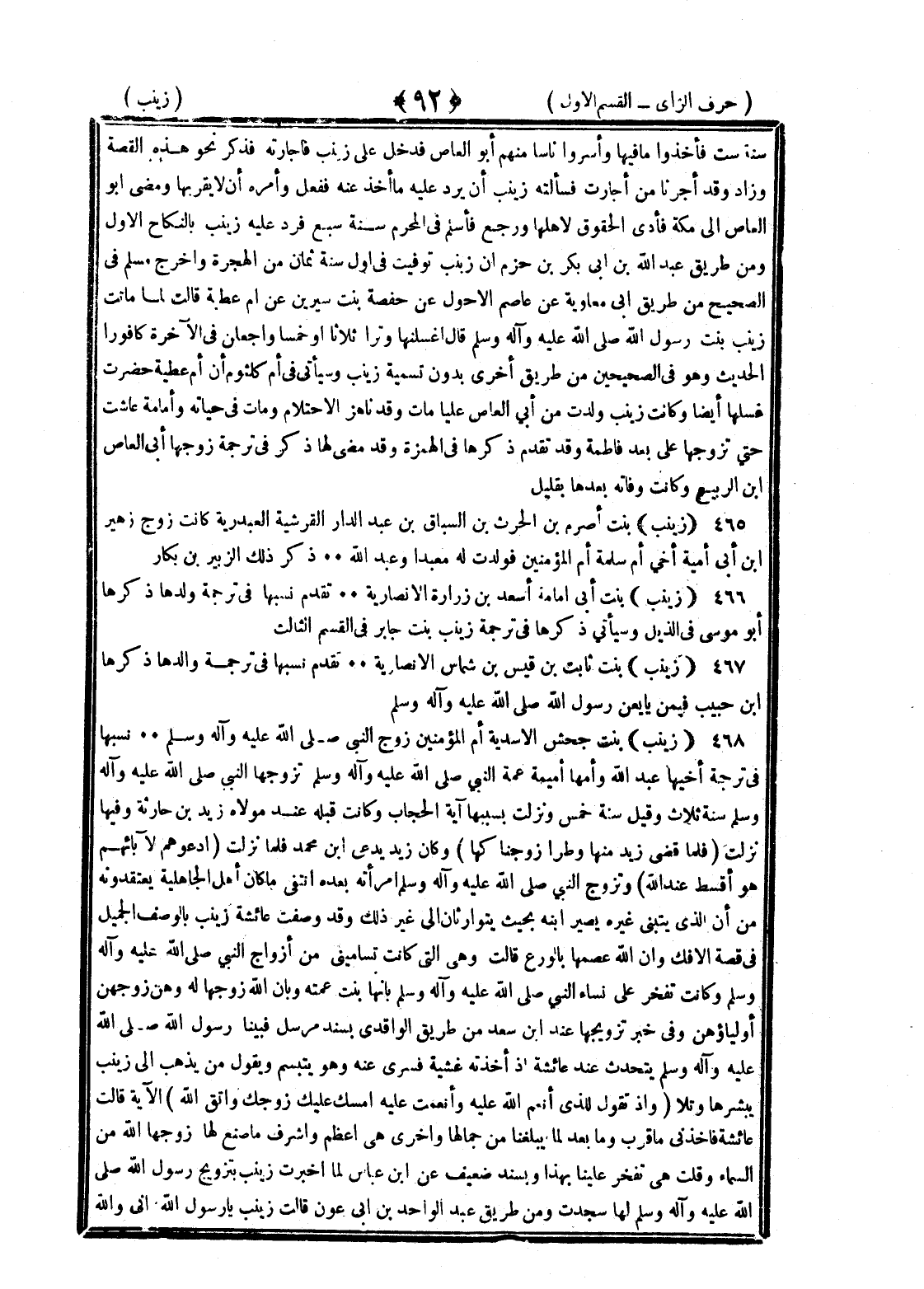 <92> سنة ست فأخذوا ما فيها وأسروا ناسا منهم أبو العاص فدخل على زينب فأجارته فذكر نحو هذه القصة وزاد وقد أجرنا من أجارت فسألته زينب أن يرد عليه ما أخذ عنه ففعل وأمرها ألا يقربها ومضى أبو العاص إلى مكة فأدى الحقوق لأهلها ورجع فأسلم في المحرم سنة سبع فرد عليه زينب بالنكاح الأول ومن طريق عبد الله بن أبي بكر بن حزم أن زينب توفيت في أول سنة ثمان من الهجرة وأخرج مسلم في الصحيح من طريق أبي معاوية عن عاصم الأحول عن حفصة بنت سيرين عن أم عطية قالت لما ماتت زينب بنت رسول الله صلى الله عليه وسلم قال اغسلنها وترا ثلاثا أو خمسا واجعلن في الآخرة كافورا الحديث وهو في الصحيحين من طريق أخرى بدون تسمية زينب وسيأتي في أم كلثوم أن أم عطية حضرت غسلها أيضا وكانت زينب ولدت من أبي العاص عليا مات وقد ناهز الاحتلام ومات في حياته وأمامة عاشت حتى تزوجها علي بعد فاطمة وقد تقدم ذكرها في الهمزة وقد مضى لها ذكر في ترجمة زوجها أبي العاص بن الربيع وكانت وفاته بعدها بقليل زينب بنت أصرم بن الحارث بن السباق بن عبد الدار القرشية العبدرية كانت زوج زهير بن أبي أمية أخي أم سلمة أم المؤمنين فولدت له معبدا وعبد الله ذكر ذلك الزبير بن بكار زينب بنت أبي أمامة أسعد بن زرارة الأنصارية تقدم نسبها في ترجمة ولدها ذكرها أبو موسى في الذيل وسيأتي ذكرها في ترجمة زينب بنت جابر في القسم الثالث زينب بنت ثابت بن قيس بن شماس الأنصارية تقدم نسبها في ترجمة والدها ذكرها بن حبيب فيمن بايعن رسول الله صلى الله عليه وسلم زينب بنت جحش الأسدية أم المؤمنين زوج النبي صلى الله عليه وسلم تقدم نسبها في ترجمة أخيها عبد الله وأمها أمية عمة النبي صلى الله عليه وسلم تزوجها النبي صلى الله عليه وسلم سنة ثلاث وقيل سنة خمس ونزلت بسببها آية الحجاب وكانت قبله عند مولاه زيد بن حارثة وفيها نزلت فلما قضى زيد منها وطرا زوجناكها وكان زيد يدعى بن محمد فلما نزلت ادعوهم لآبائهم هو أقسط عند الله وتزوج النبي صلى الله عليه وسلم امرأته بعده انتفى ما كان أهل الجاهلية يعتقدونه من أن الذي يتبنى غيره يصير ابنه بحيث يتوارثان إلى غير ذلك وقد وصفت عائشة زينب بالوصف الجميل في قصة الإفك وأن الله عصمها بالورع قالت وهي التي كانت تساميني من أزواج النبي صلى الله عليه وسلم وكانت تفخر على نساء النبي صلى الله عليه وسلم بأنها بنت عمته وبأن الله زوجها له وهن زوجهن أولياؤهن وفي خبر تزويجها عند بن سعد من طريق الواقدي بسند مرسل فبينا رسول الله صلى الله عليه وسلم يتحدث عند عائشة إذ أخذته غشية فسرى عنه وهو يتبسم ويقول من يذهب إلى زينب يبشرها وتلا وإذ تقول للذي أنعم الله عليه وأنعمت عليه أمسك عليك زوجك واتق الله الآية قالت عائشة فأخذني ما قرب وما بعد لما يبلغنا من جمالها وأخرى هي أعظم وأشرف ما صنع لها زوجها الله من السماء وقلت هي تفخر علينا بهذا وبسند ضعيف عن بن عباس لما أخبرت زينب بتزويج رسول الله صلى الله عليه وسلم لها سجدت ومن طريق عبد الواحد بن أبي عون قالت زينب يا رسول الله إني والله §