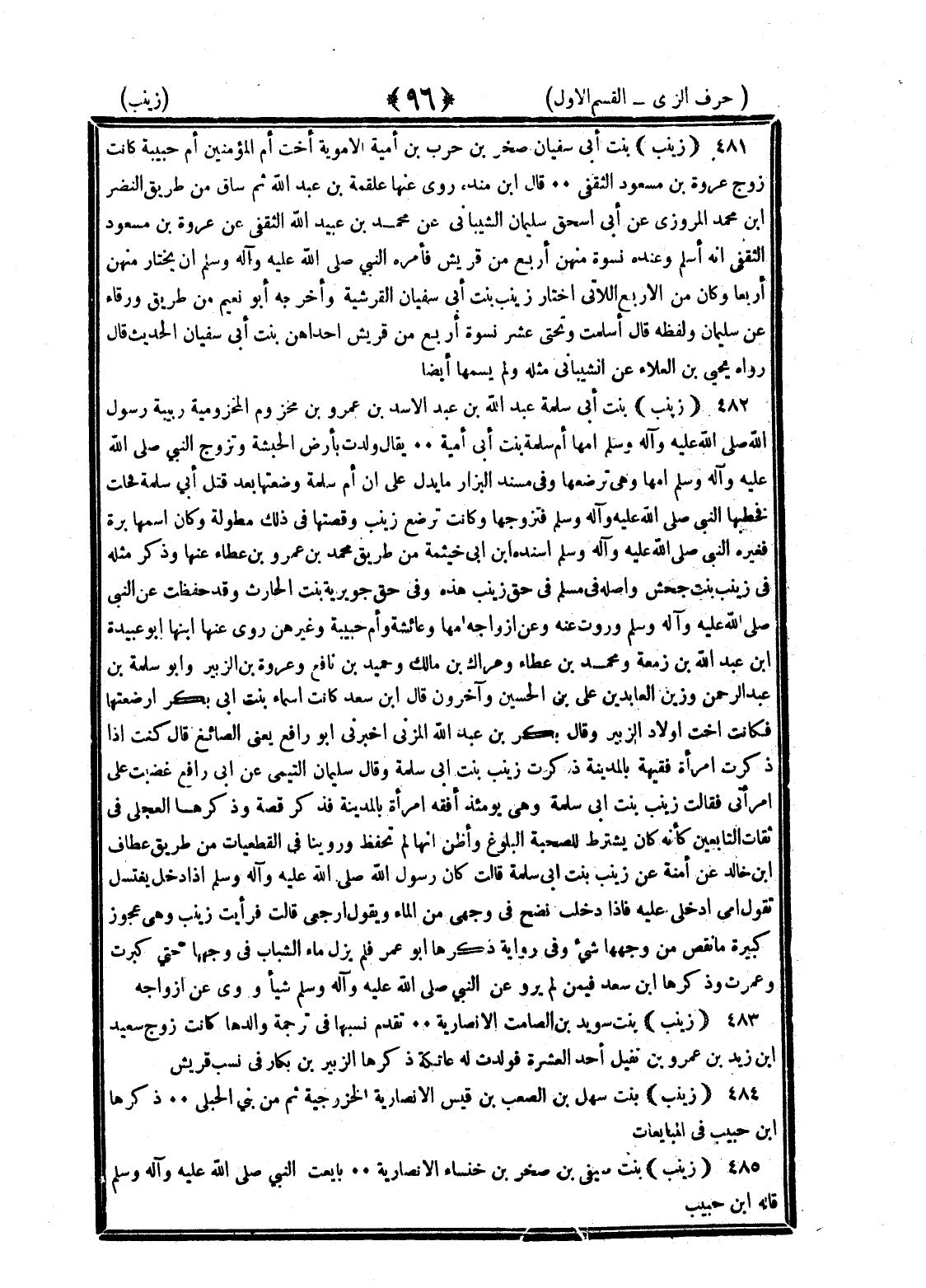 <96> زينب بنت أبي سفيان صخر بن حرب بن أمية الأموية أخت أم المؤمنين أم حبيبة كانت زوج عروة بن مسعود الثقفي قال بن منده روى عنها علقمة بن عبد الله ثم ساق من طريق النضر بن محمد المروزي عن أبي إسحاق سليمان الشيباني عن محمد بن عبيد الله الثقفي عن عروة بن مسعود الثقفي أنه أسلم وعنده نسوة منهن أربع من قريش فأمره النبي صلى الله عليه وسلم أن يختار منهن أربعا وكان من الأربع اللاتي اختار زينب بنت أبي سفيان القرشية وأخرجه أبو نعيم من طريق ورقاء عن سليمان ولفظه قال أسلمت وتحتي عشر نسوة أربع من قريش إحداهن بنت أبي سفيان الحديث قال رواه يحيى بن العلاء عن الشيباني مثله ولم يسمها أيضا زينب بنت أبي سلمة عبد الله بن عبد الأسد بن عمرو بن مخزوم المخزومية ربيبة رسول الله صلى الله عليه وسلم أمها أم سلمة بنت أبي أمية يقال ولدت بأرض الحبشة وتزوج النبي صلى الله عليه وسلم أمها وهي ترضعها وفي مسند البزار ما يدل على أن أم سلمة وضعتها بعد قتل أبي سلمة فخلت فخطبها النبي صلى الله عليه وسلم فتزوجها وكانت ترضع زينب وقصتها في ذلك مطولة وكان اسمها برة فغيره النبي صلى الله عليه وسلم أسنده بن أبي خيثمة من طريق محمد بن عمرو بن عطاء عنها وذكر مثله في زينب بنت جحش وأصله في مسلم في حق زينب هذه وفي حق جويرية بنت الحارث وقد حفظت عن النبي صلى الله عليه وسلم وروت عنه وعن أزواجه أمها وعائشة وأم حبيبة وغيرهن روى عنها ابنها أبو عبيدة بن عبد الله بن زمعة ومحمد بن عطاء وعراك بن مالك وحميد بن نافع وعروة بن الزبير وأبو سلمة بن عبد الرحمن وزين العابدين على بن الحسين وآخرون قال بن سعد كانت أسماء بنت أبي بكر أرضعتها فكانت أخت أولاد الزبير وقال بكر بن عبد الله المزني أخبرني أبو رافع يعني الصائغ قال كنت إذا ذكرت امرأة فقيهة بالمدينة ذكرت زينب بنت أبي سلمة وقال سليمان التيمي عن أبي رافع غضبت على امرأتي فقالت زينب بنت أبي سلمة وهي يومئذ أفقه امرأة بالمدينة فذكر قصة وذكرها العجلي في ثقات التابعين كأنه كان يشترط للصحبة البلوغ وأظن أنها لم تحفظ وروينا في القطعيات من طريق عطاف بن خالد عن أمه عن زينب بنت أبي سلمة قالت كان رسول الله صلى الله عليه وسلم إذا دخل يغتسل تقول أمي ادخلي عليه فإذا دخلت نضح في وجهي من الماء ويقول ارجعي قالت فرأيت زينب وهي عجوز كبيرة ما نقص من وجهها شيء وفي رواية ذكرها أبو عمر فلم يزل ماء الشباب في وجهها حتى كبرت وعمرت وذكرها بن سعد فيمن لم يرو عن النبي صلى الله عليه وسلم شيئا وروى عن أزواجه زينب بنت سويد بن الصامت الأنصارية تقدم نسبها في ترجمة والدها كانت زوج سعيد بن زيد بن عمرو بن نفيل أحد العشرة فولدت له عاتكة ذكرها الزبير بن بكار في نسبة قريش زينب بنت سهل بن مصعب بن قيس الأنصارية الخزرجية ثم من بني الحبلى ذكرها بن حبيب في المبايعات زينب بنت صيفي بن صخر بن خنساء الأنصارية بايعت النبي صلى الله عليه وسلم قاله بن حبيب §