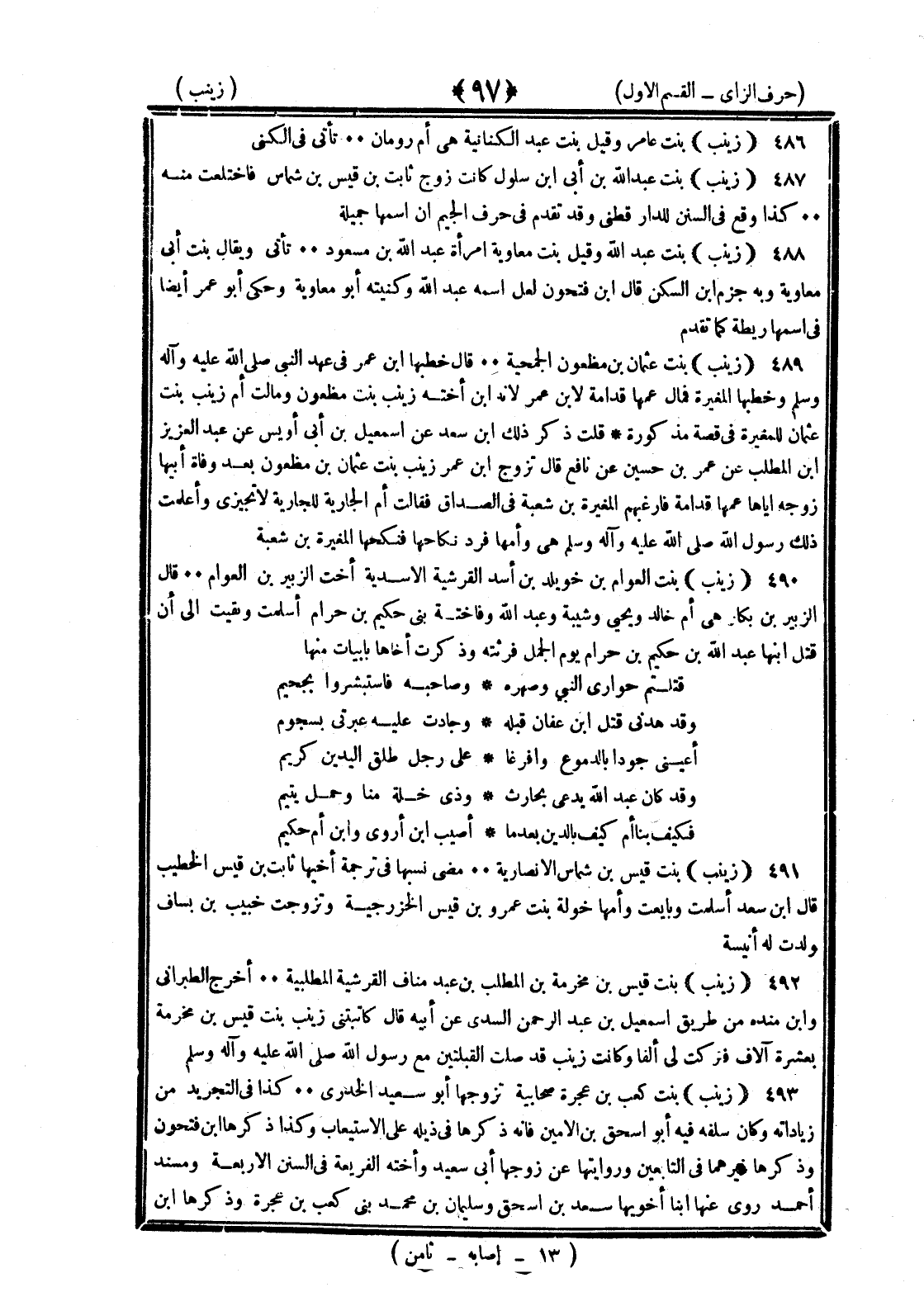 <97> زينب بنت عامر وقيل بنت عبد الكنانية هي أم رومان تأتي في الكنى زينب بنت عبد الله بن أبي بن سلول كانت زوج ثابت بن قيس بن شماس فاختلعت منه كذا وقع في السنن للدارقطني وقد تقدم في حرف الجيم أن اسمها جميلة زينب بنت عبد الله وقيل بنت معاوية امرأة عبد الله بن مسعود تأتي ويقال بنت أبي معاوية وبه حزم بن السكن قال بن فتحون لعل اسمه عبد الله وكنيته أبو معاوية وحكى أبو عمر أيضا في اسمها ريطة كما تقدم زينب بنت عثمان بن مظعون الجمحية قال خطبها بن عمر في عهد النبي صلى الله عليه وسلم وخطبها المغيرة فمال عمها قدامة لابن عمر لأنه بن أخت زينب بنت مظعون ومالت أم زينب بنت عثمان للمغيرة في قصة مذكورة قلت ذكر ذلك بن سعد عن إسماعيل بن أبي أويس عن عبد العزيز بن المطلب عن عمر بن حسين عن نافع قال تزوج بن عمر زينب بنت عثمان بن مظعون بعد وفاة أبيها زوجه إياها عمها قدامة فأرغبهم المغيرة بن شعبة في الصداق فقالت أم الجارية للجارية لا تجيزي وأعلمت ذلك رسول الله صلى الله عليه وسلم هي وأمها فرد نكاحها فنكحها المغيرة بن شعبة زينب بنت العوام بن خويلد بن أسد القرشية الأسدية أخت الزبير بن العوام قال الزبير بن بكار هي أم خالد ويحيى وشيبة وعبد الله وفاختة بنت حكيم بن حرام أسلمت وبقيت إلى أن قتل ابنها عبد الله بن حكيم بن حرام يوم الجمل فرثته وذكرت أخاها بأبيات منها قتلتم حواري النبي وصهره وصاحبه فاستبشروا بجحيم وقد هدني قتل بن عفان قبله وجادت عليه عبرتي بسجوم أعيني جودا بالدموع وأفرغا على رجل طلق اليدين كريم وقد كان عبد الله يدعى بحارث وذي خلة منا وحمل يتيم فكيف بنا أم كيف بالدين بعدما أصيب بن أروى وابن أم حكيم زينب بنت قيس بن شماس الأنصارية مضى نسبها في ترجمة أخيها ثابت بن قيس بن الخطيم قال بن سعد أسلمت وبايعت وأمها خولة بنت عمرو بن قيس الخزرجية وتزوجت خبيب بن يساف فولدت له أنيسة زينب بنت قيس بن مخرمة بن عبد مناف القرشية المطلبية أخرج الطبراني وابن منده من طريق إسماعيل بن عبد الرحمن السدي عن أبيه قال كاتبتني زينب بنت قيس بن مخرمة بعشرة آلاف فتركت لي ألفا وكانت زينب قد صلت القبلتين مع رسول الله صلى الله عليه وسلم زينب بنت كعب بن عجرة صحابية تزوجها أبو سعيد الخدري كذا في التجريد من زياداته وكان سلفه فيه أبو إسحاق بن الأمين فإنه ذكرها في ذيله على الاستيعاب وكذا ذكرها بن فتحون وذكرها غيرهما في التابعين وروايتها عن زوجها أبي سعيد وأخته الفريعة في السنن الأربعة ومسند أحمد روى عنها ابنا أخويها سعد بن إسحاق وسليمان بن محمد ابنا كعب بن عجرة وذكرها بن §