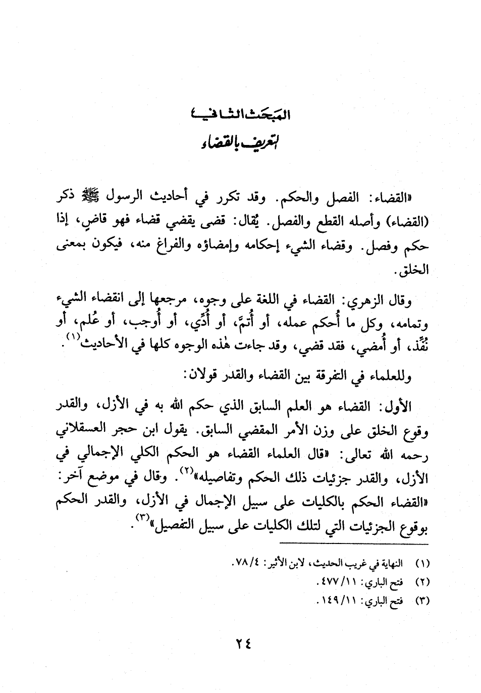 " القضاء: الفصل والحكم. وقد تكرر في أحاديث الرسول صلى الله عليه وسلم ذكر (القضاء) وأصله القطع والفصل. يُقال: قضى يقضي قضاء فهو قاضٍ، إذا حكم وفصل. وقضاء الشيء إحكامه وإمضاؤه والفراغ منه، فيكون بمعنى الخلق.
