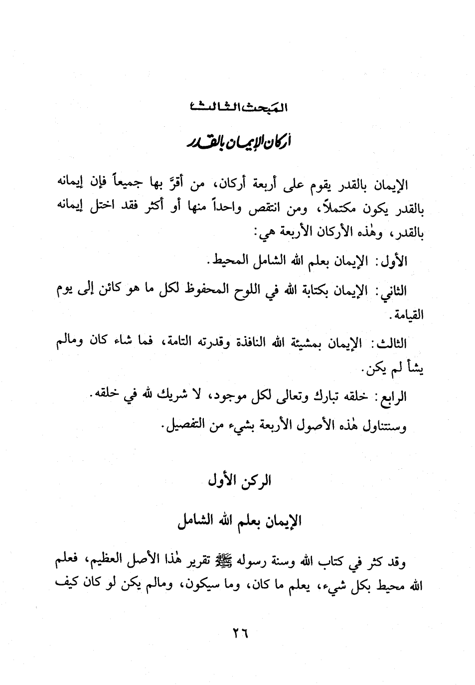 الإيمان بالقدر يقوم على أربعة أركان، من أقرَّ بها جميعاً فإن إيمانه بالقدر يكون مكتملاً، ومن انتقص واحداً منها أو أكثر فقد اختل إيمانه بالقدر، وهذه الأركان الأربعة هي: