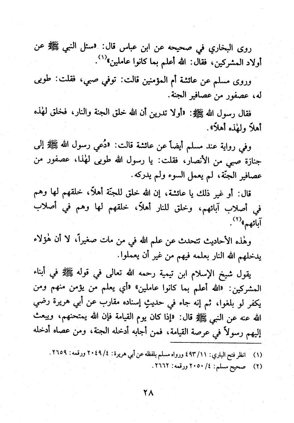 يقول شيخ الإسلام ابن تيمية رحمه الله تعالى في قوله صلى الله عليه وسلم في أبناء المشركين: " الله أعلم بما كانوا عاملين " " أي يعلم من يؤمن منهم ومن يكفر لو بلغوا، ثم إنه جاء في حديث إسناده مقارب عن أبي هريرة رضي الله عنه عن النبي صلى الله عليه وسلم قال: " إذا كان يوم القيامة فإن الله يمتحنهم، ويبعث إليهم رسولاً في عرصة القيامة، فمن أجابه أدخله الجنة، ومن عصاه أدخله
