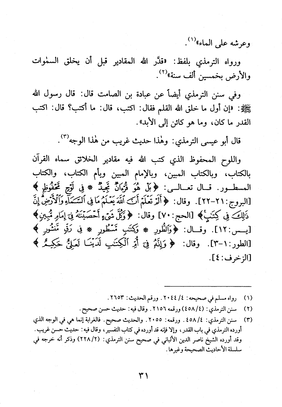 (¬3) سنن الترمذي: 4/458 ورقمه: 2055 والحديث صحيح. فالغرابة إنما هي في الوجه الذي أورده الترمذي في باب القدر، وإلا فإنه قد أورده في كتاب التفسير، وقال فيه: حديث حسن غريب. وقد أورده الشيخ ناصر الدين الألباني في صحيح سنن الترمذي: (2/228) وذكر أنه خرجه في سلسلة الأحاديث الصحيحة وغيرها.