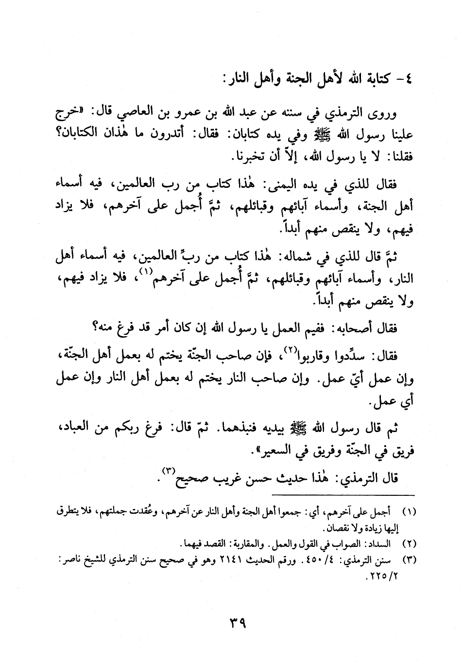 وروى الترمذي في سننه عن عبد الله بن عمرو بن العاص قال: " خرج علينا رسول الله صلى الله عليه وسلم وفي يده كتابان: فقال: أتدرون ما هذان الكتابان؟ فقلنا: لا يا رسول الله، إلا أن تخبرنا.