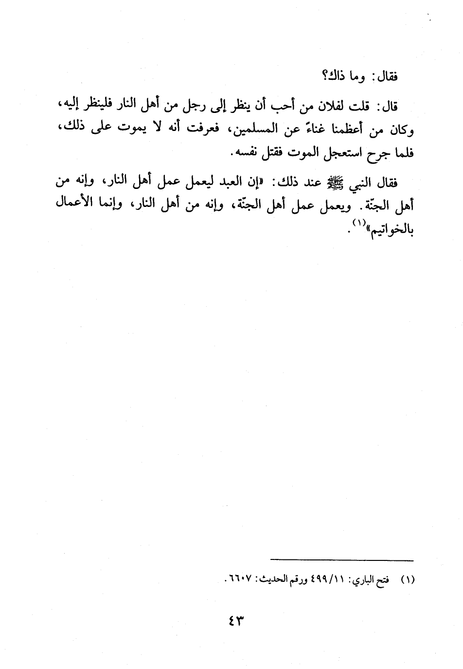قال: قلت لفلان من أحب أن ينظر إلى رجل من أهل النار فلينظر إليه، وكان من أعظمنا غناء عن المسلمين، فعرفت أنه لا يموت على ذلك، فلما جرح استعجل الموت فقتل نفسه.